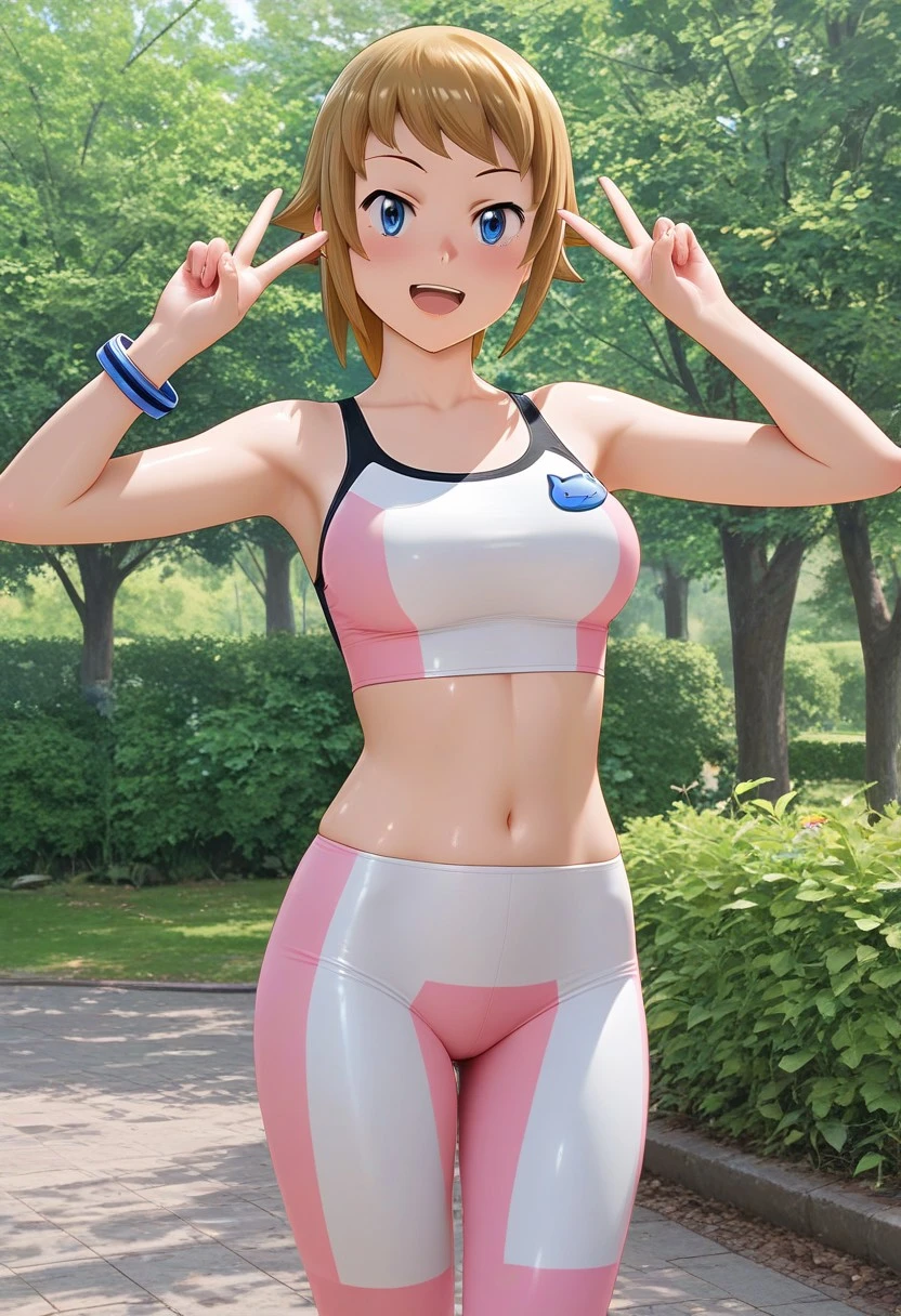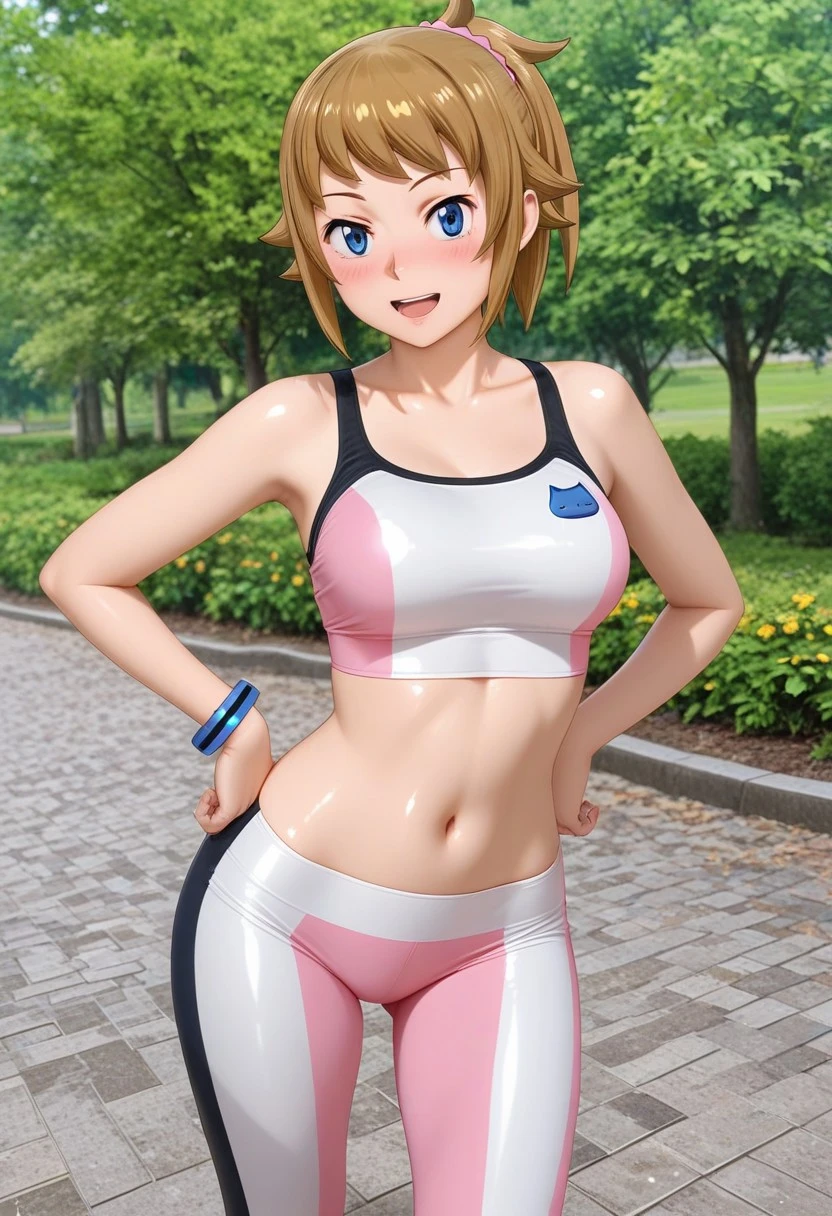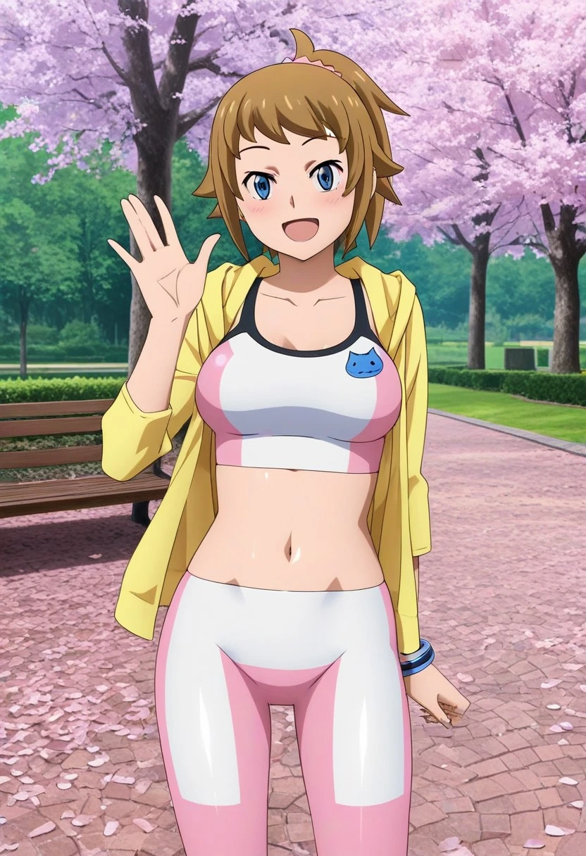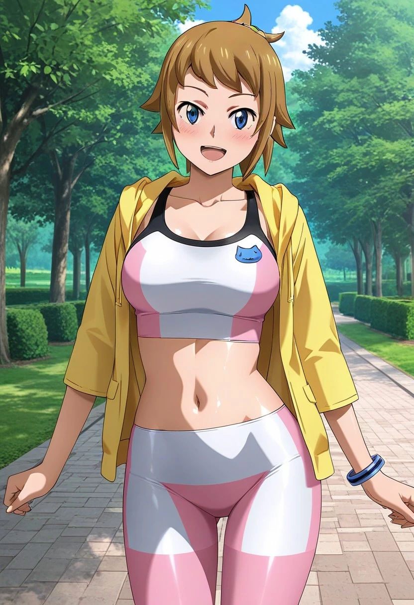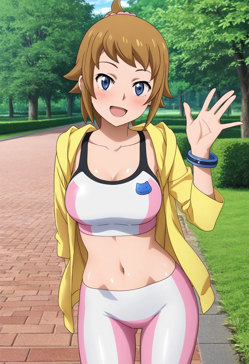 hoshino fumina,brown hair,short ponytail,blue eyes,pink sports bra,striped sports bra,blue cat applique,midriff,navel,pink short leggings,striped short leggings,,yellow jacket,long sleeves,single blue bracelet,pink socks,two-tone shoes,black shoes,white shoes