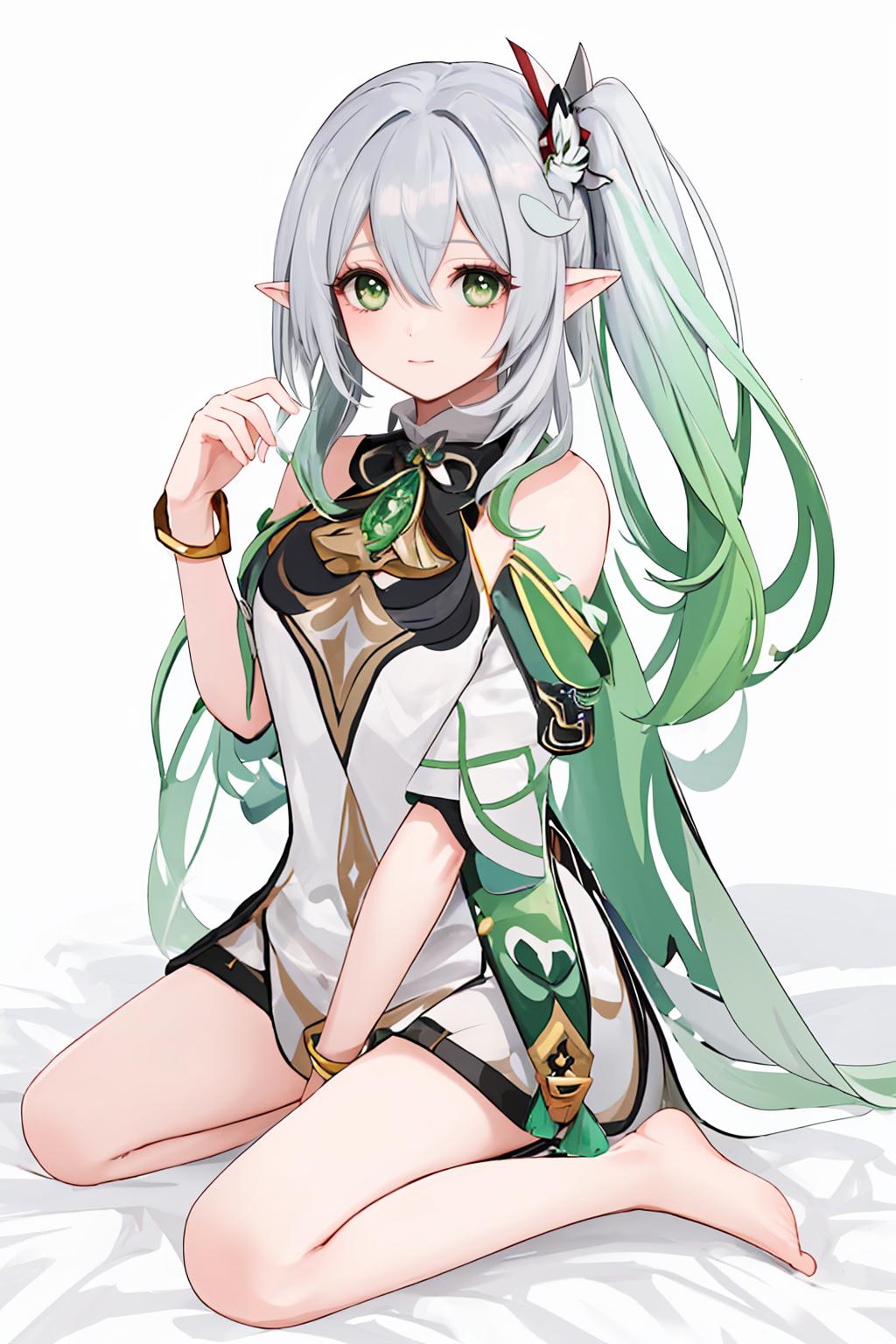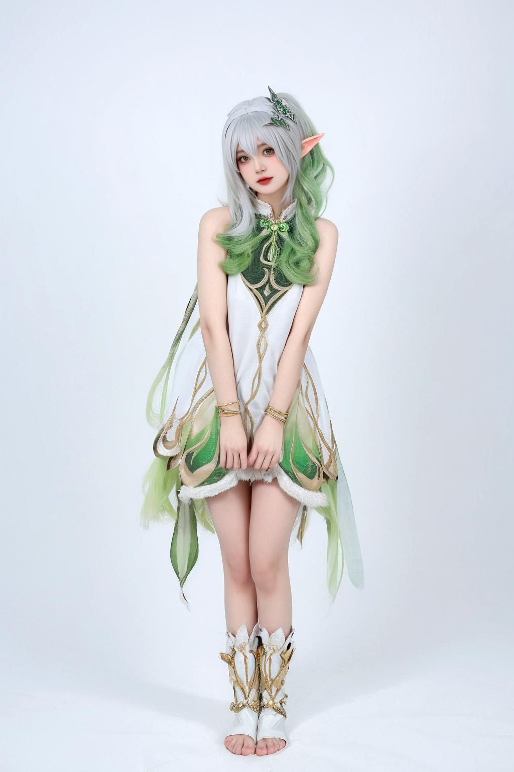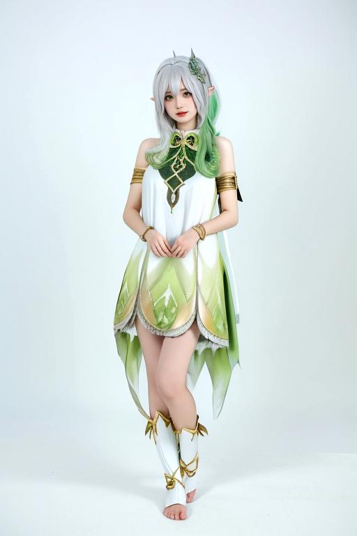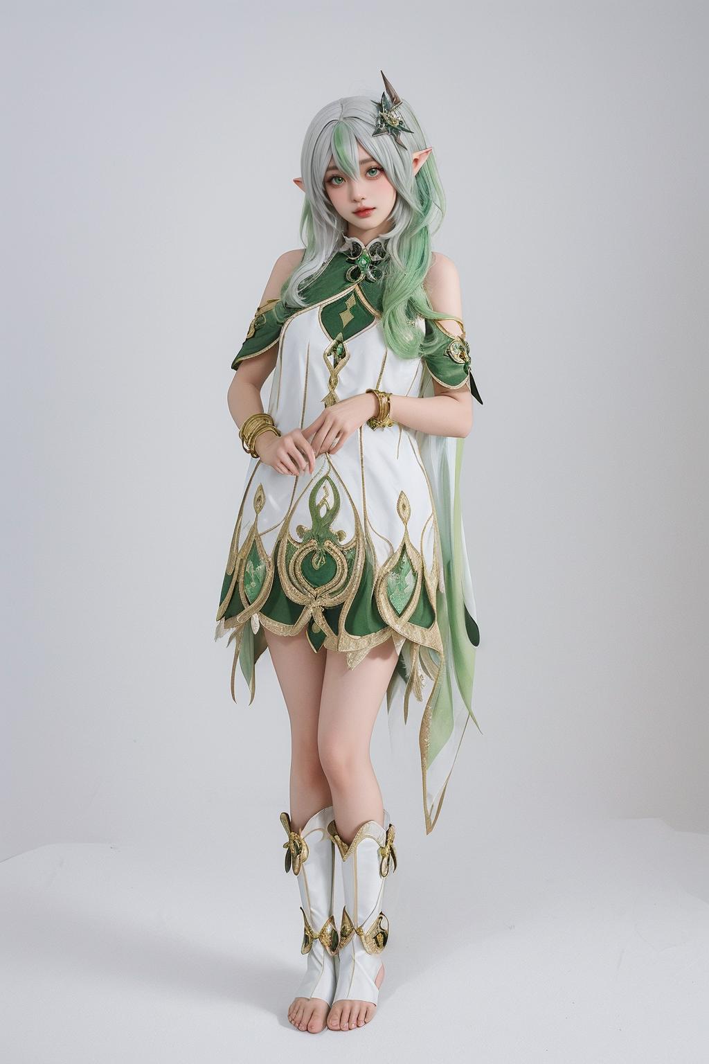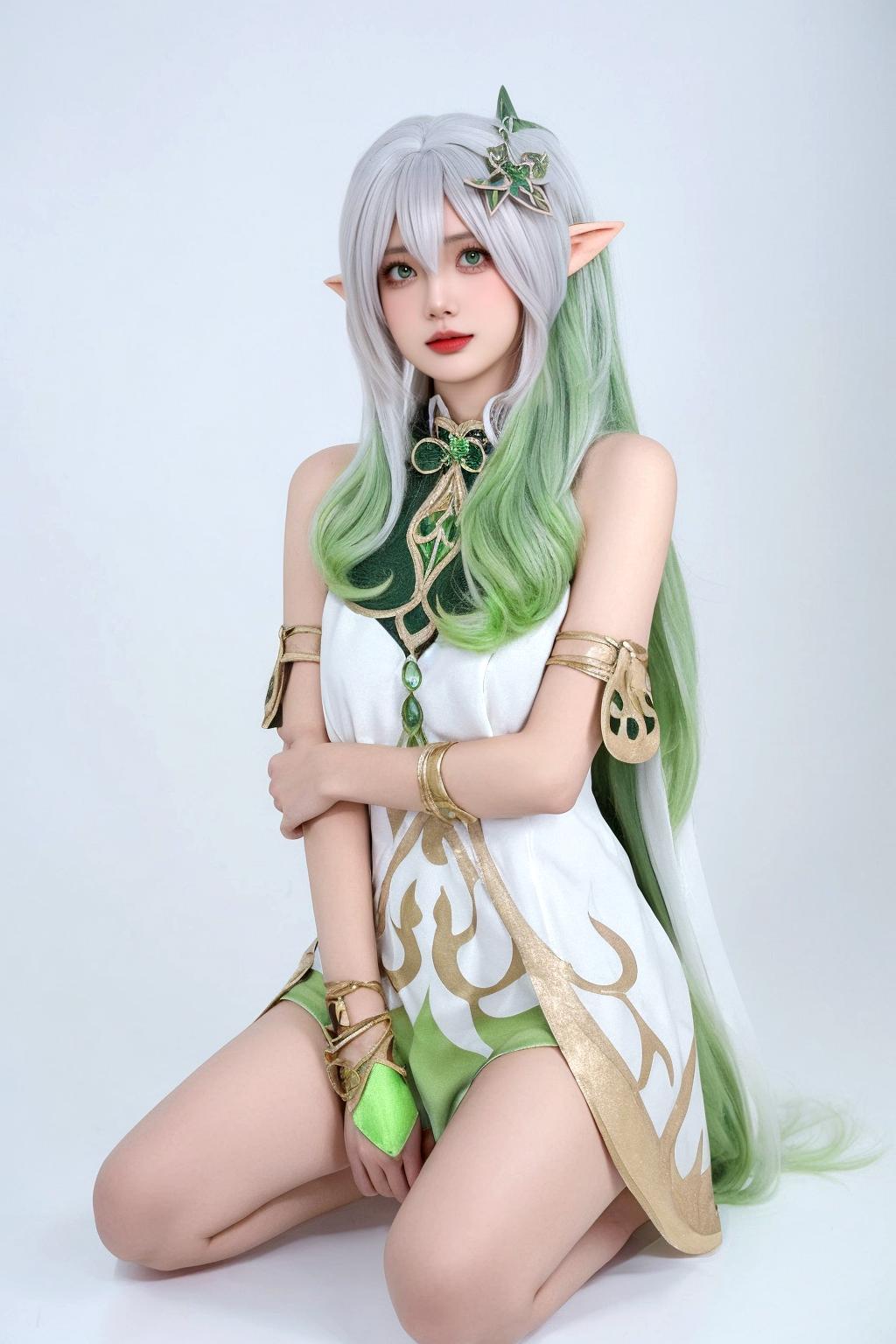 关键词:Nahida,1girl,nahida \(genshin impact\),pointy ears,solo,cosplay,green eyes,cosplay costumes,dress,multicolored hair,jewelry,white hair,bracelet,green hair,gradient hair,hair ornament,long hair,bangs,side ponytail,cross-shaped pupils,closed mouth,looking at viewer,realistic,hair between eyes,bare shoulders,toeless legwear,no shoes,