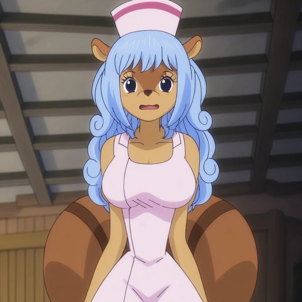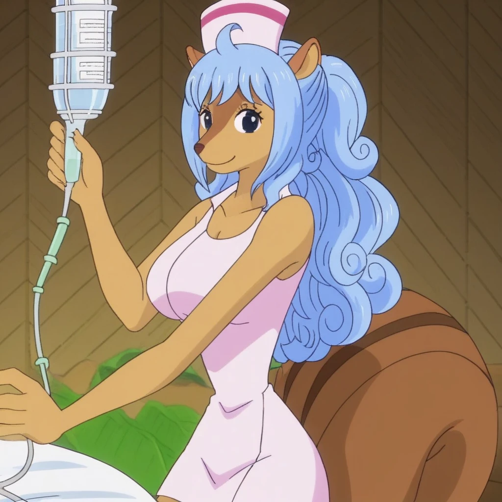 tags: tristan, light blue hair, tan fur, light pink nurse minidress, light pink nurse cap, large brown tail