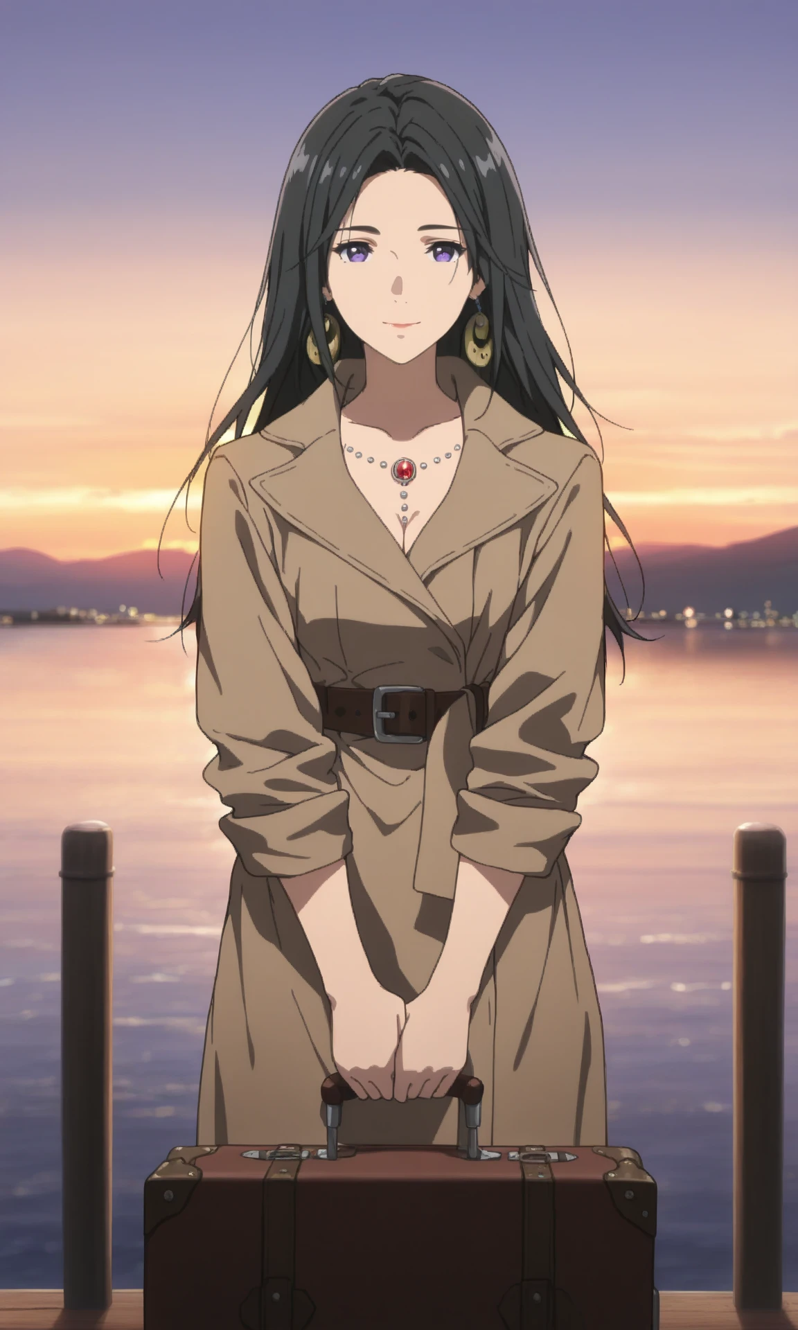 cattleyacoat, brown coat, cleavage, red gemstone, necklace, belt,