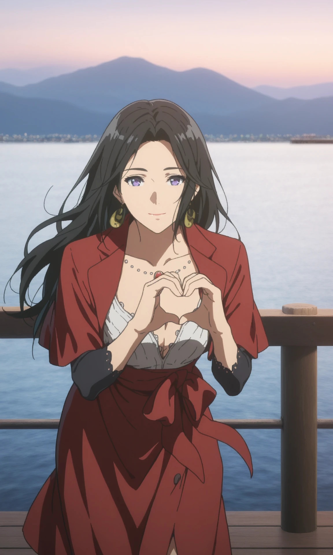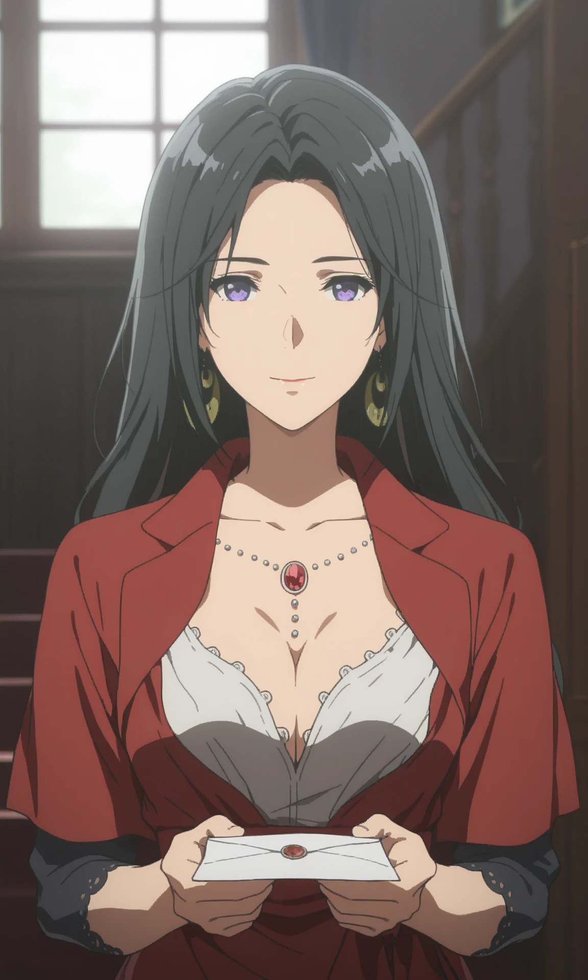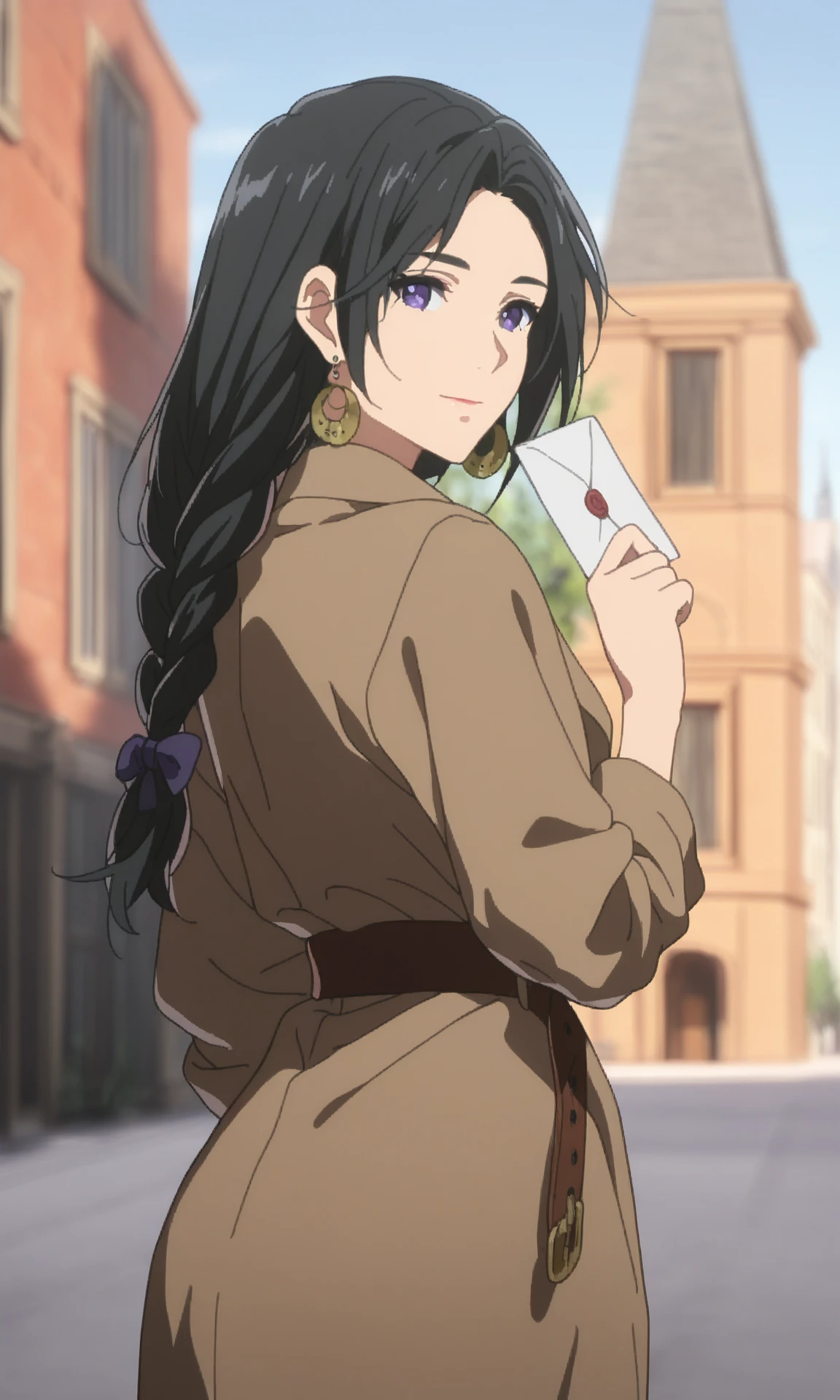 cattleyamv, 1girl, solo, long hair, black hair, purple eyes, crescent earrings,