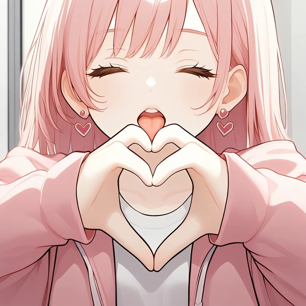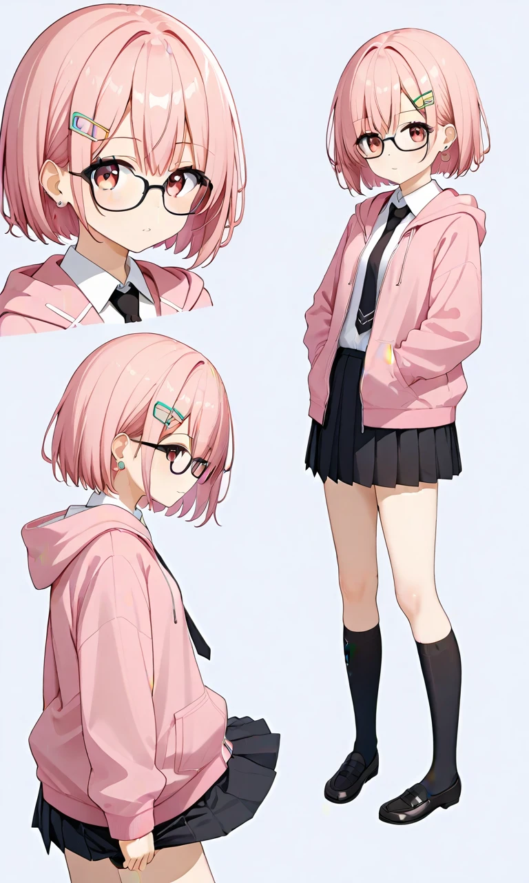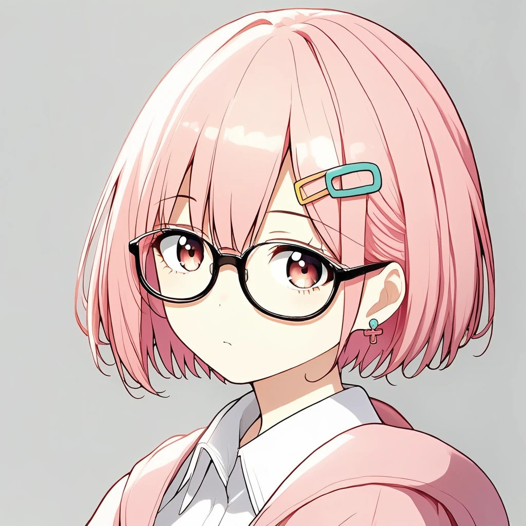 akane,pink short hair,hair ornament, black-framed eyewear, earrings,