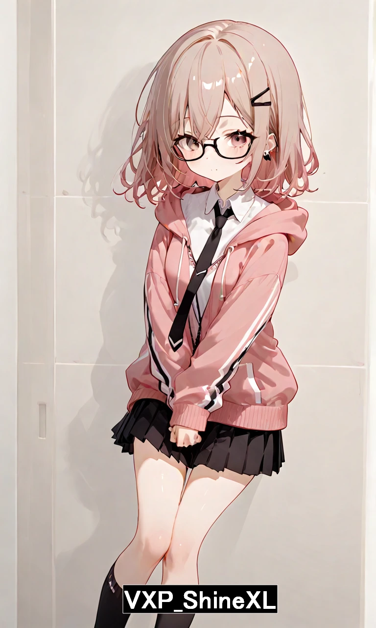,long sleeves, hood down, pink jacket, hoodie, black necktie, collared shirt,pleated skirt, kneehighs black skirt socks,