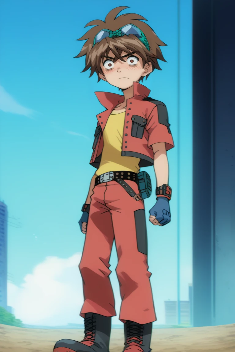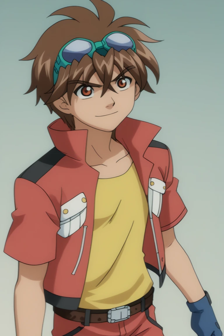 1.- dan_kuso, brown hair, brown eyes, red short sleeves jacket, yellow shirt, blue fingerless gloves, red pants, goggles on head,