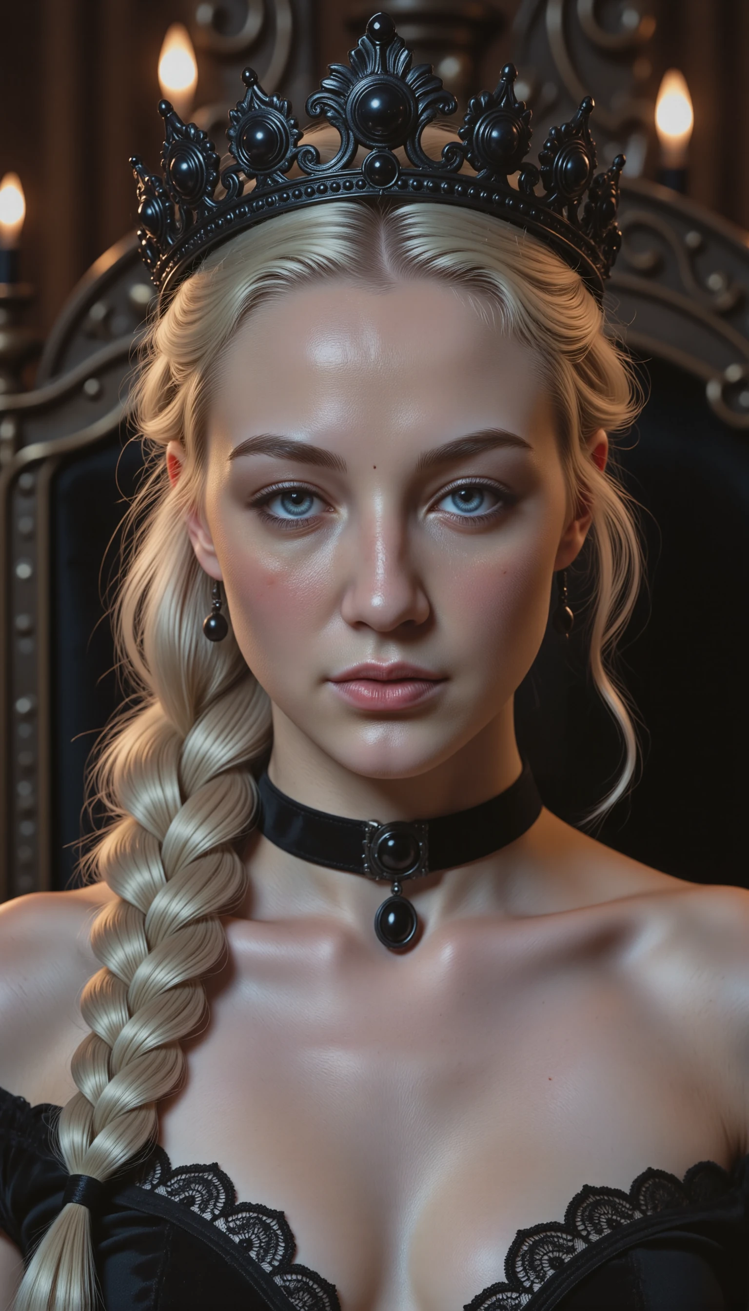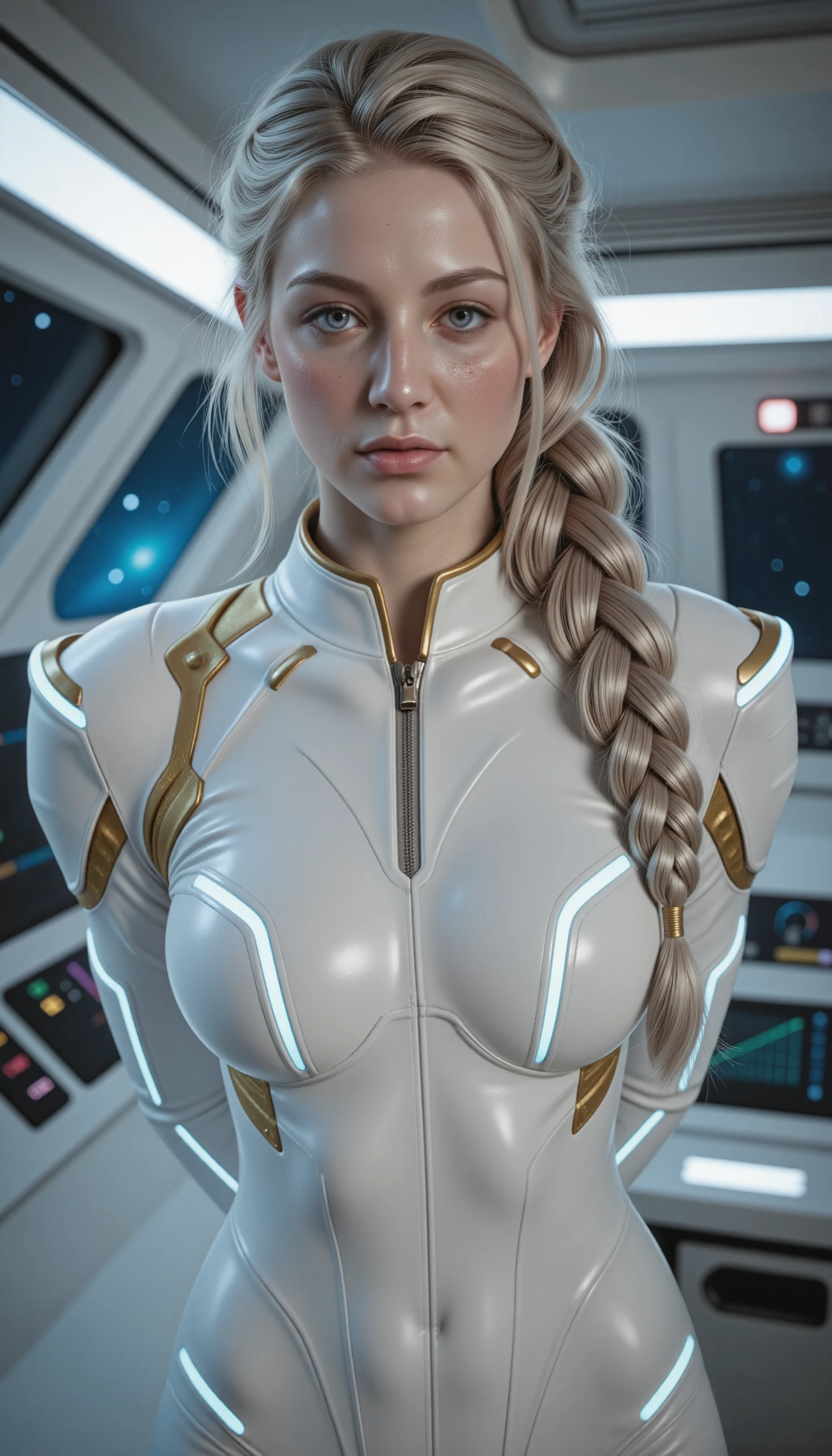 Trigger: Sora0Veda Model-DNA: Sora0Veda, striking scandinavian appearance, long thick ash-blonde side braid, prominent aquiline nose, ice-blue eyes, highly defined athletic physique.