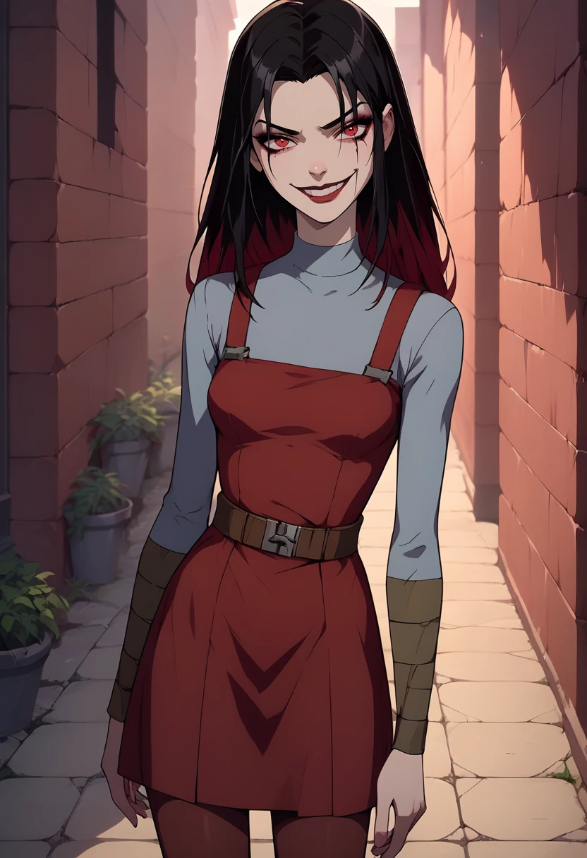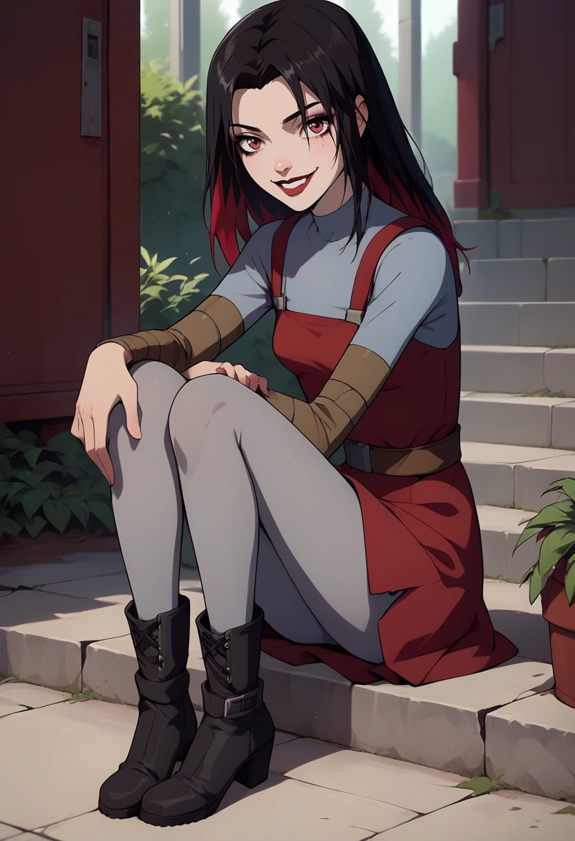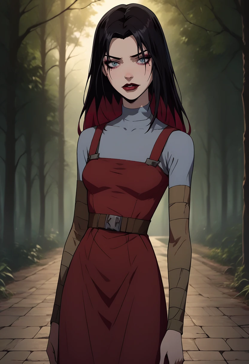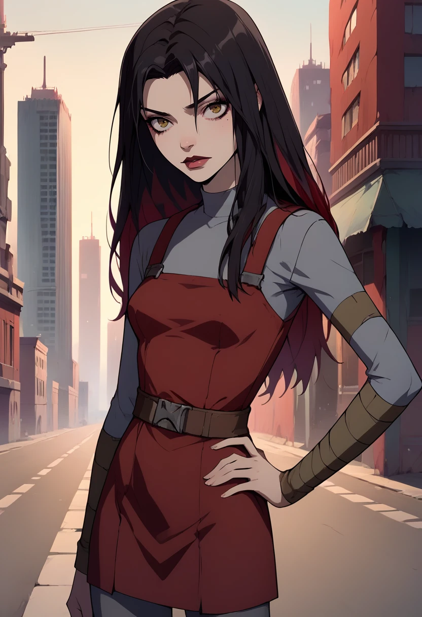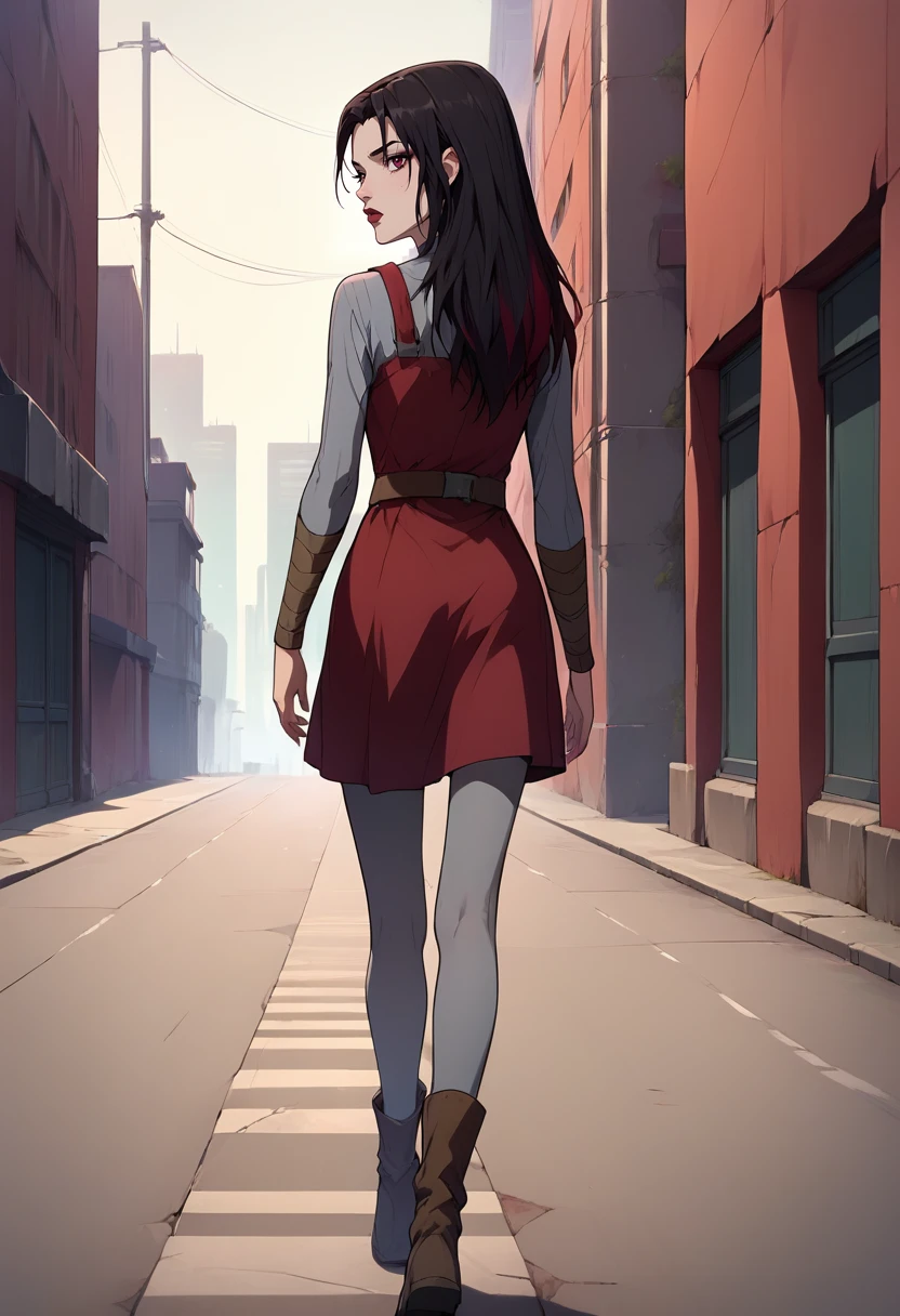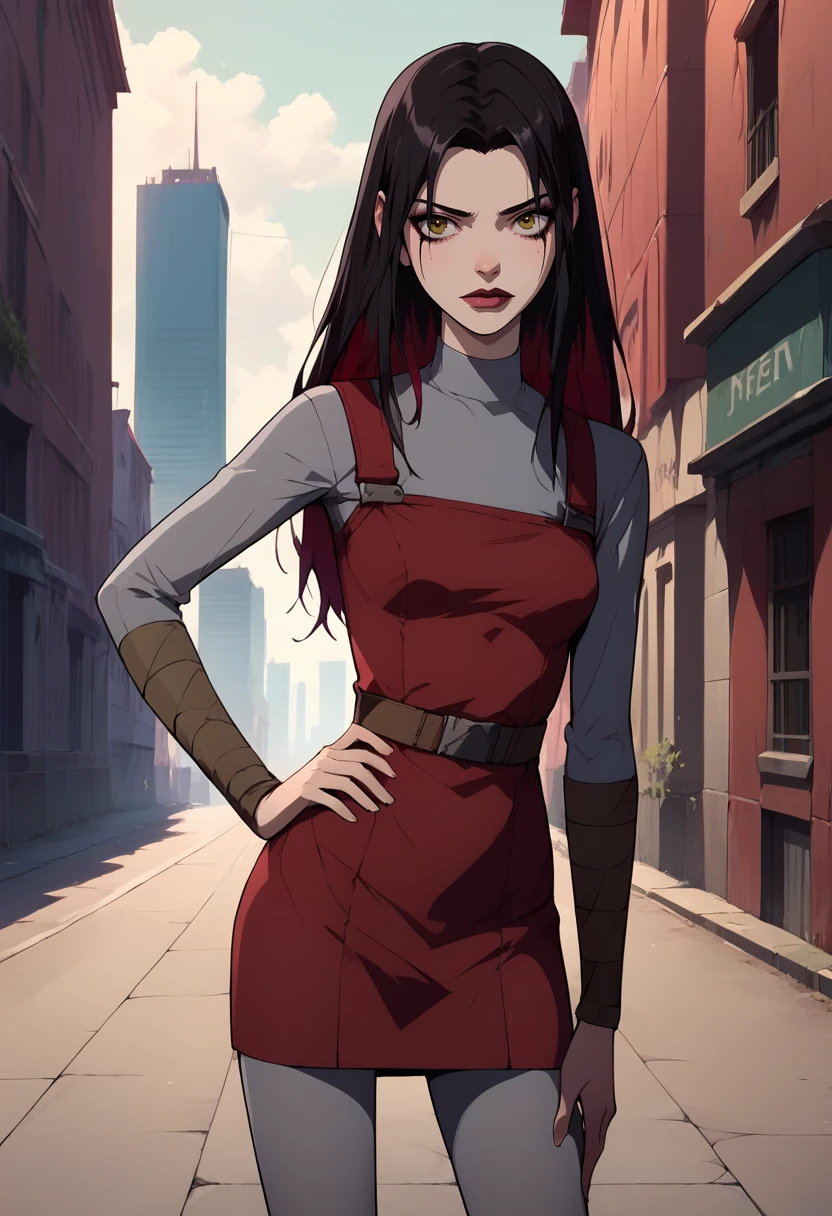 Trigger word: circe Principal tags: short dress, two-tone hair, makeup, black hair, grey pantyhose, brown eyes, city, grey sleeves, long hair
