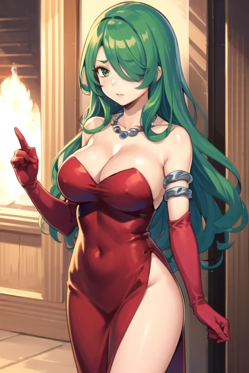 ReinaRave, 1girl, solo, very long hair, large breasts, elbow gloves, red dress, cleavage, bare shoulders, jewelry, green eyes, green hair, necklace, hair over one eye, strapless, armlet, red gloves
