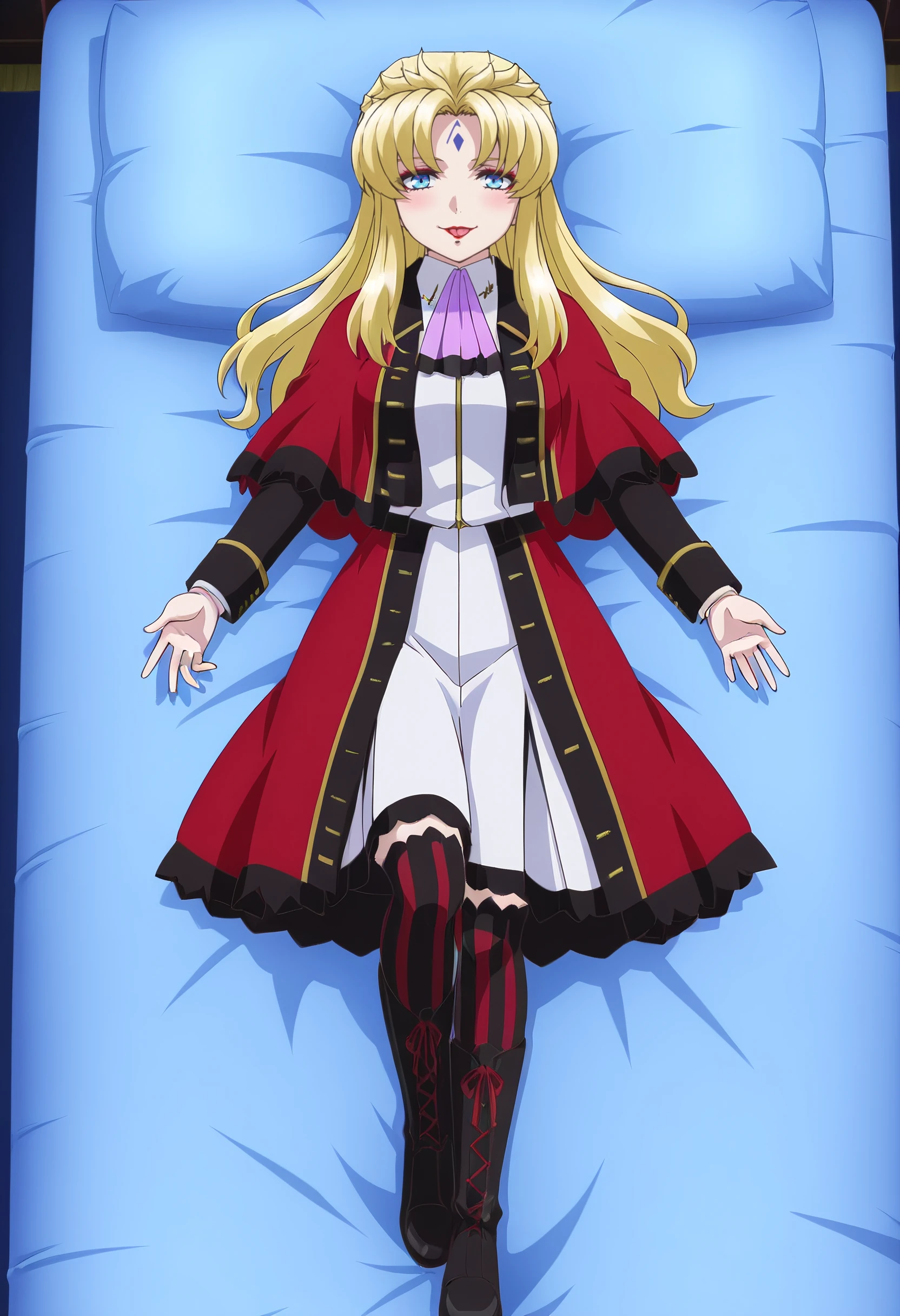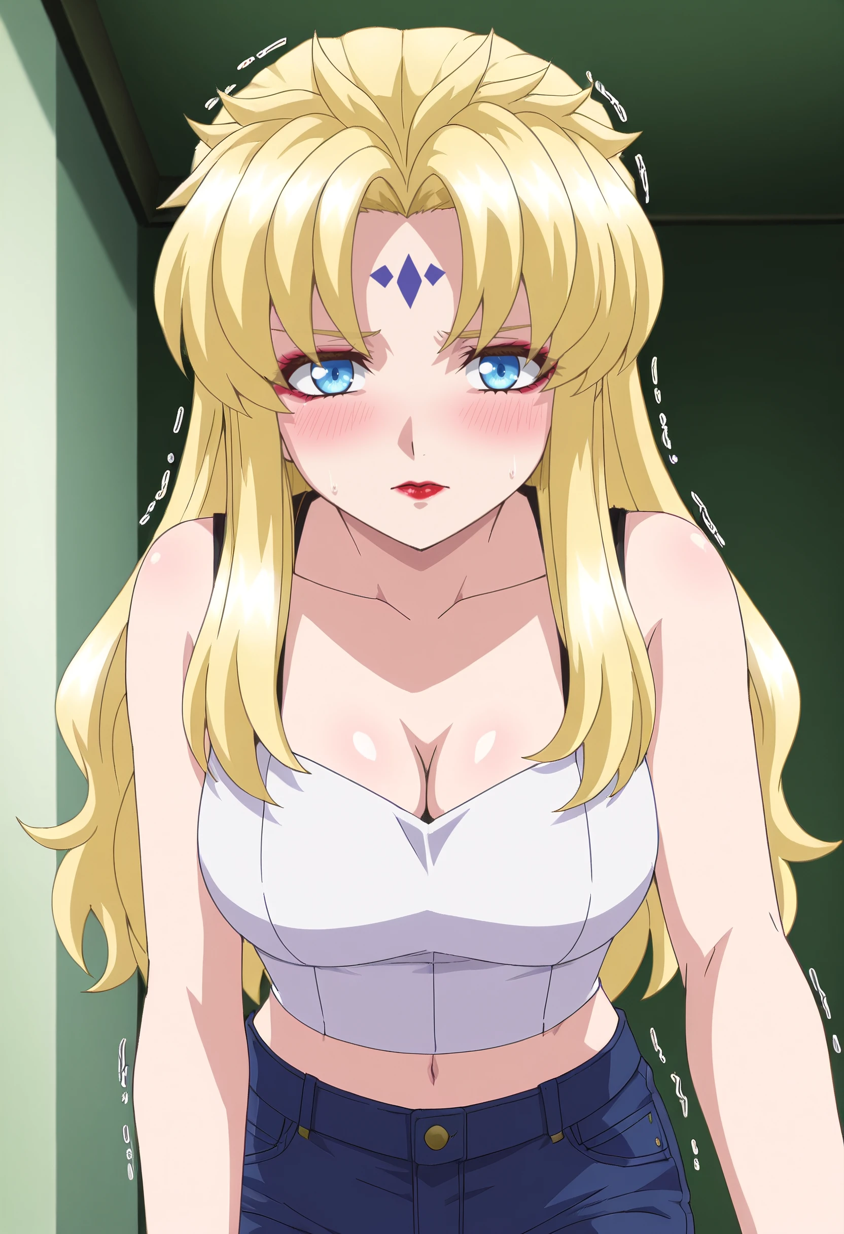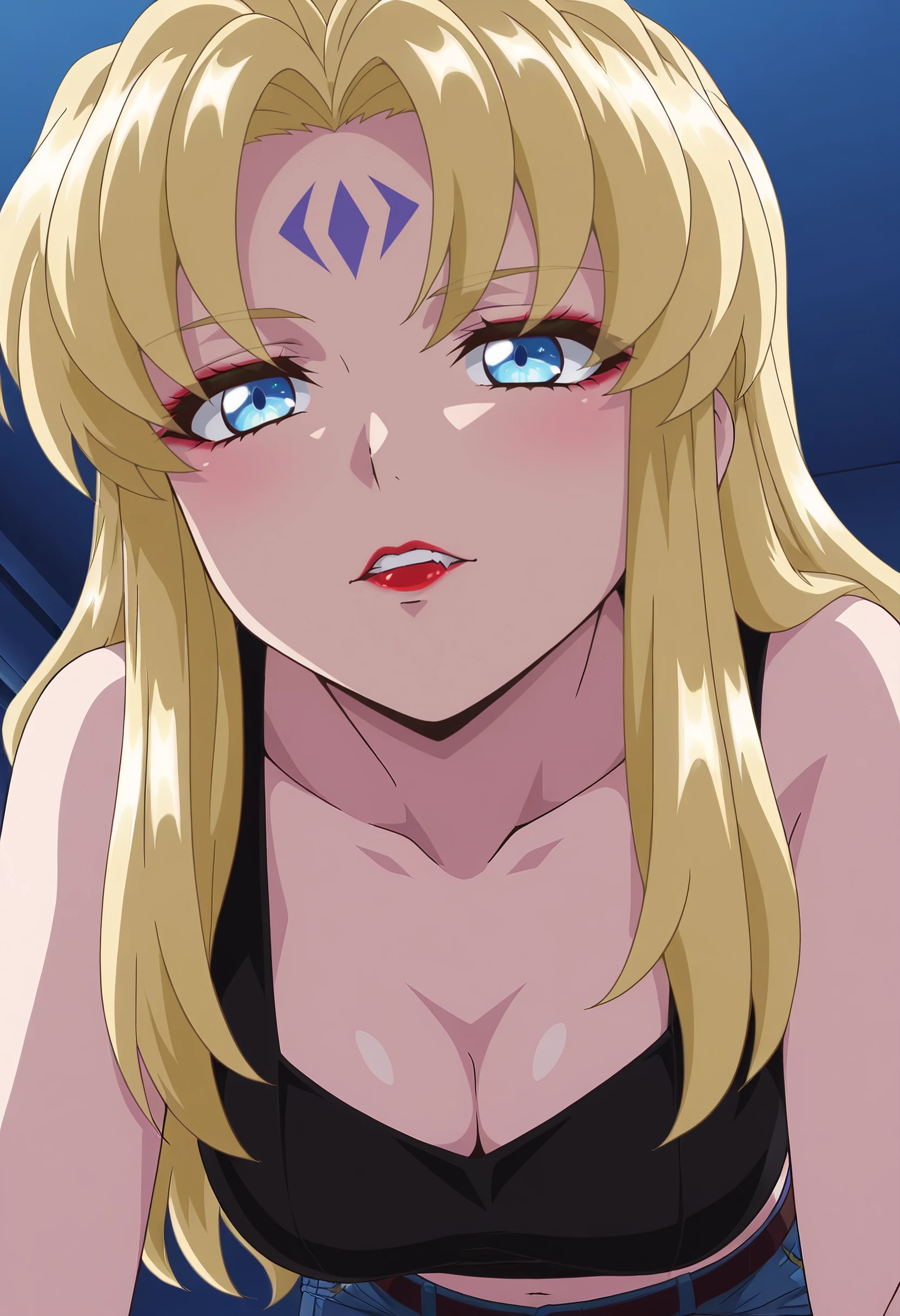 KSGAura, blonde hair, long hair, blue eyes, facial mark, bangs, parted bangs, lipstick, makeup, forehead mark, red lips,