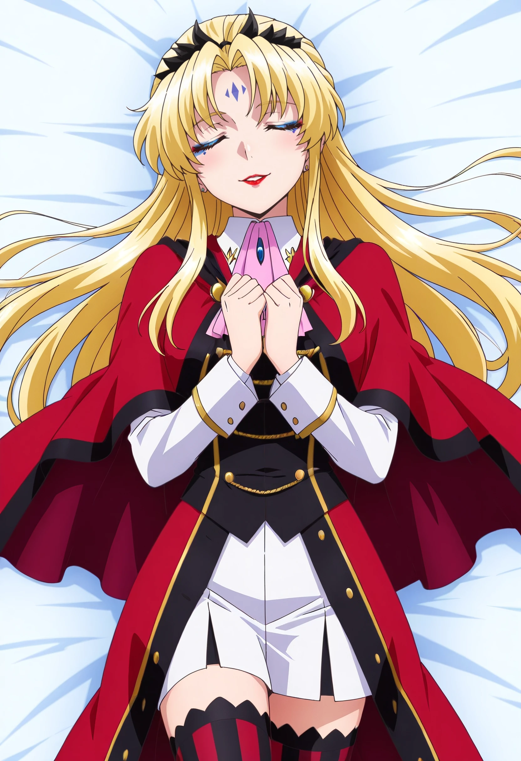ascot, long sleeves, cape, boots, thighhighs, skirt, bow, black legwear, circlet, striped legwear, capelet, crescent, red cape, jewelry, vertical stripes,