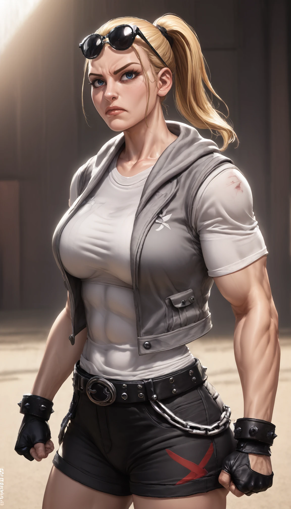 PONY Use these triggers for Sketch Turner: Sketch Turner, blonde hair, ponytail, fingerless gloves, white t-shirt, gray vest, black shorts, sunglasses, muscular body, face jaw, hood, white laces, belt, red x, shaved temples, shorts chain, blue eyes