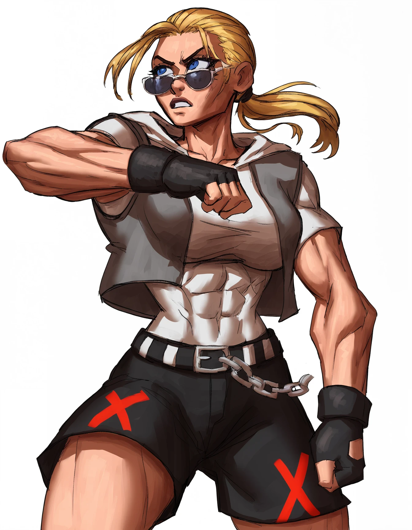 Illustrious Use these triggers for Sketch: Ske_Tu, 1boy, solo, muscular body, blue eyes, sunglasses, blonde hair, shaved temples, ponytail, white hoodie, buttons, rolled up sleeves, grey vest, assymetrical bracer, leather bracer, fingerless gloves, black shorts, belt, shorts chain, boots,
