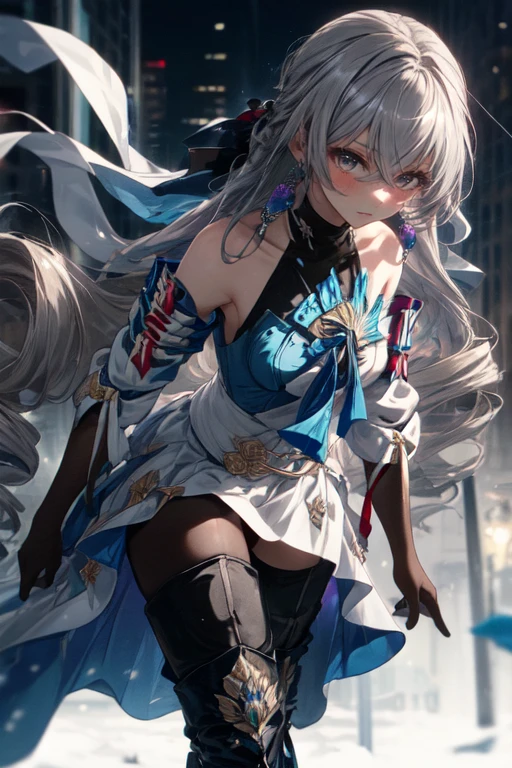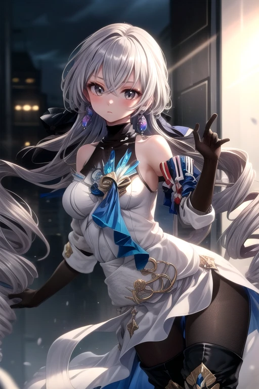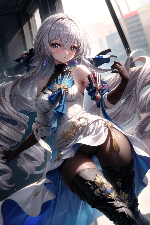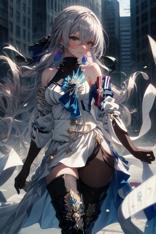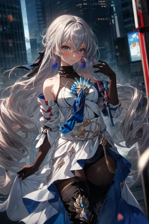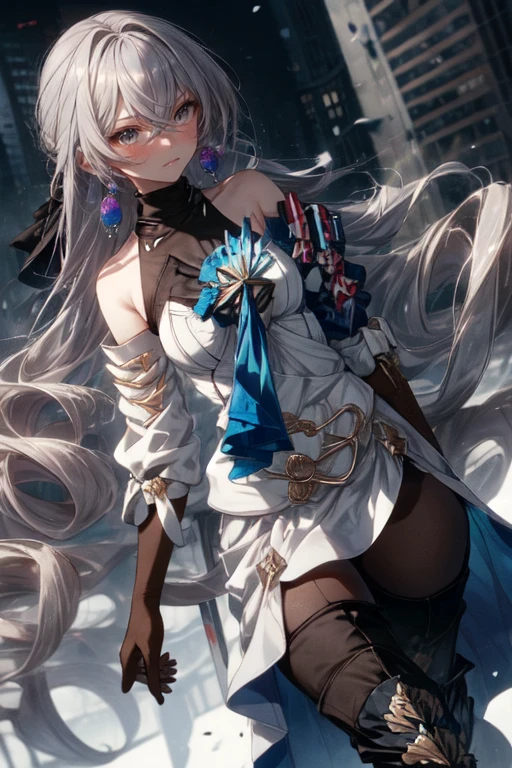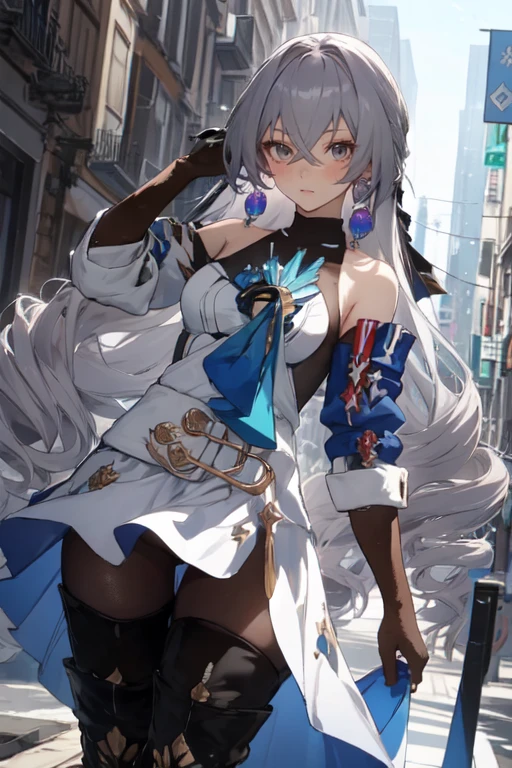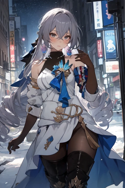 1girl,long hair,grey hair,jewelry,earrings,grey eyes,bronya zaychik,solo,bare shoulders,looking at viewer,gloves,dress,hair between eyes,black gloves,drill hair,closed mouth,white dress,elbow gloves,pantyhose,thighhighs,city background,blush,twin drills,boots,thigh boots,black footwear,very long hair,sleeveless,detached sleeves,crossed bangs,black pantyhose,brown gloves,Standing