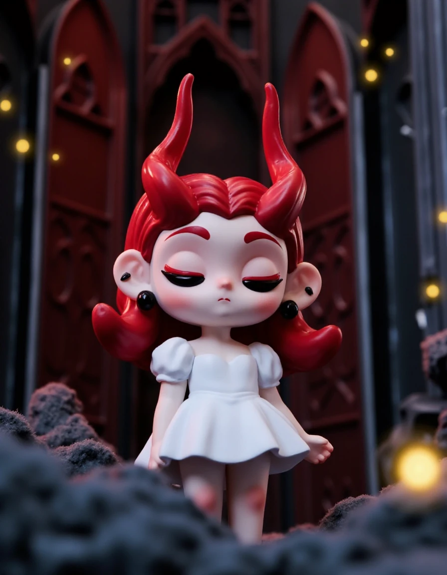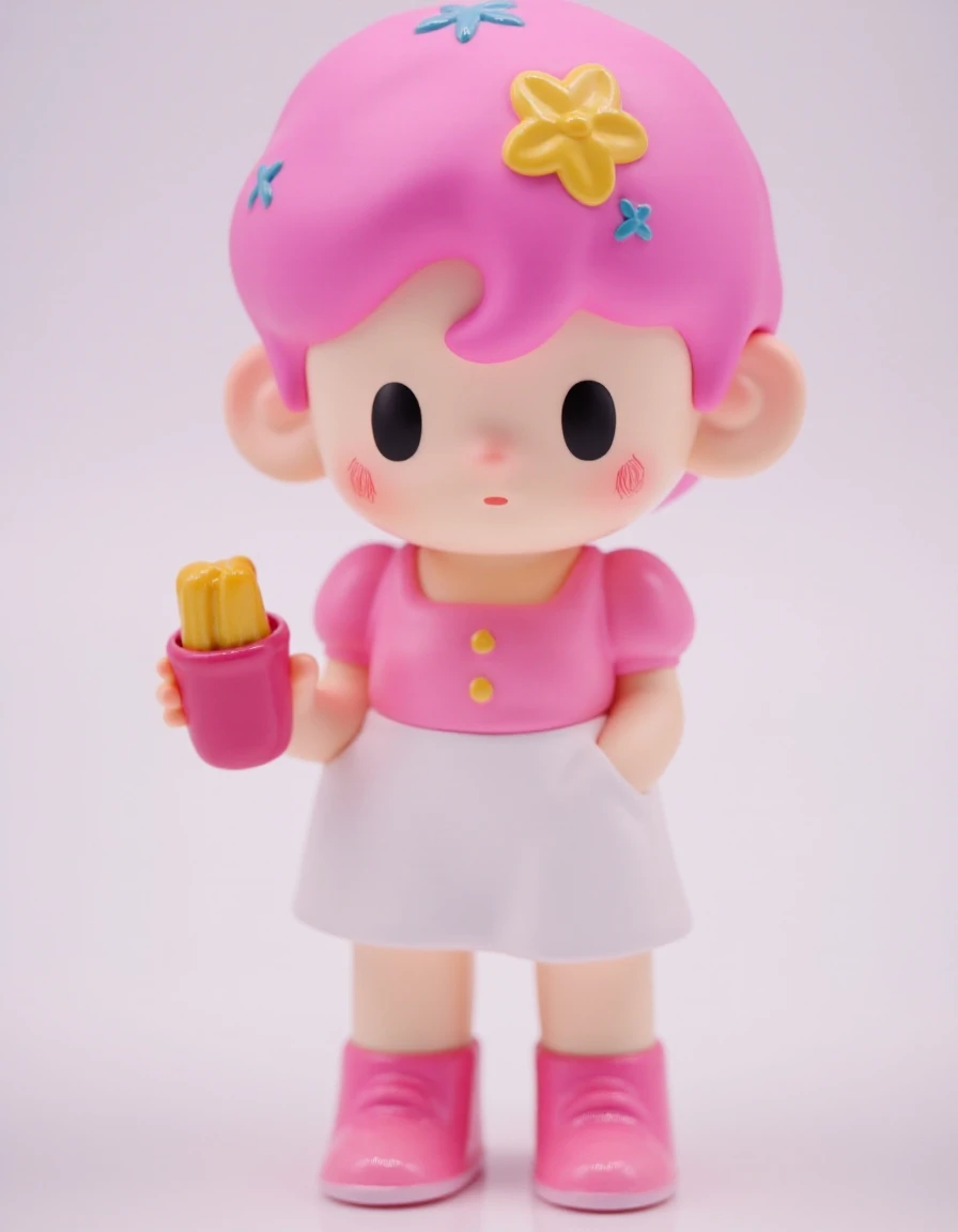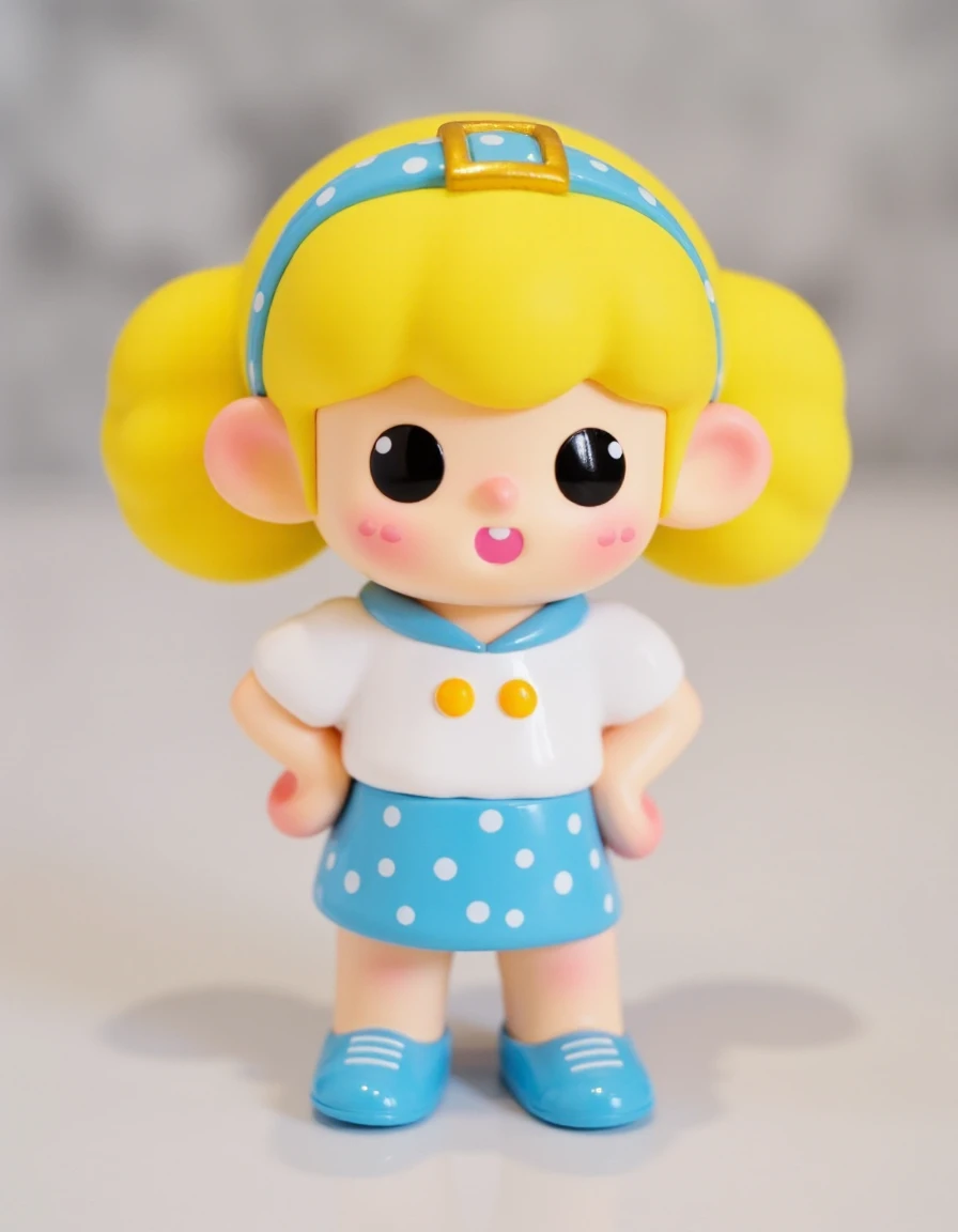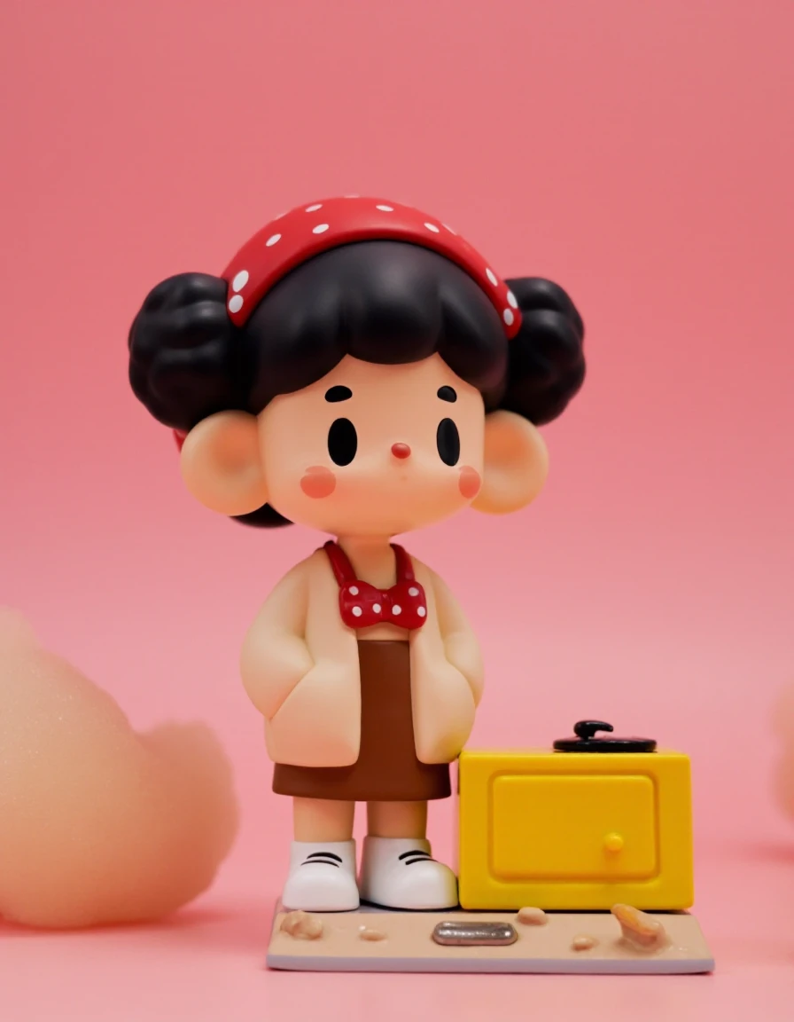 popmart, blindbox, A girl with black hair and a red polka-dot headscarf stands near an oven <lora:blindbox_flux_lora_v2:1>