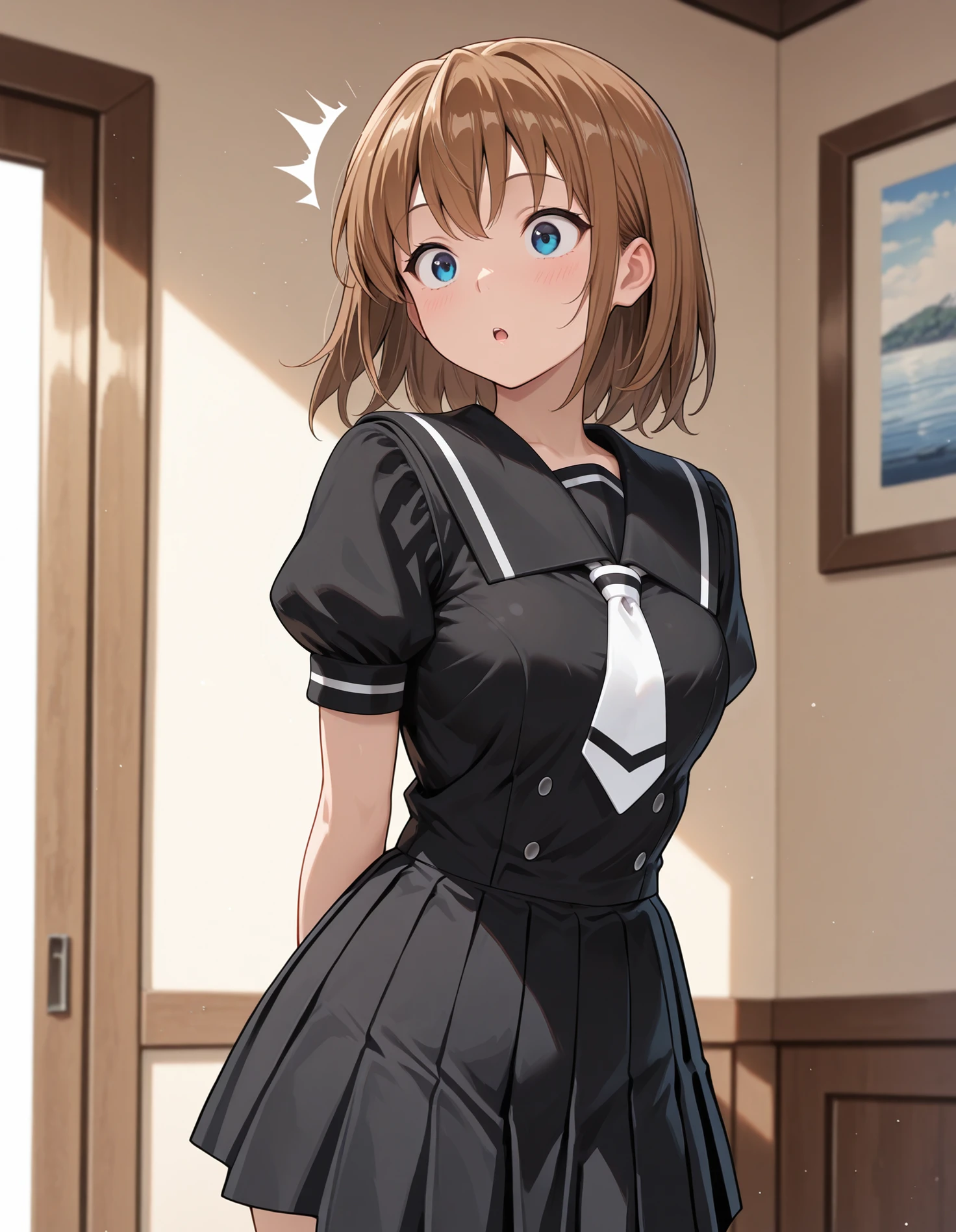 aikazero, brown hair, blue eyes, black shirt, short juliet sleeves, black sailor collar, white tie, black pleated skirt