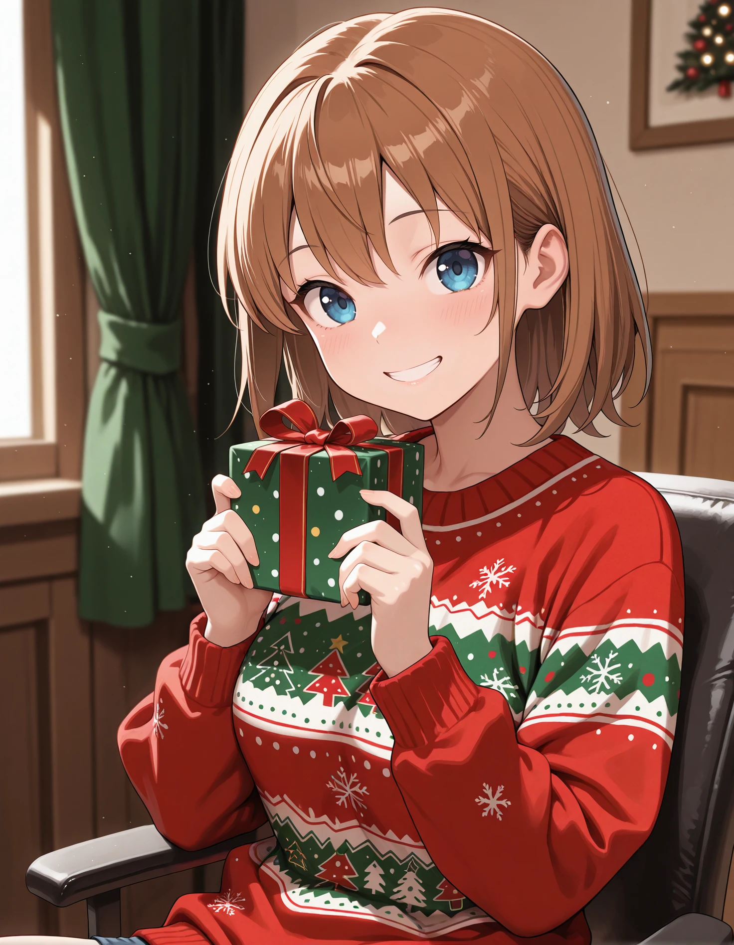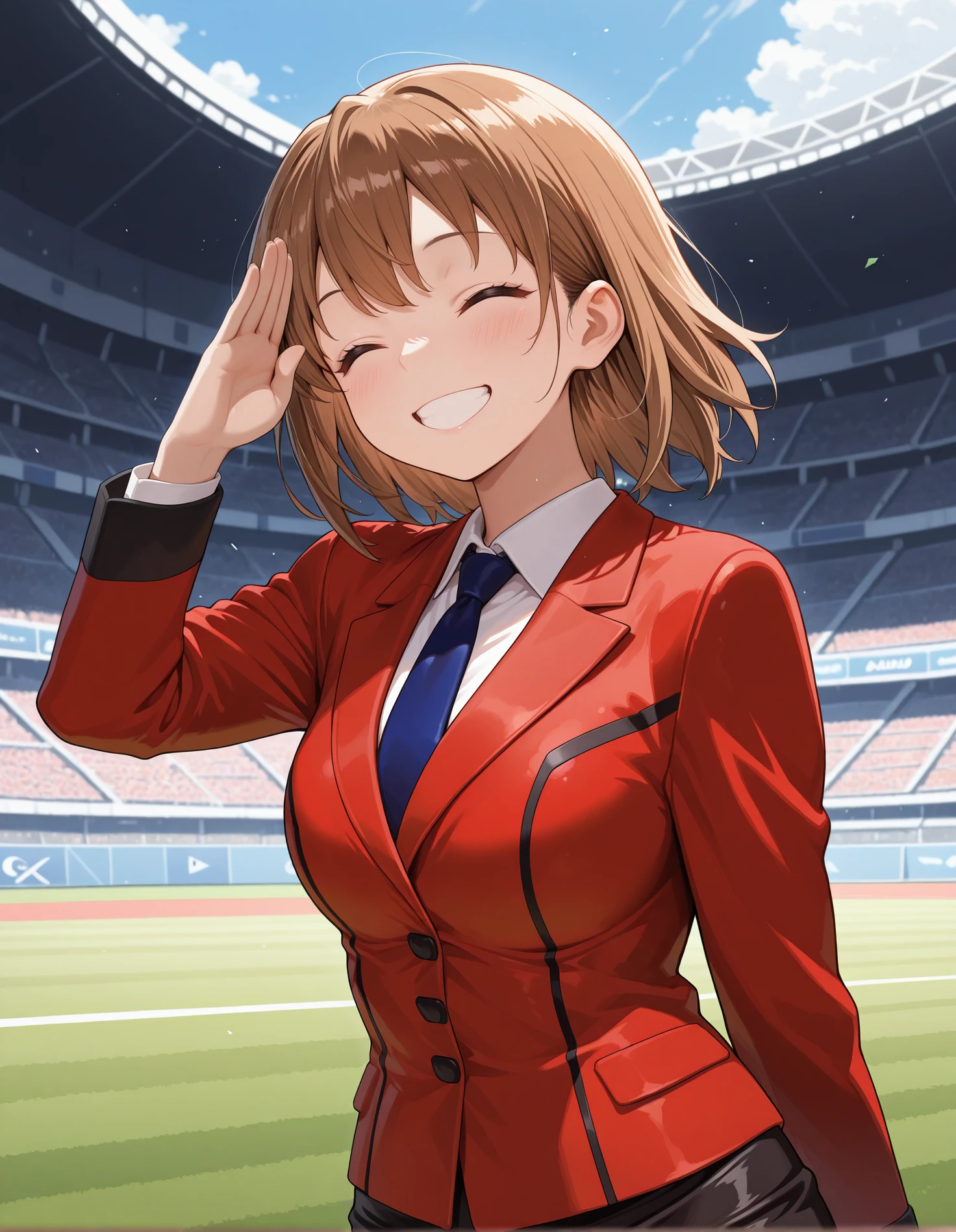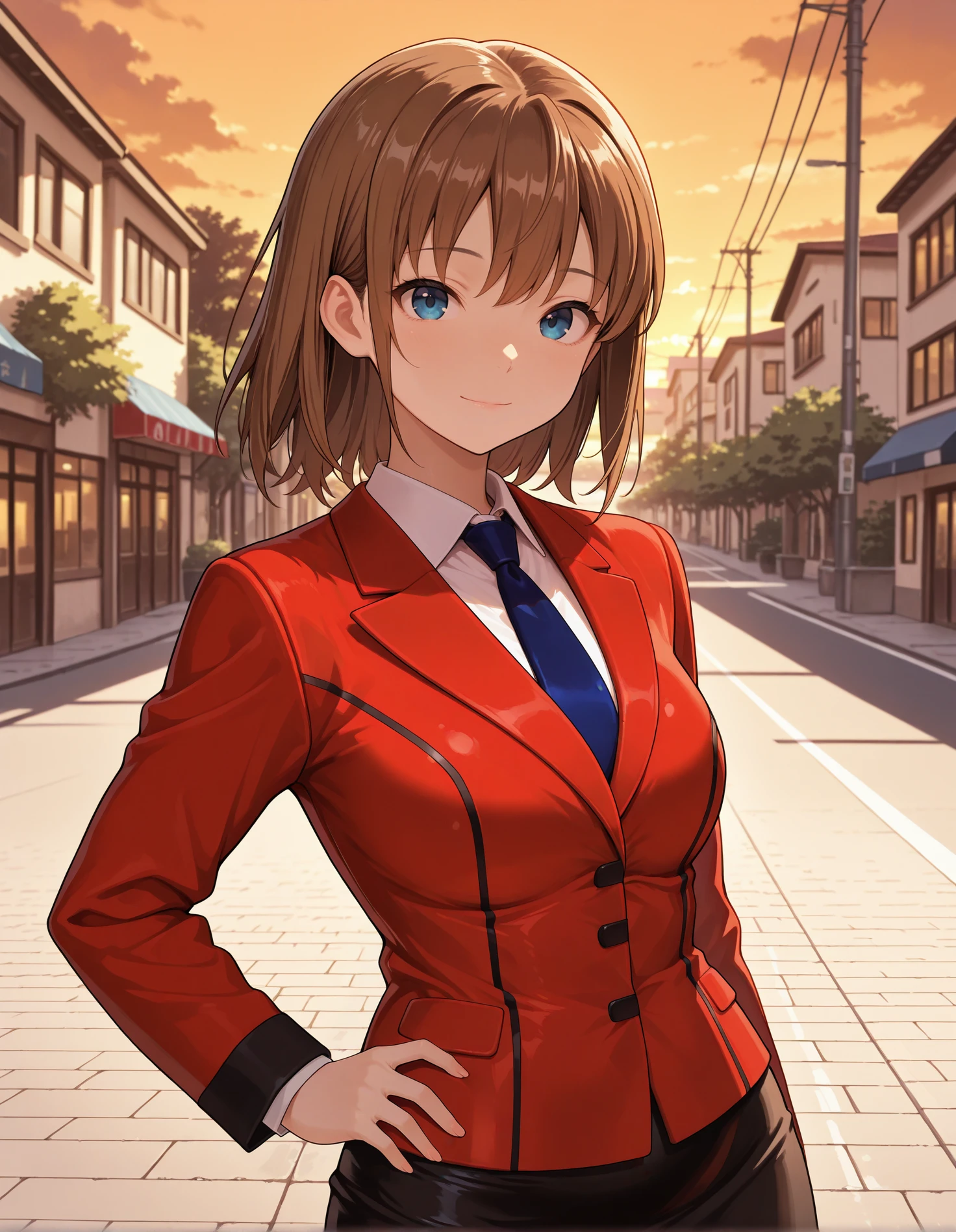 aikazero, brown hair, blue eyes, white shirt, blue necktie, red blazer, black pencil skirt