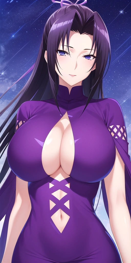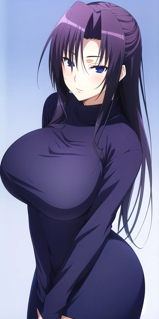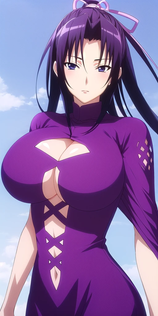 • purple_turtleneck_short_dress_wide_sleeves_clothing_cutout_cross-laced_clothes: Her classic outfit.