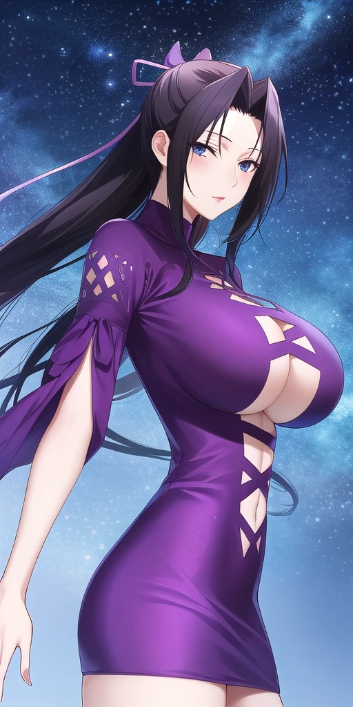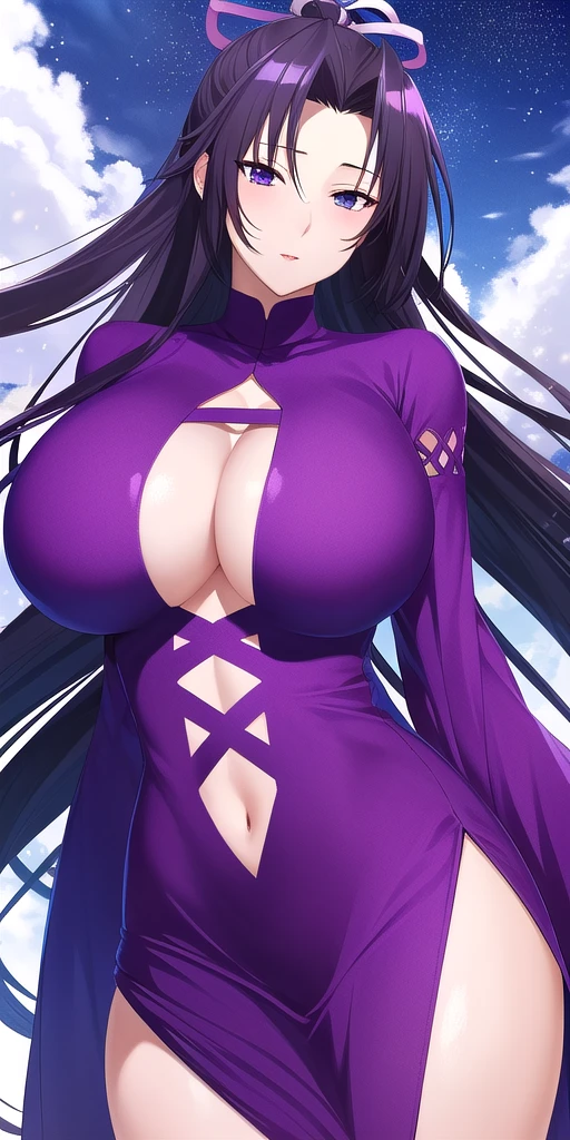 purple_turtleneck_short_dress_wide_sleeves_clothing_cutout_cross-laced_clothes