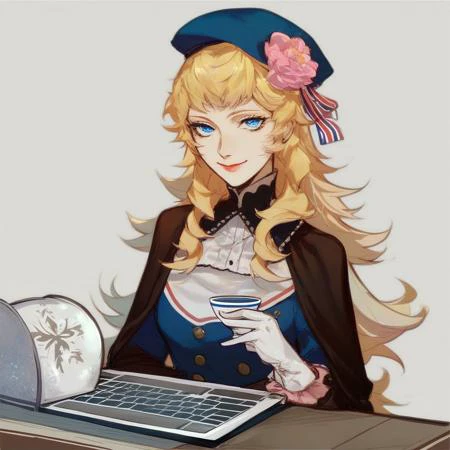 Agatha, blonde hair, blue eyes, Beret, dress, hat, 1girl, solo, long hair, looking at viewer, smile, gloves, sitting, flower, pantyhose, white gloves