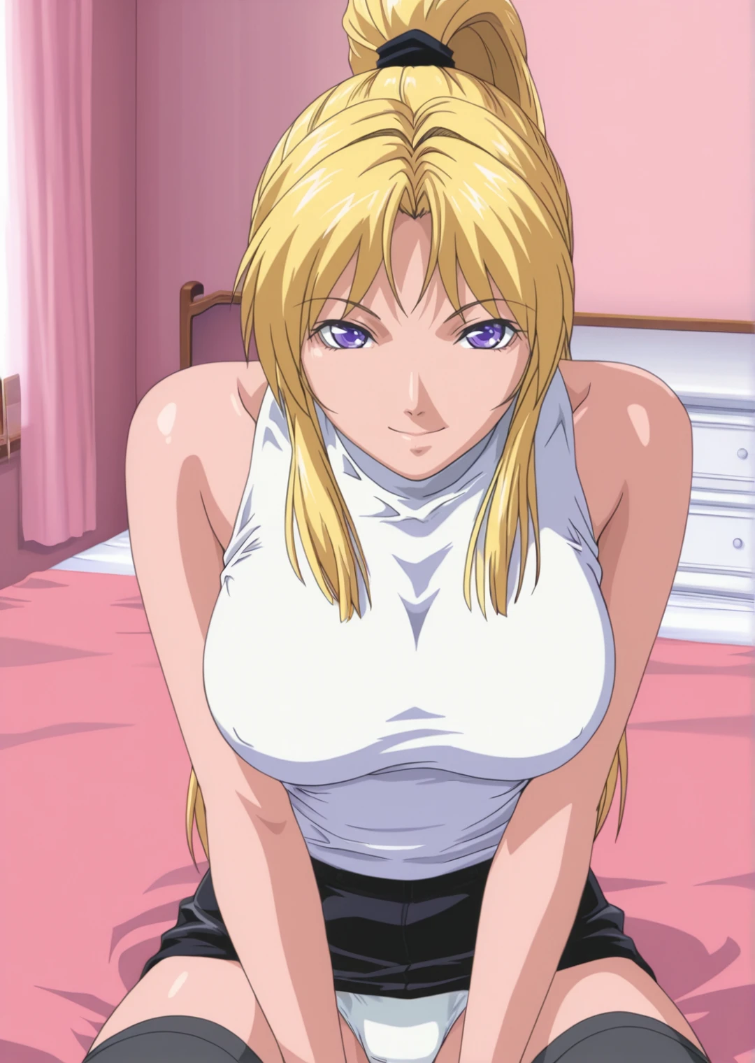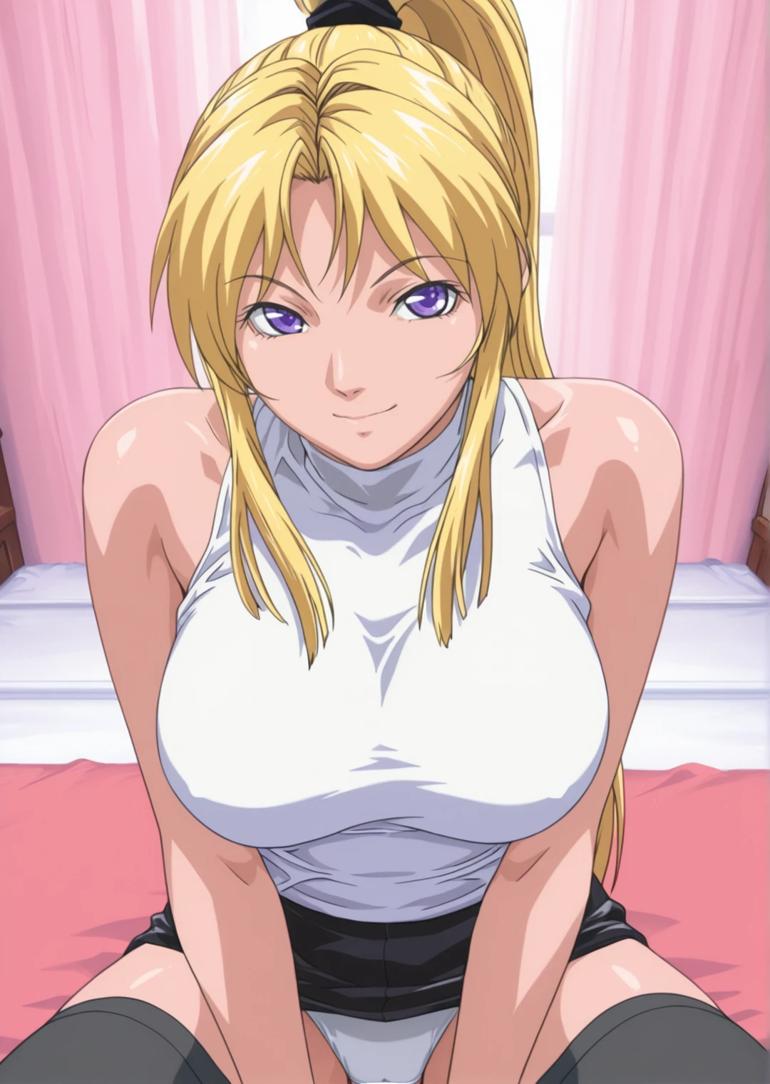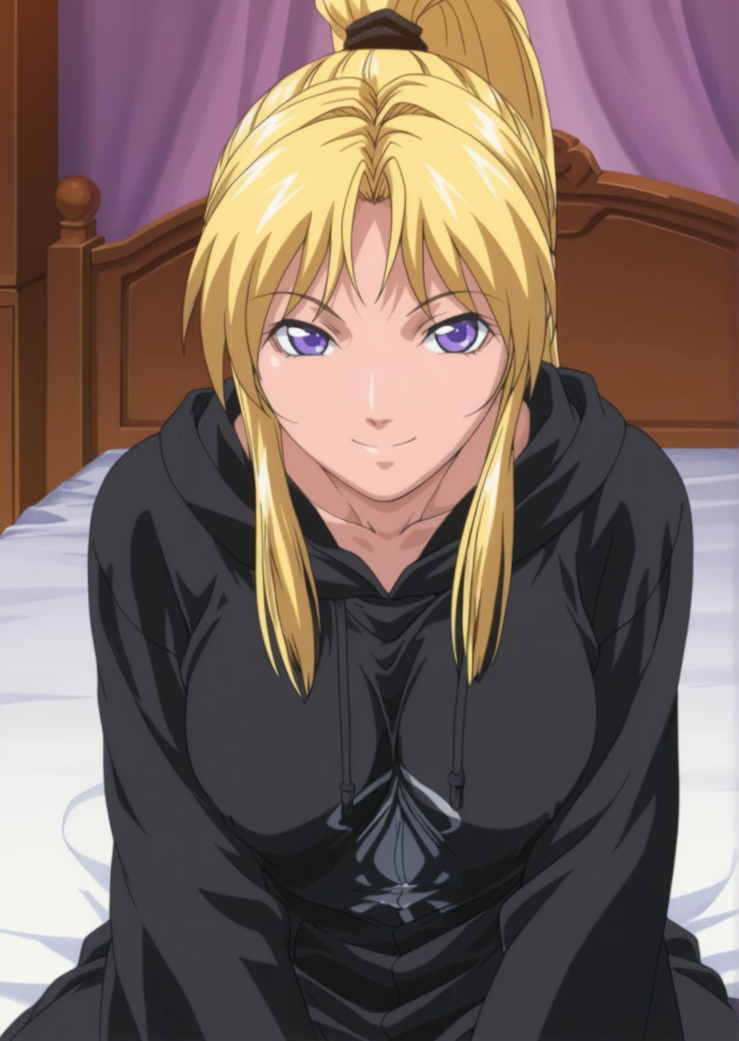 kaori saeki, ihigh ponytail, parted bangs, purple eyes