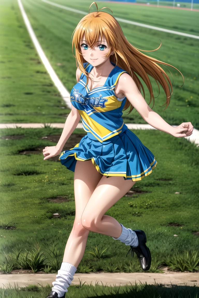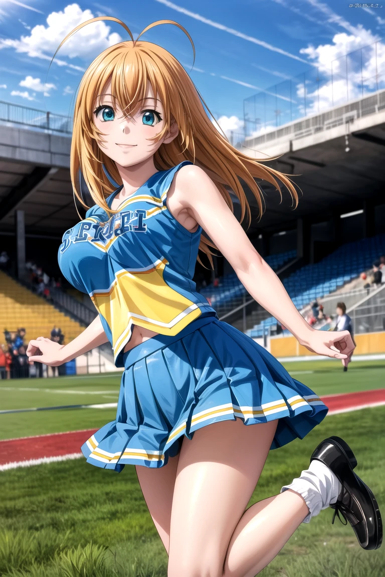 (pleated skirt, shoes, sleeveless, black footwear, blue skirt, sleeveless shirt, white socks, cheerleader)