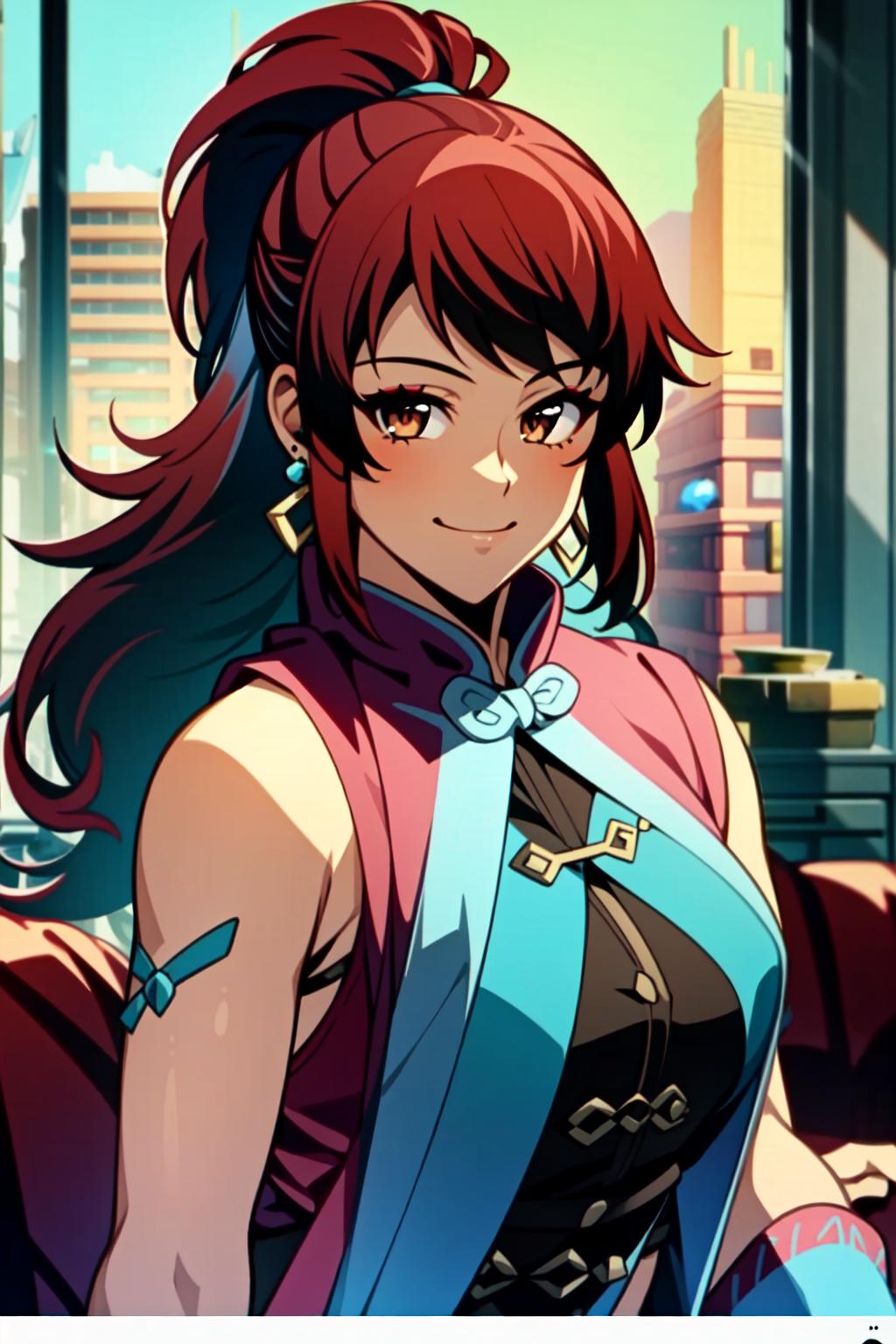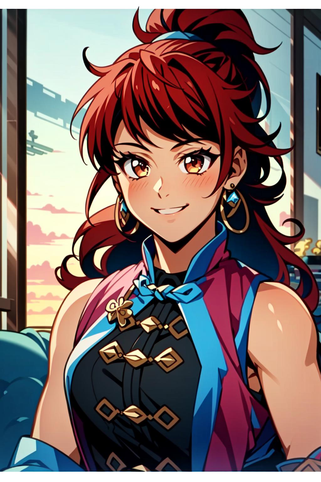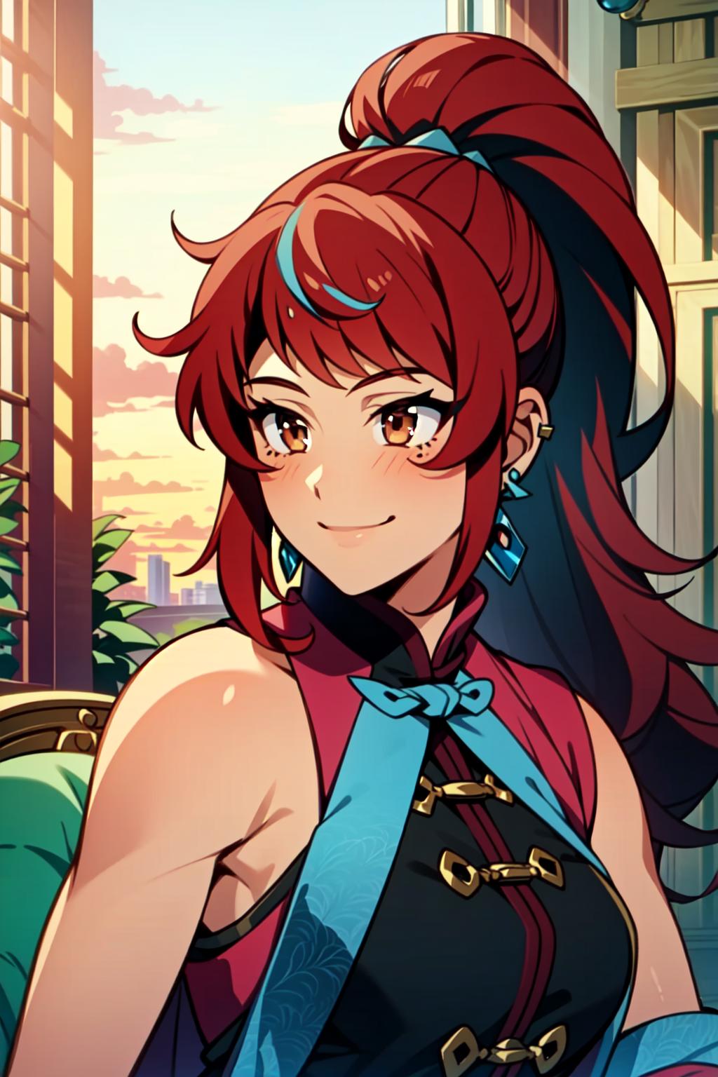 Kim Wu, 1girl, solo, earrings, jewelry, long hair, red hair, brown eyes, smile, makeup, ponytail, eyeshadow