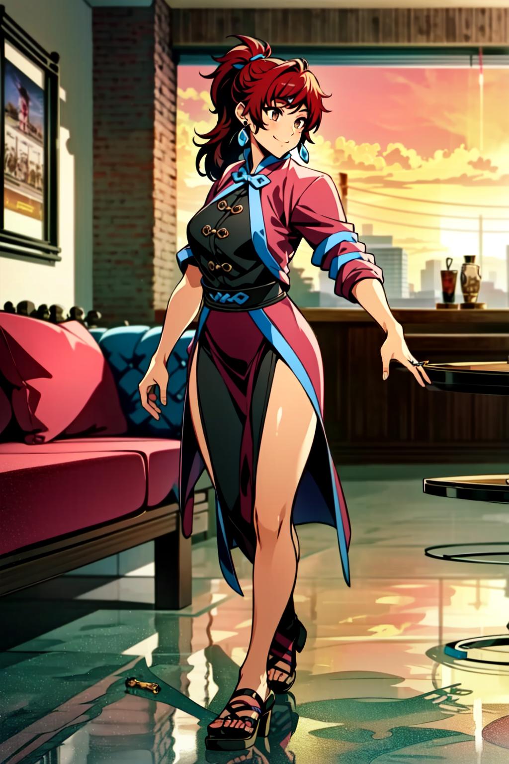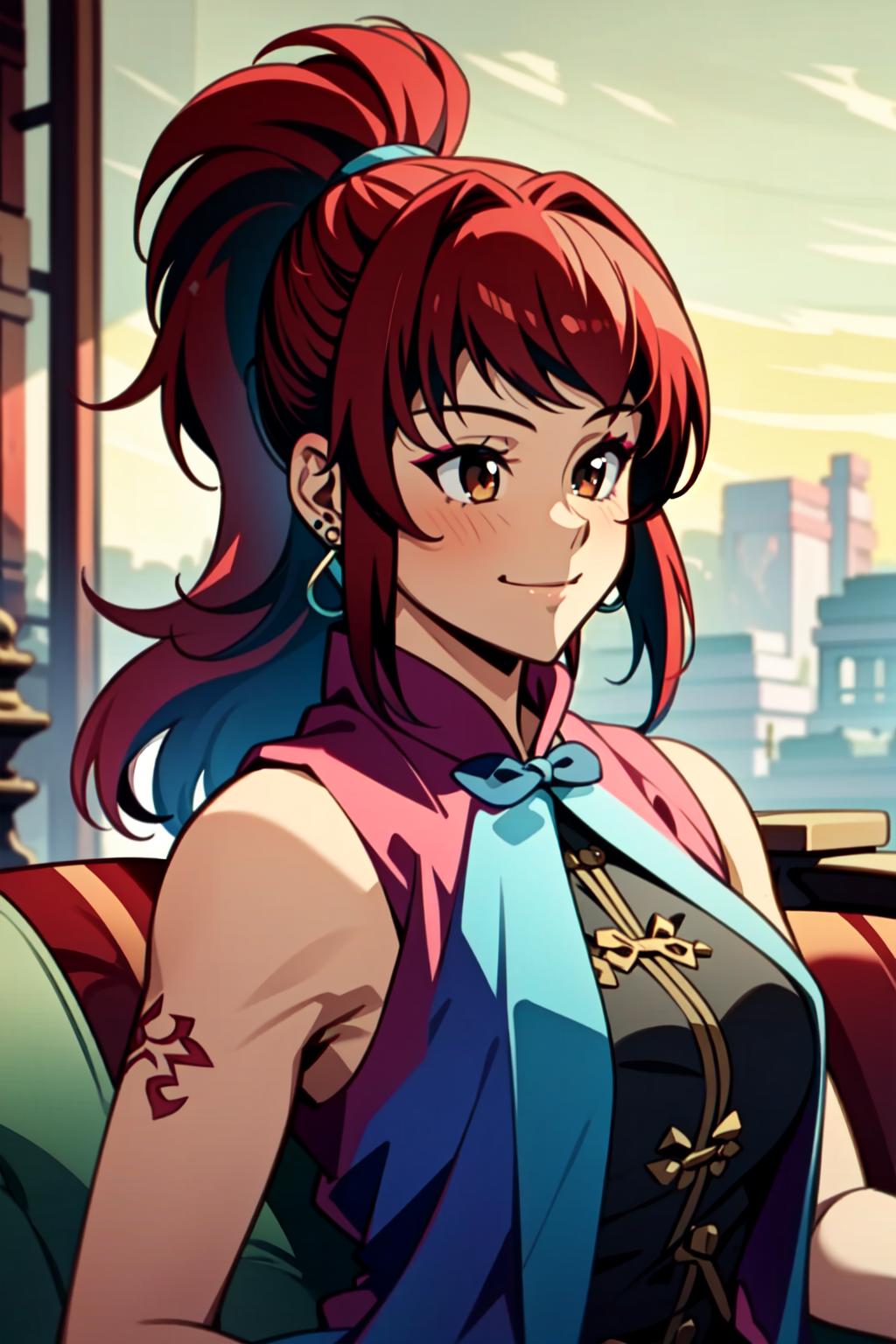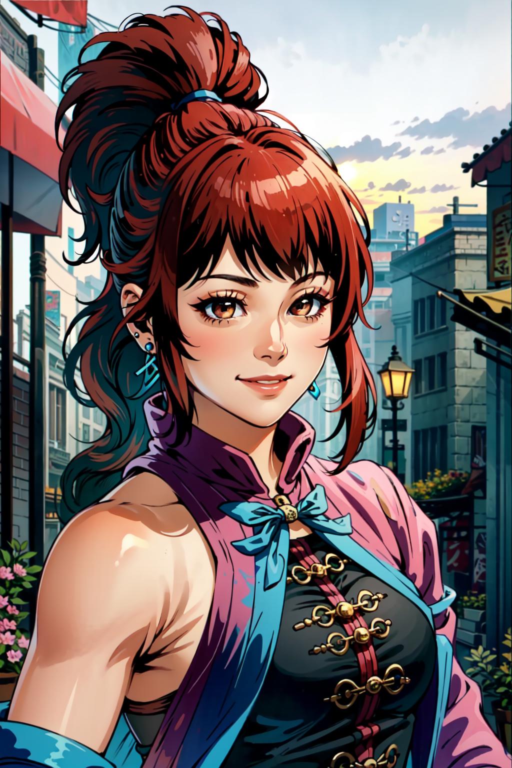 Kim Wu, 1girl, solo, earrings, jewelry, long hair, red hair, brown eyes, smile, makeup, ponytail, eyeshadow