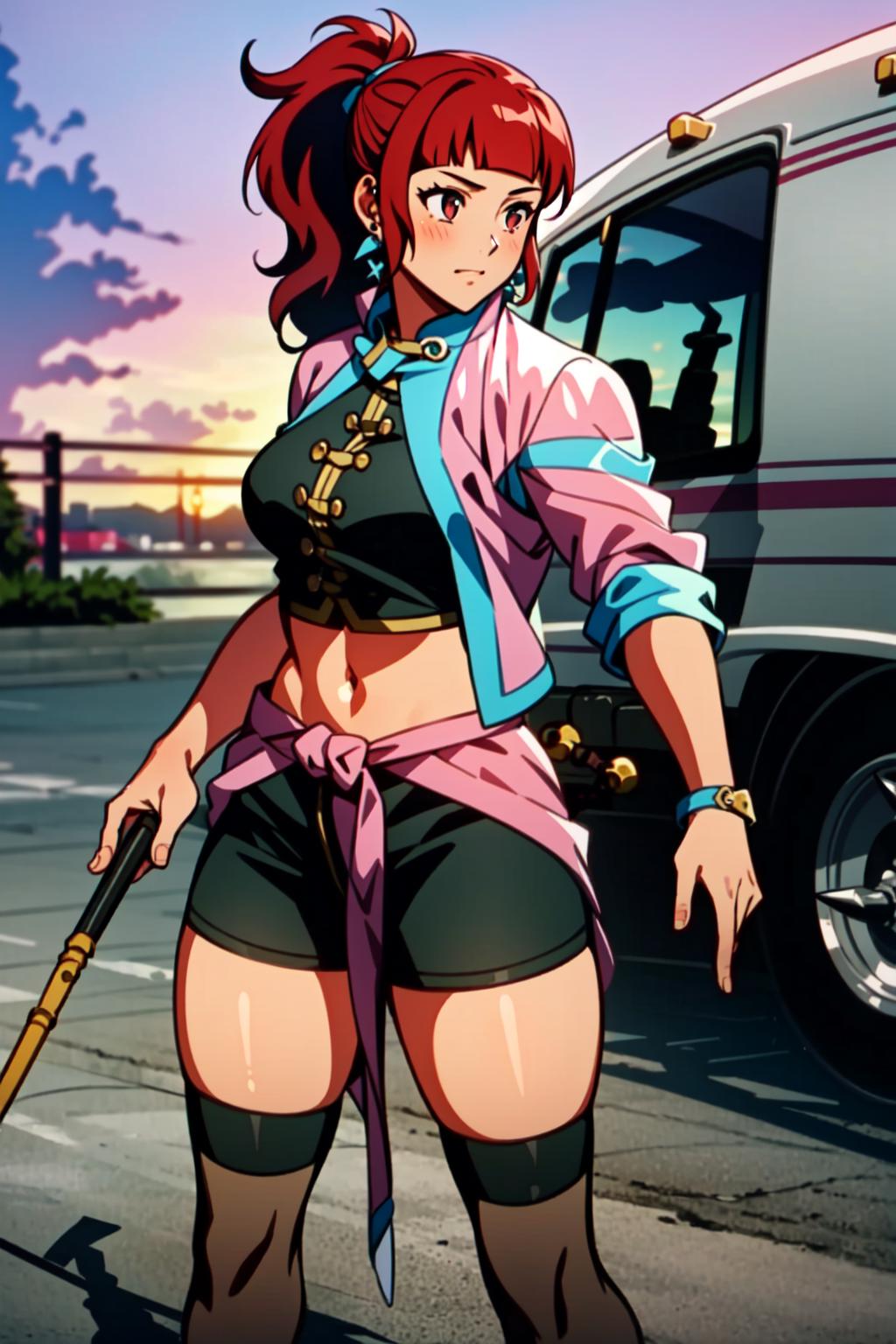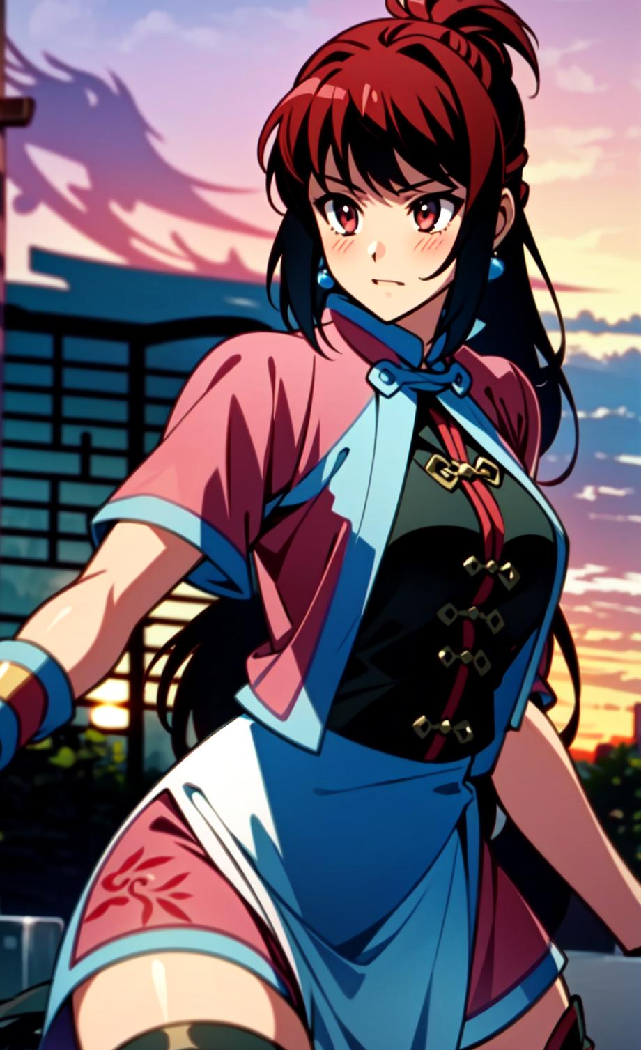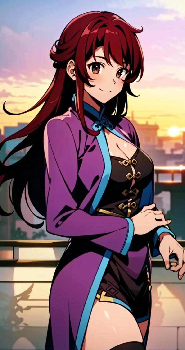Kim Wu, 1girl, solo, red hair, orange eyes, thighhighs, midriff, thighhighs, long hair, violet_outfit, violet chinese clothes, qipao, ponytail, thigh strap, sandals, weapon, Nunchaku,