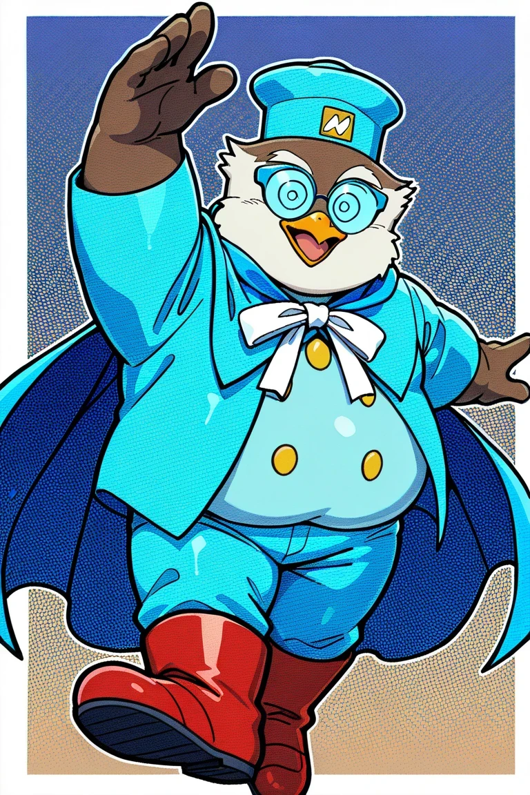 OldManOwlOVA, 1boy, brown fur, whimsical outfit, blue cape, red boots, round light blue glasses, yellow beak, small light blue hat, fat, chubby, cream colored ribbon bowtie