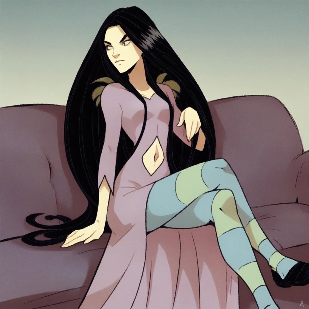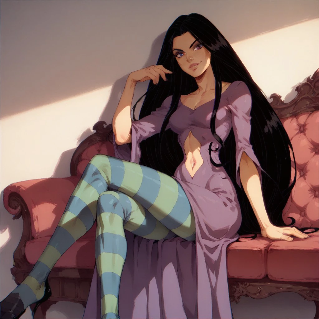 nerissa_w, long hair, black hair, navel cutout, purple dress, striped pantyhose