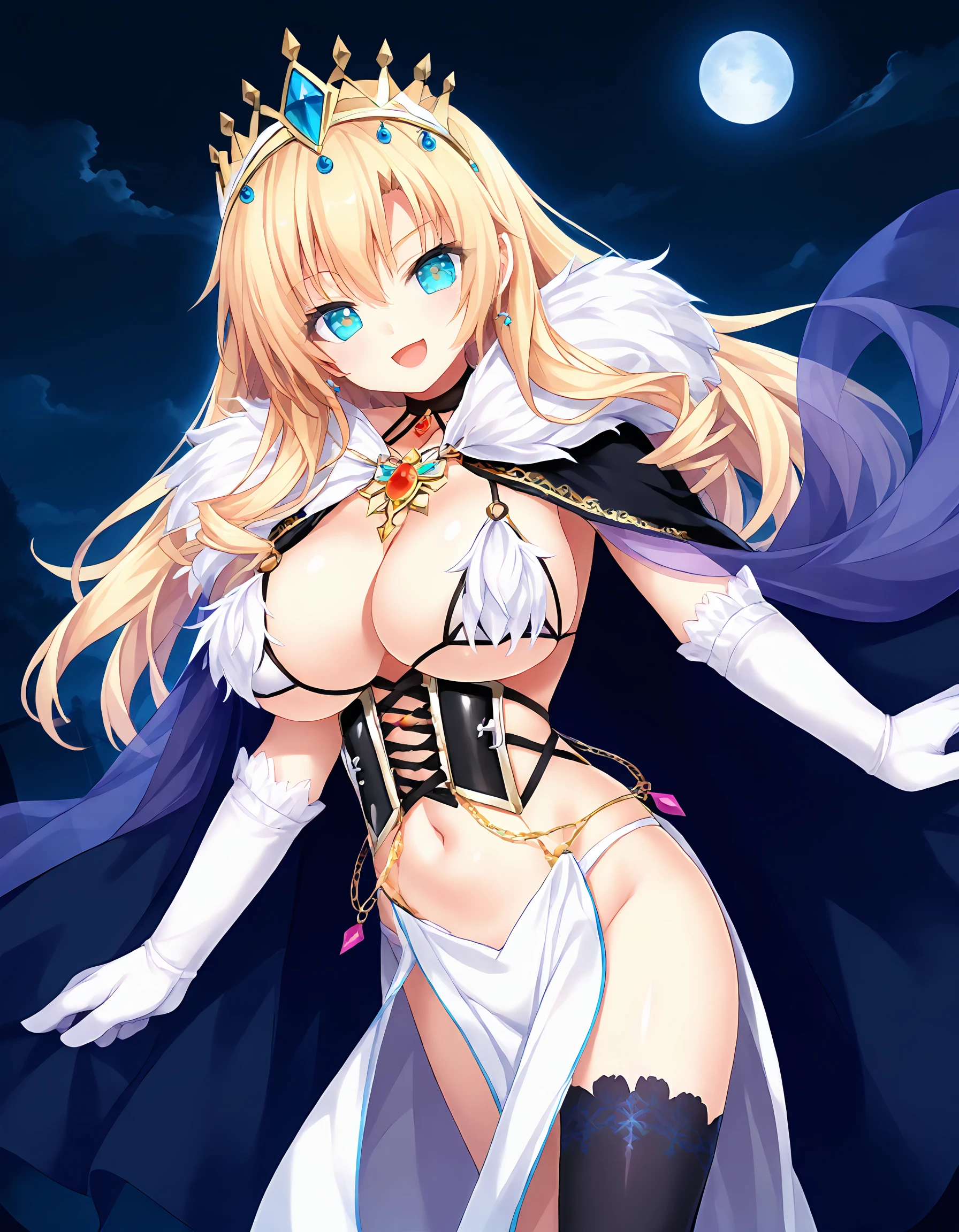 outfit06, tiara, golden tiara, jewelry tiara, cape, black cape, layered cape, purple cape, fur cape, shawl, purple shawl, see-through shawl, brooch, multicolor brooch, choker, black choker, bra, crossing halter bra straps, fur decollated bra, neck red jewelry, corset, black corset, lace-up corset, armor, black armor, abdominal armor, waist chain, golden chain with pink jewelry, pelvic curtain, white pelvic curtain, pantie, white pantie, parted pantie, single thighhigh, black thighhigh, side boob, under boob, gloves, white glove, elbow glove,