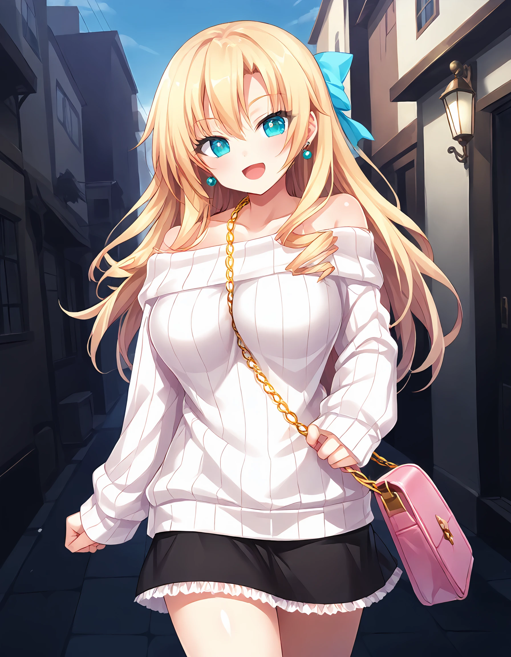 outfit02. hairbow, aqua hairbow, earrings, jewelry earring, aqua earring, sweater, white sweater, off shoulders sweater, bare shoulder, long sleeves, sleeves cutout, sleeve past wrist, skirt, black skirt, fur trimmed skirt, mini skirt, bag, pink bag, golden chain strap bag, slanted bag,