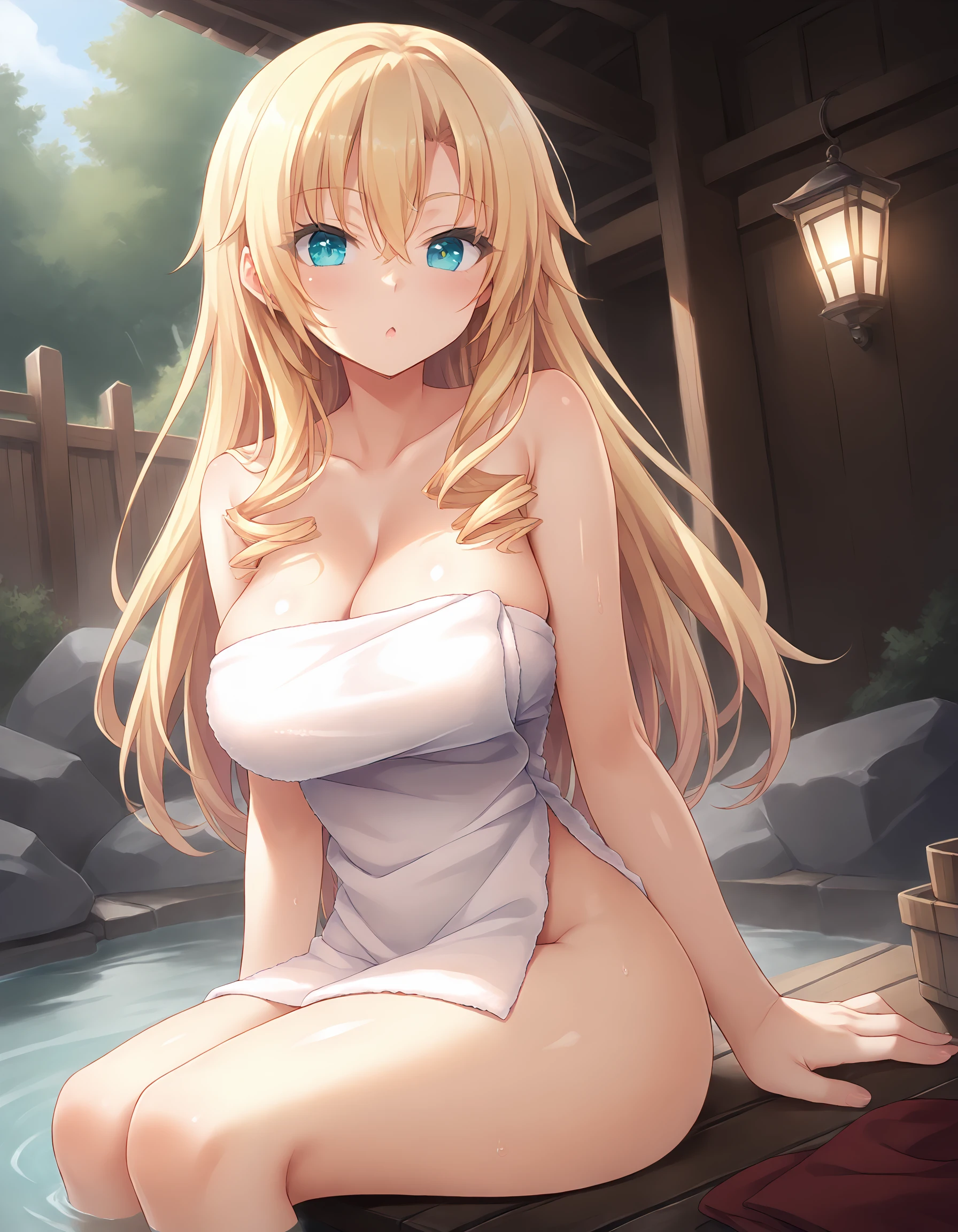 outfit07, dress, light blue dress, princess dress, strapless dress, long dress, frilled dress, bow dress, aqua bow, off shoulder dress, short sleeves, puffy sleeves, lace-up waist, slit dress skirt, center slit, pantie, white pantie, high leg pantie, string pantie, thighhighs, white thighhighs, cleavage, bare shoulders, midriff, groin,