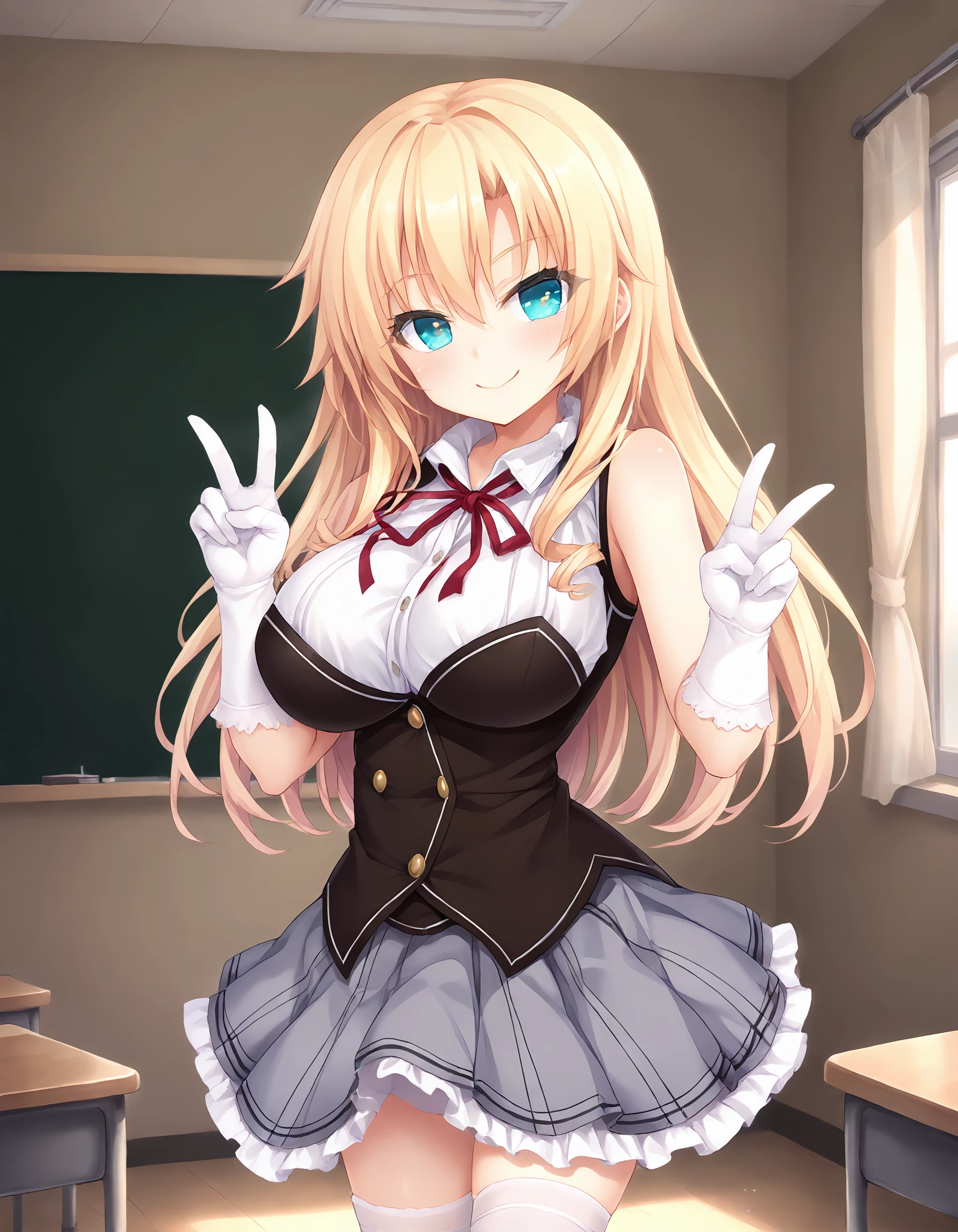 outfit01, sleeveless, bare shoulders, gloves, white glove, elbow glove, bustier, black bustier, white line trimmed bustier, 4 buttons, shirt, white shirt, collared shirt, loop tie, red loop tie, skirt, gray skirt, pleated skirt, white frill trimmed skirt, thighhighs, white thighhighs, zettai ryouiki,