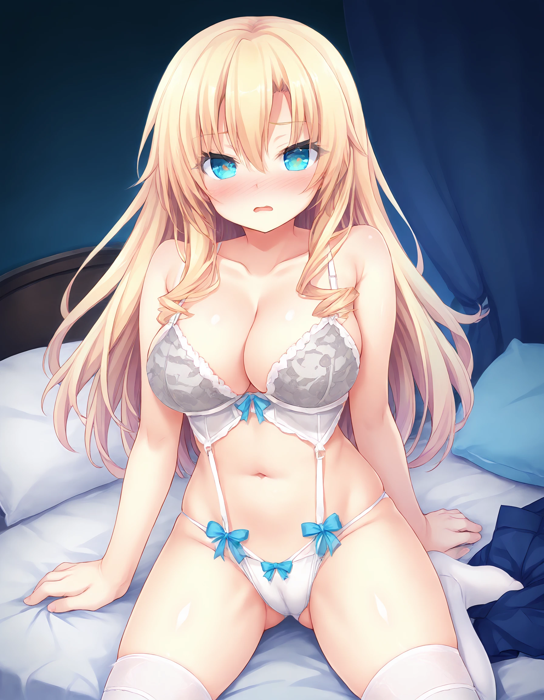 outfit05, underwear, underwear only, white underwear, teddy, garter straps connected underwear, straps gap, bow underwear, aqua bow, bra, lace trimmed bra, pantie, G-string pantie, high leg pantie, groin, cameltoe, kneehighs, white kneehighs, collarbone, bare shoulders, midriff, navel,