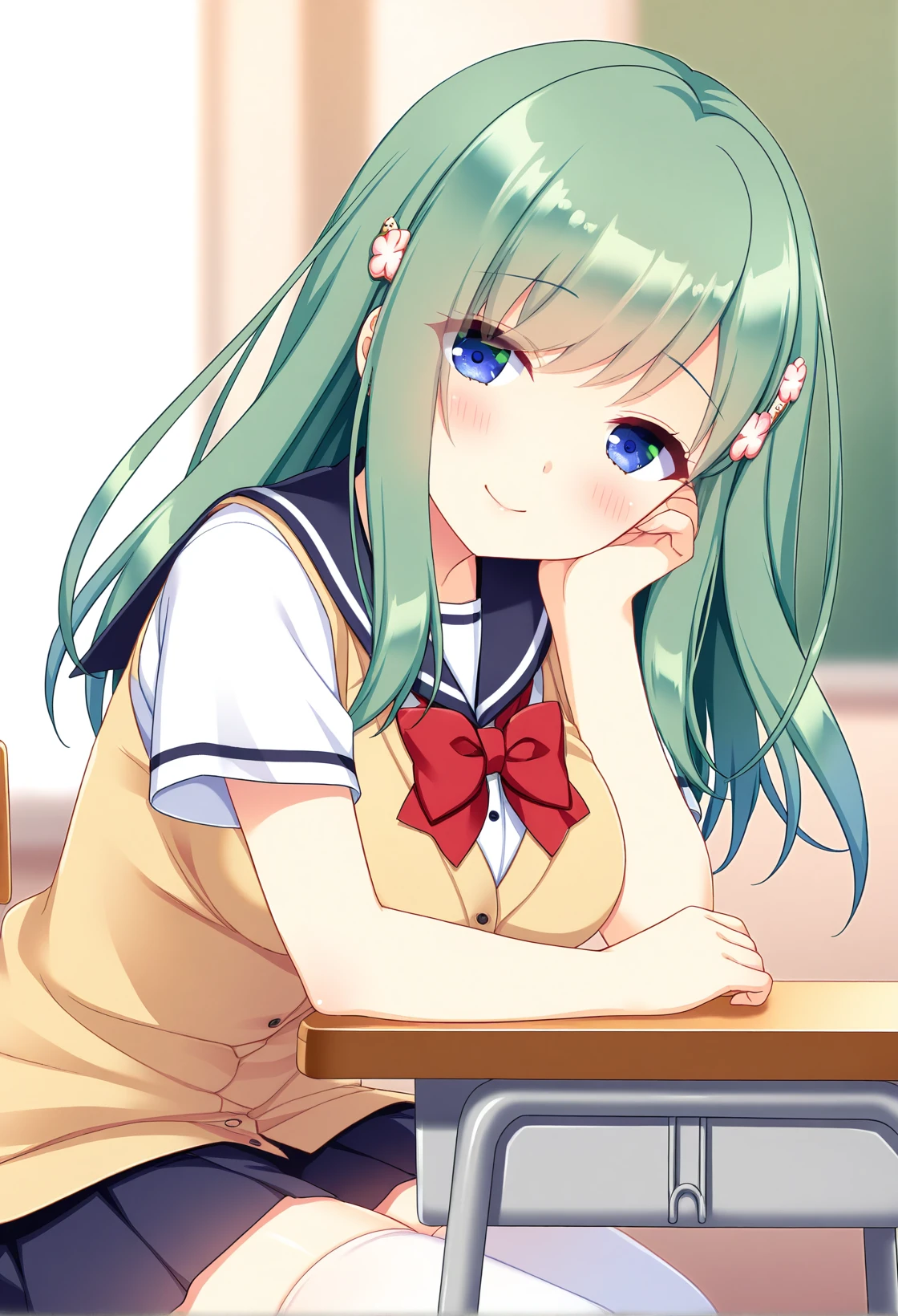 sweater vest,cardigan vest,serafuku,sailor collar,vest,cardigan,school uniform,miniskirt,white shirt,pleated skirt,white thighhighs,bowtie,red bow,私服1