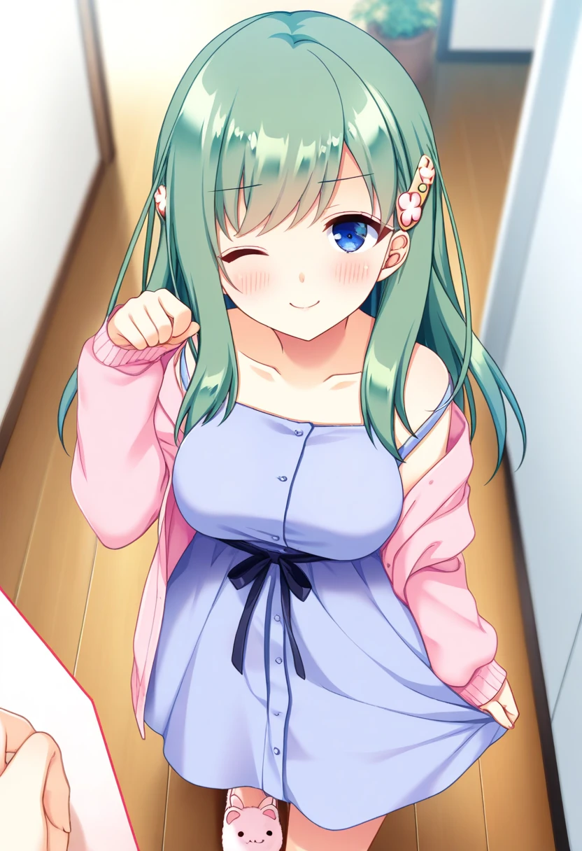 blue dress,long sleeves,pink jacket,open jacket,pink cardigan,sleeves past wrists,slippers,animal slippers,spaghetti strap,off shoulder,运动服