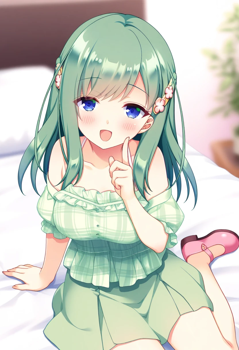 plaid shirt,green shirt,green skirt,frilled sleeves,plaid,frilled shirt,puffy sleeves,camisole,spaghetti strap,pink footwear,mary janes,私服2