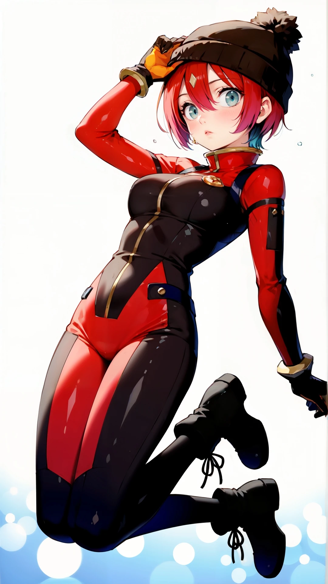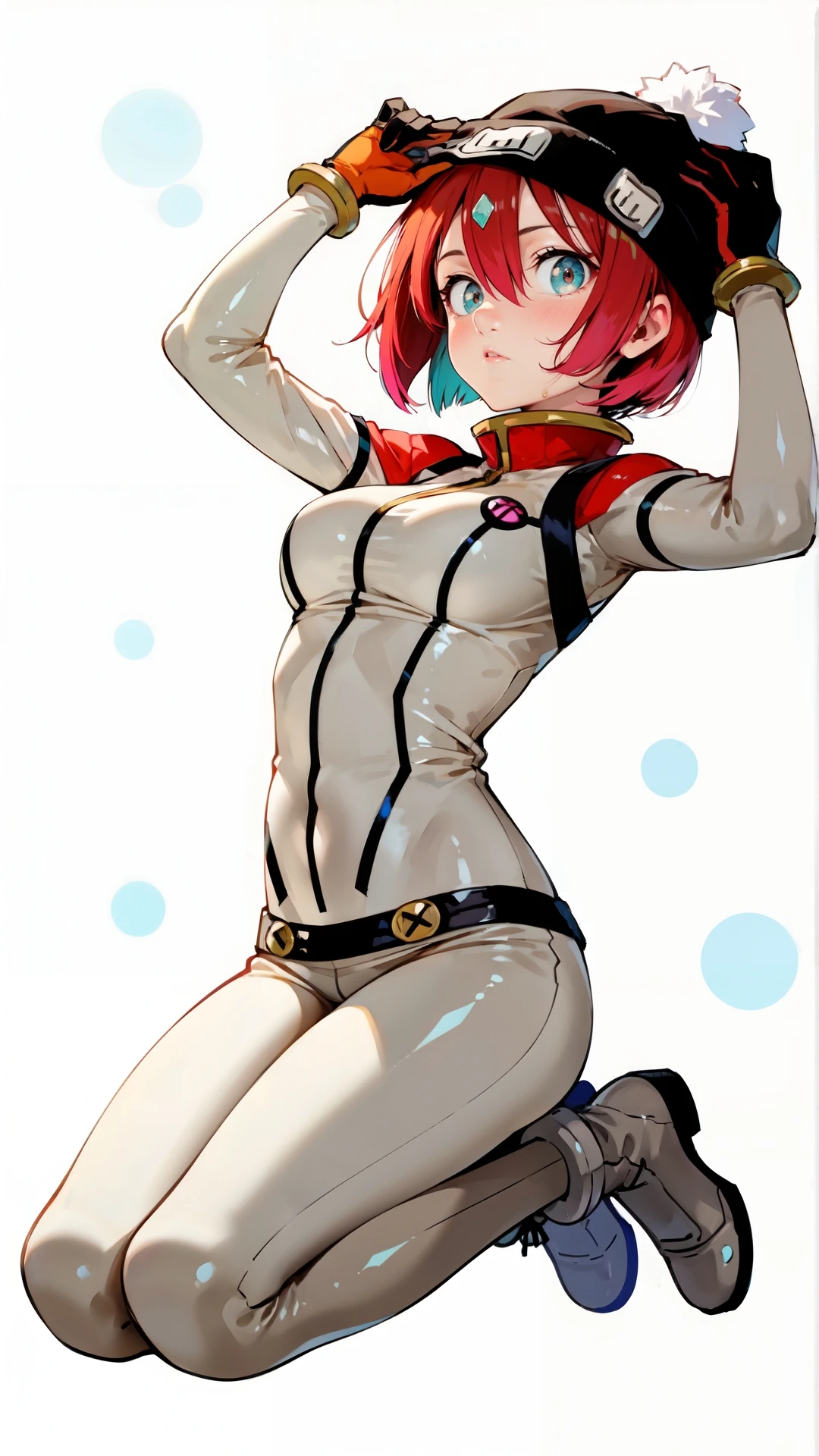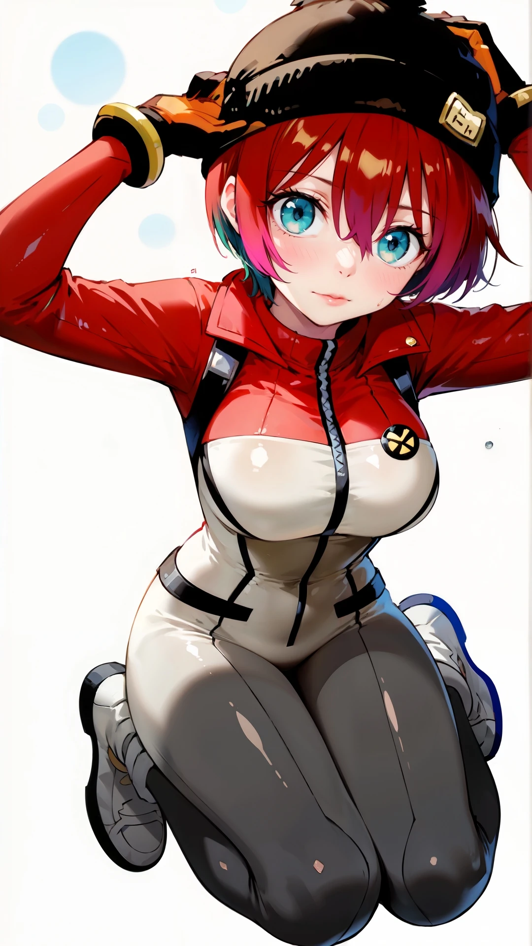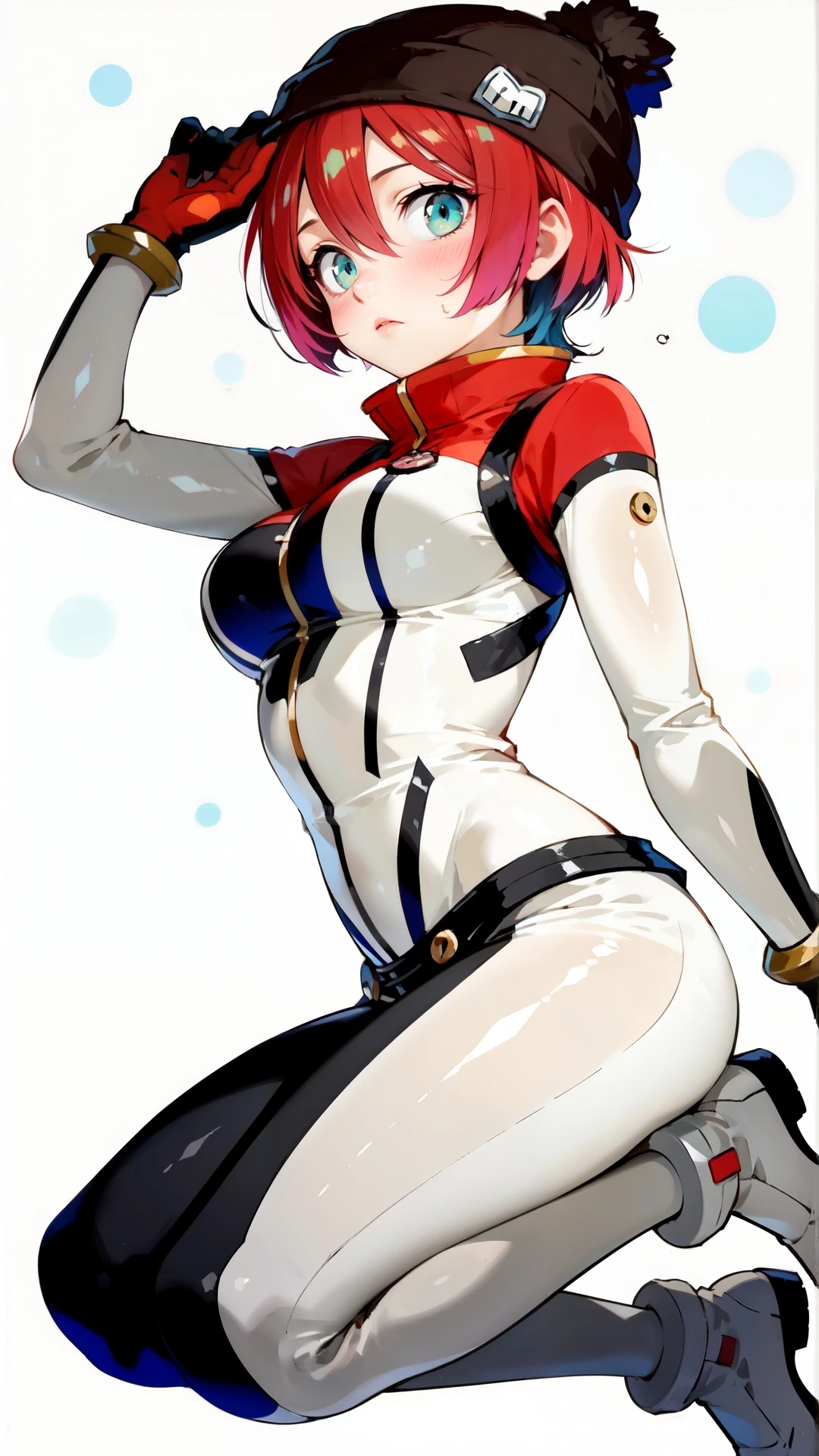 amate_yuzuriha, an anime girl, 1girl, solo, breasts, looking at viewer, blush, short hair, simple background, gloves, hat, white background, hair between eyes, sitting, closed mouth, green eyes, red hair, multicolored hair, sweat, bodysuit, hand on headwear