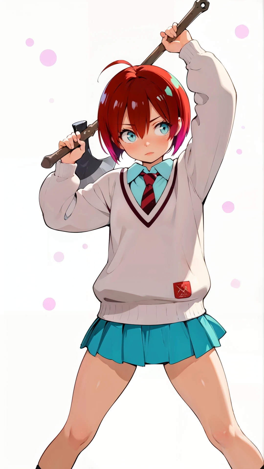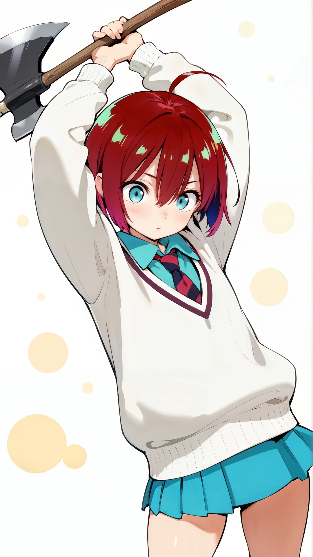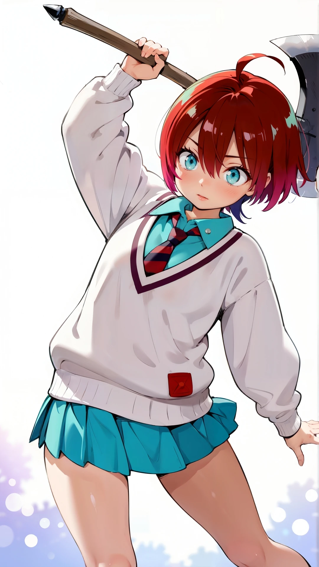 amate_yuzuriha, an anime girl, 1girl, solo, short hair, bangs, skirt, simple background, shirt, long sleeves, white background, holding, hair between eyes, closed mouth, weapon, ahoge, red hair, multicolored hair, pleated skirt, necktie, striped, puffy sleeves, collared shirt, holding weapon, arm up, aqua eyes, sweater, blue skirt, wing collar, red necktie, legs apart, axe, striped necktie, holding axe, aqua skirt