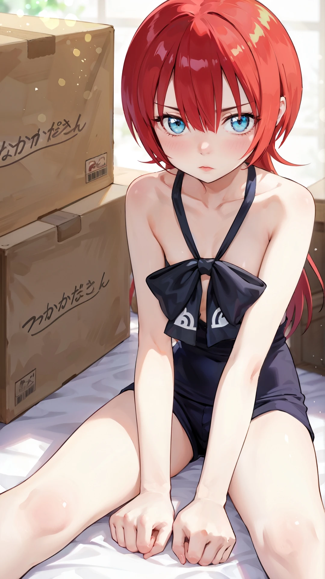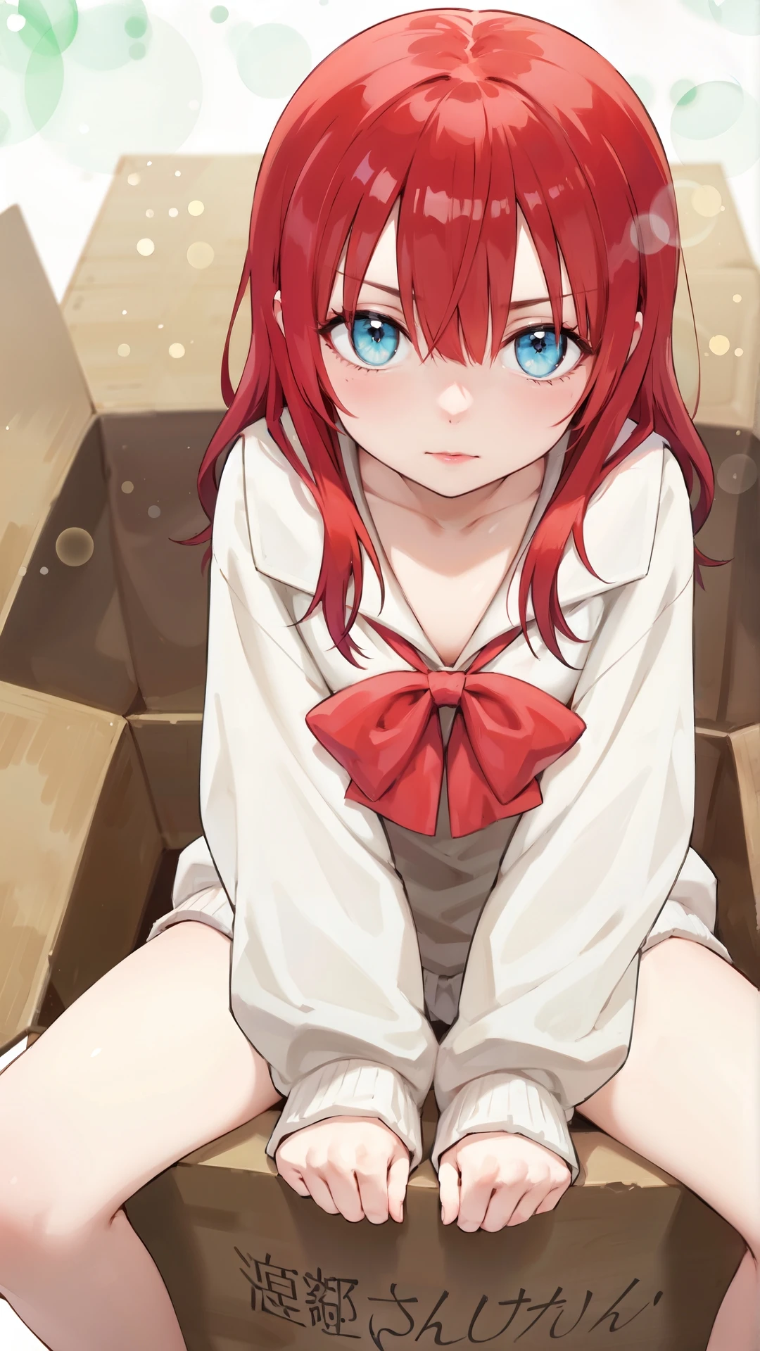 amate_yuzuriha, an anime girl, 1girl, solo, looking at viewer, short hair, bangs, simple background, white background, hair between eyes, closed mouth, collarbone, red hair, frown, box, clenched hands, legs apart, cardboard box