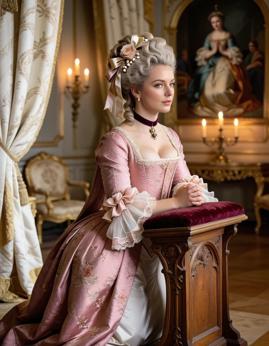 Concept : Né d'un amusement créatif, ce LoRA transcende la simple génération de personnages pour offrir une véritable composition d'époque. Il marie harmonieusement trois éléments : la pose révérencieuse (à genoux, mains jointes ou reposant sur un prie-dieu), l'habit rococo (robes de soie brodées, corsages ajustés, manches bouffantes ornées de dentelle), et l'ambiance d'intérieur aristocratique (tentures damassées, mobilier doré, éclairage aux chandelles).