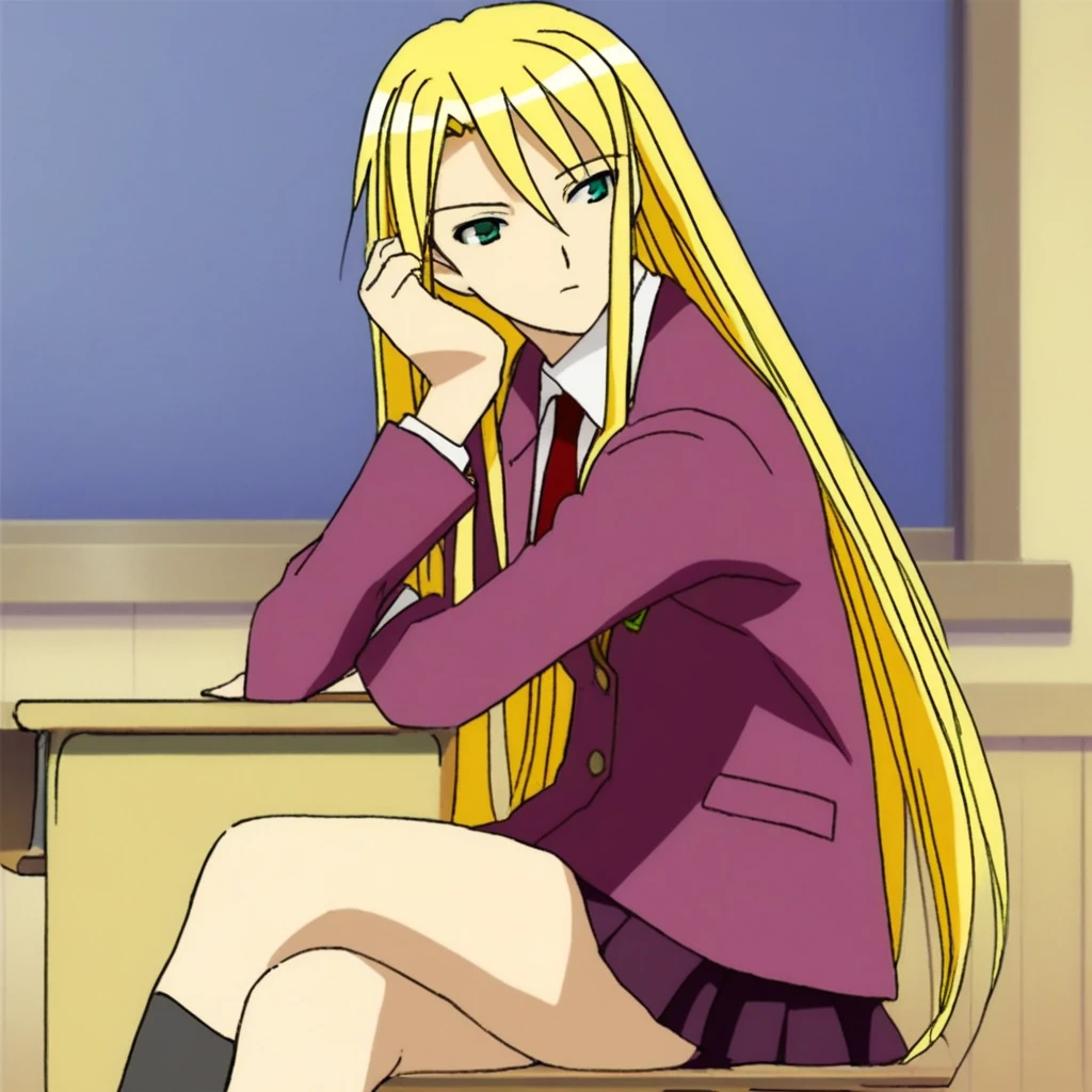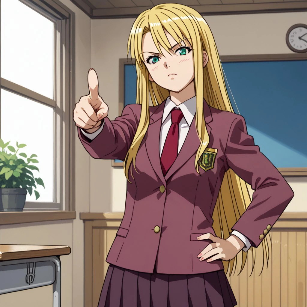 yukihiro_ayaka, blonde hair, long hair, green eyes, school uniform, blazer, necktie, skirt