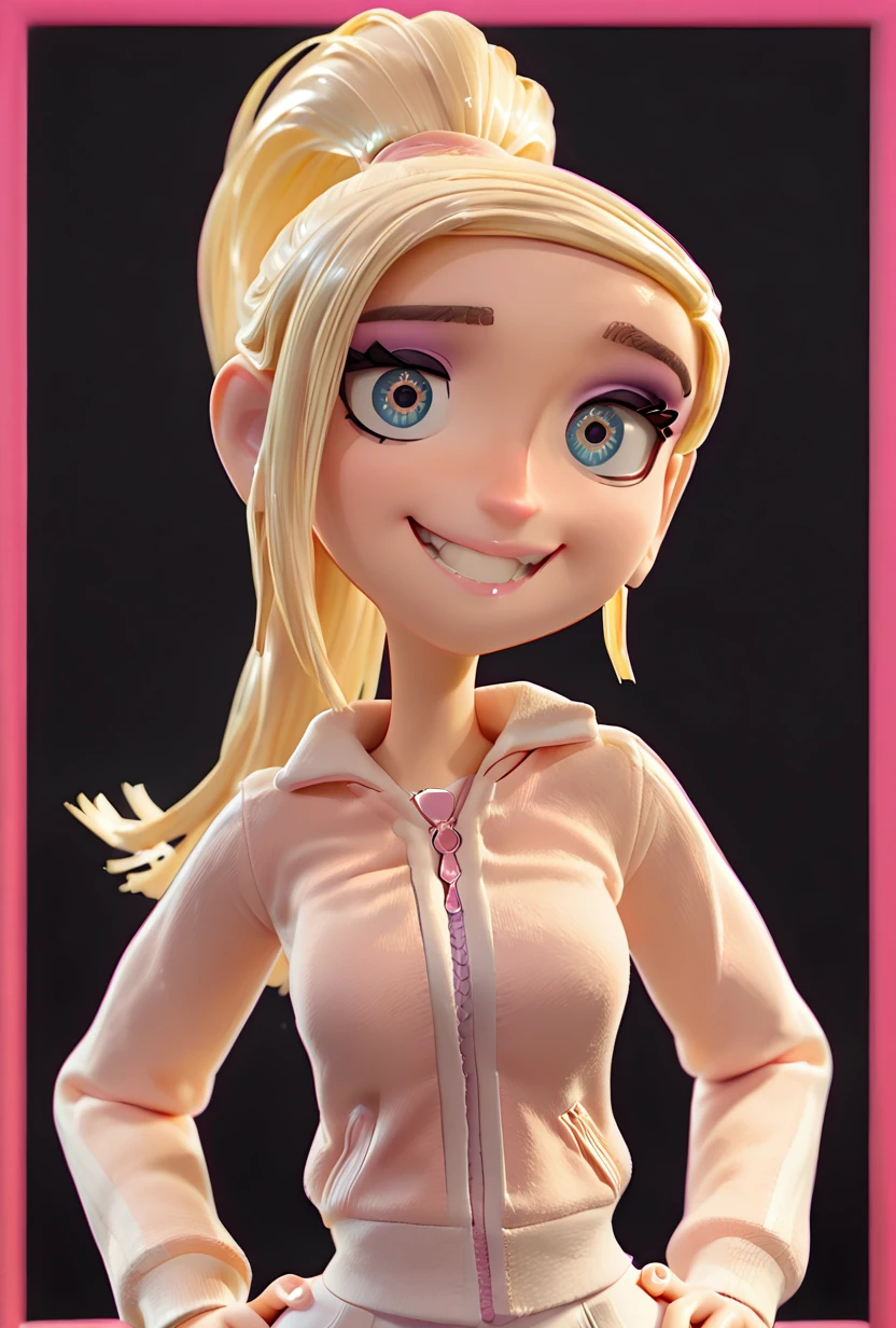 courtneybabcockparanorman, 1girl, blonde hair, long hair, solo, lips, makeup, high ponytail, long sleeves, jacket, zipper, wide hips, 3d,