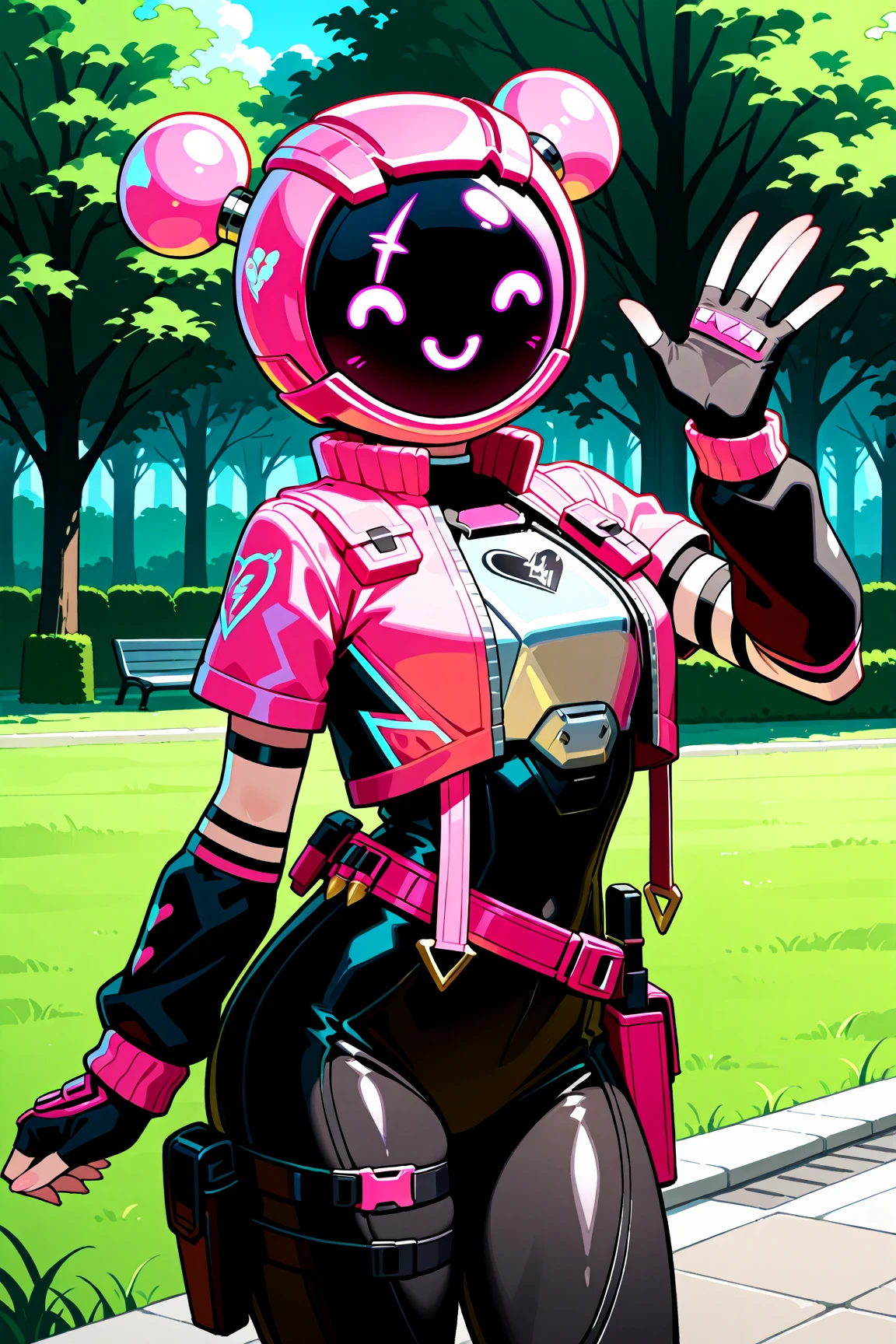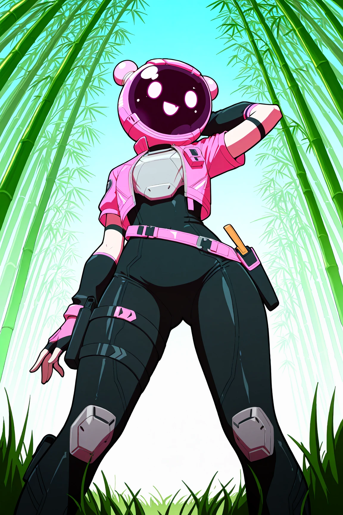 Pink Jacket, Cropped Jacket, Thigh Strap, Black Bodysuit, Bodysuit, Black Arm Warmers, Pink Fingerless Gloves, Loose Belt, Leg Holster, Chest Guard, Pink Footwear, Pink Boots, Pouch, Boots