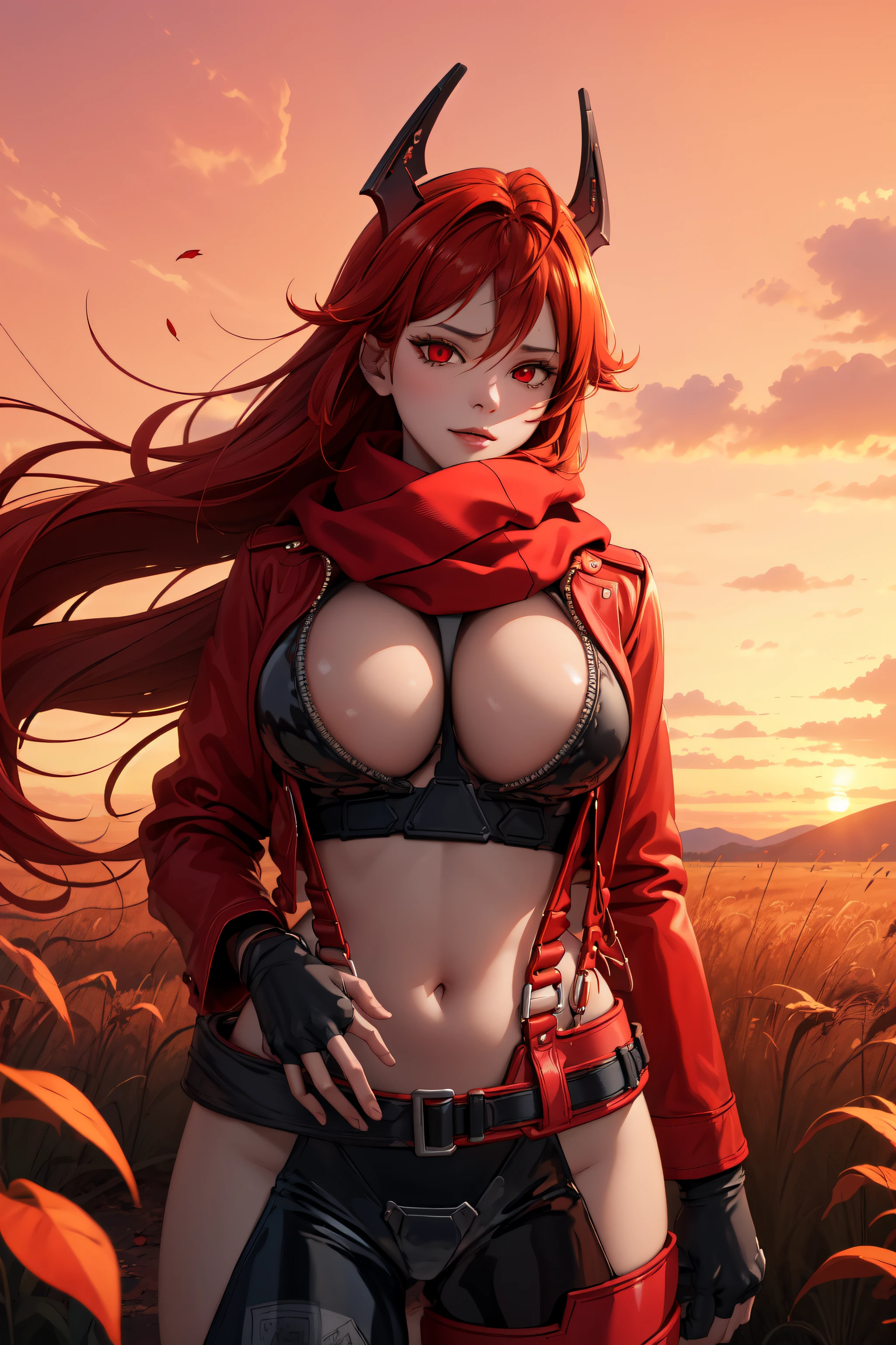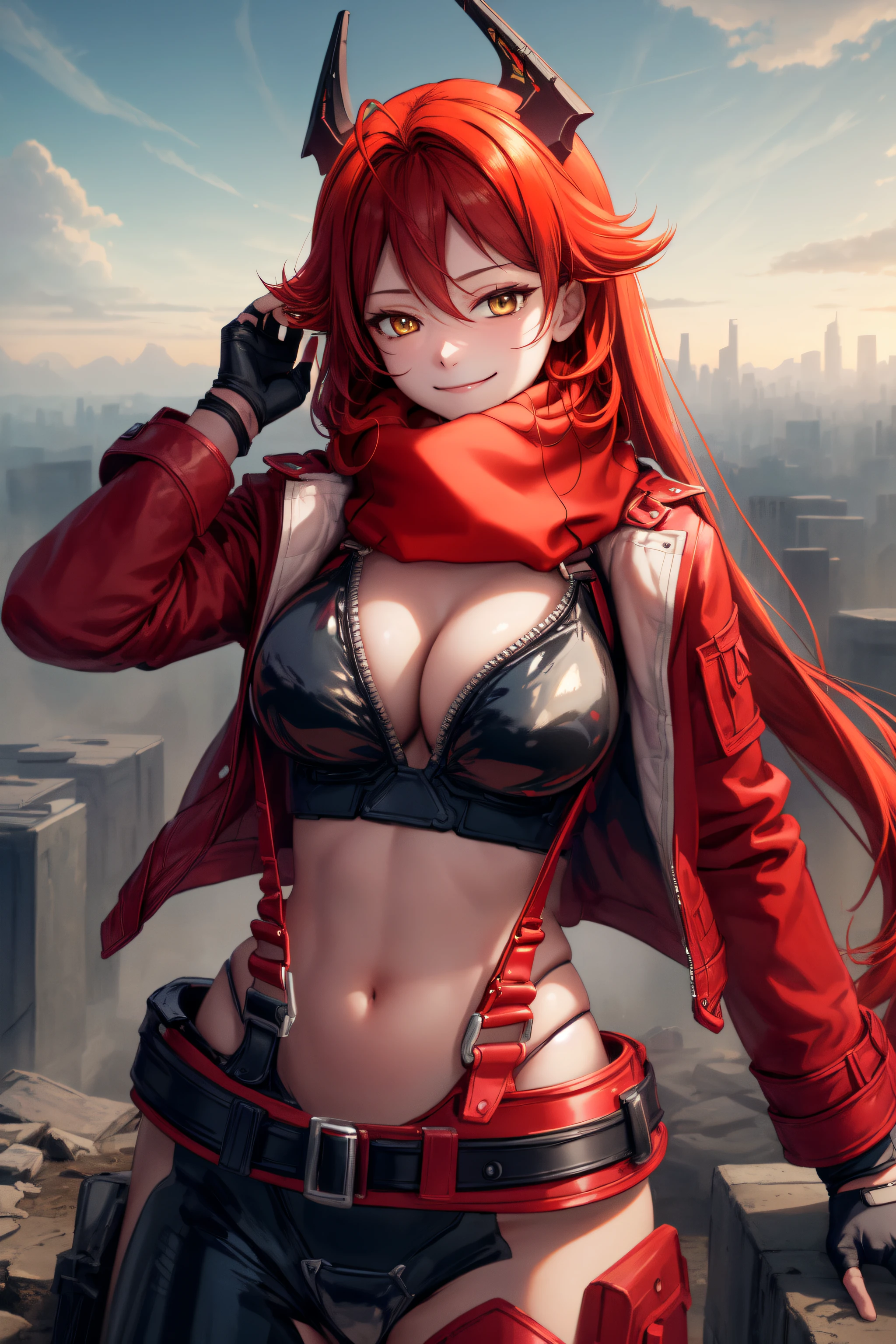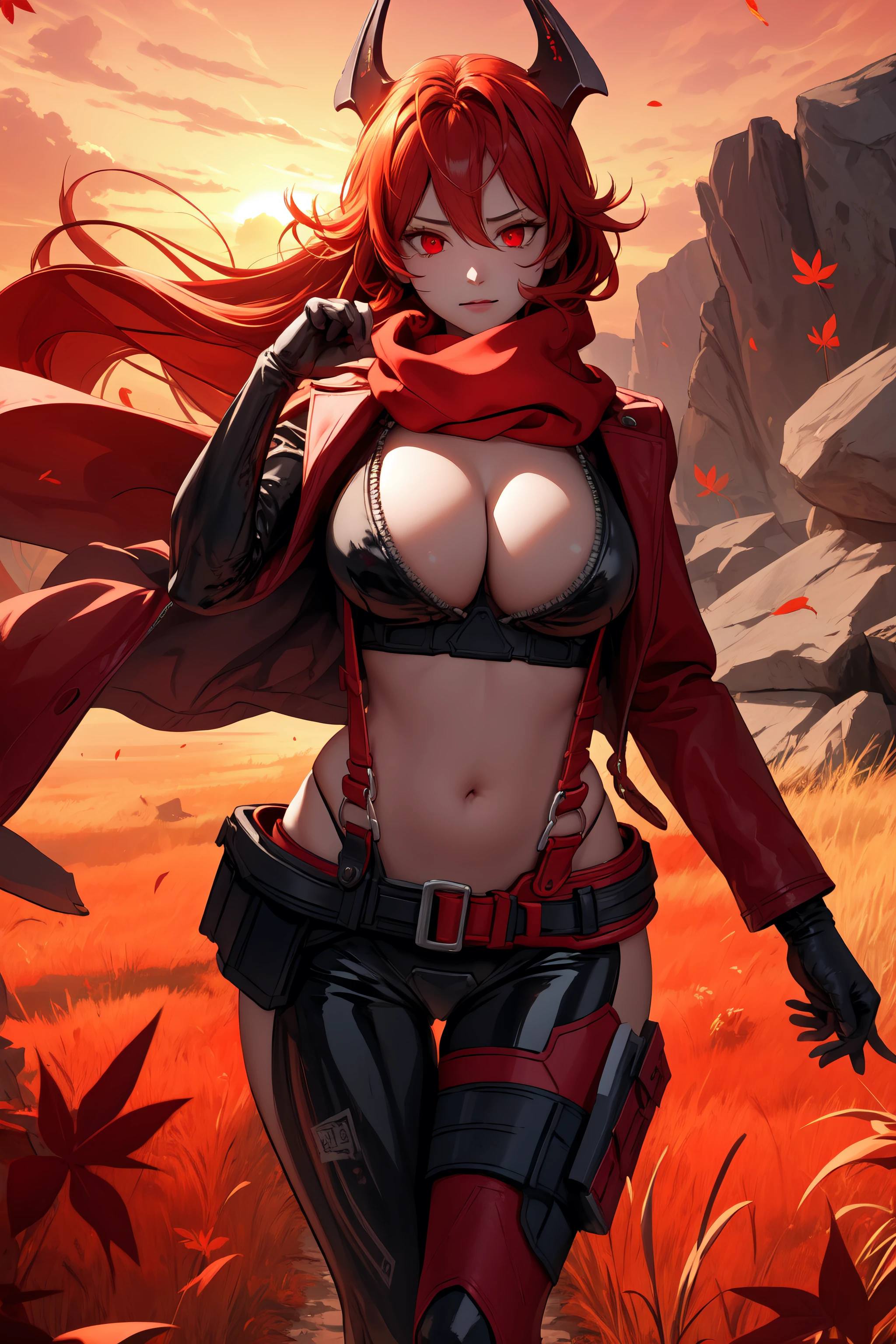 • Outfit - red jacket, cropped jacket, red scarf, unzipped bodysuit, suspenders, black pants, belt, fingerless gloves, asymmetrical legwear, hip vent, midriff, high heel boots