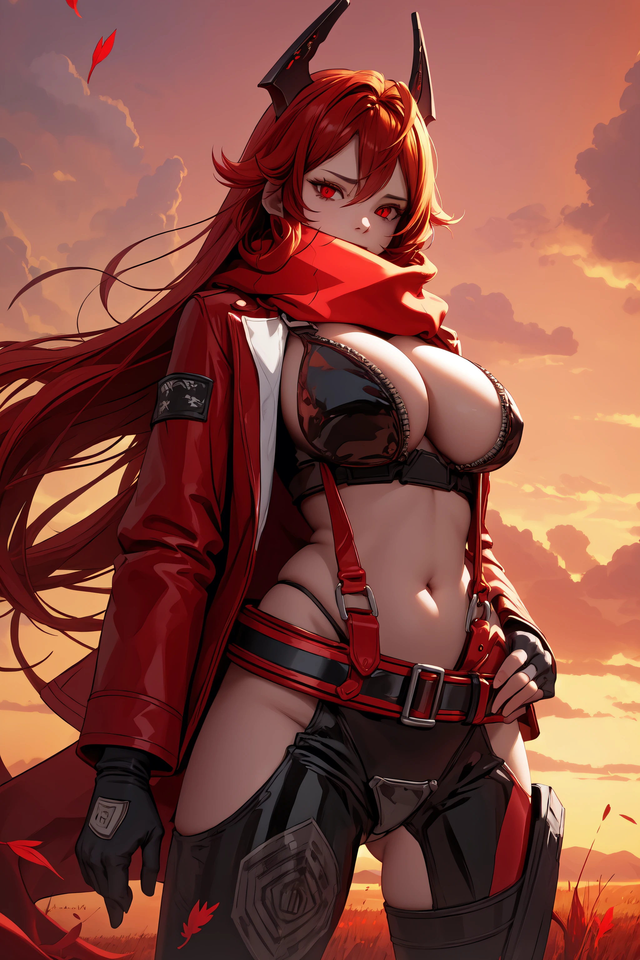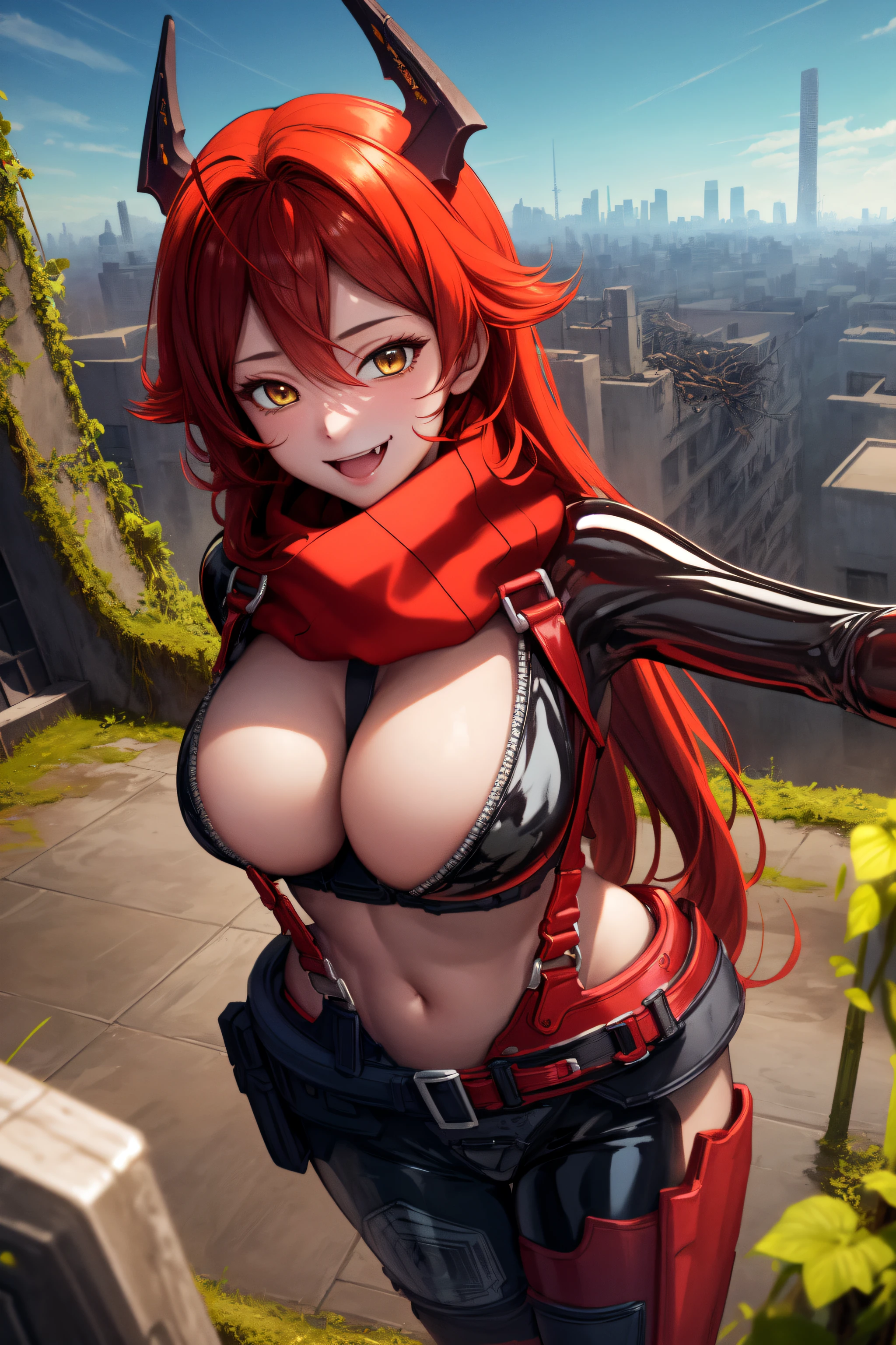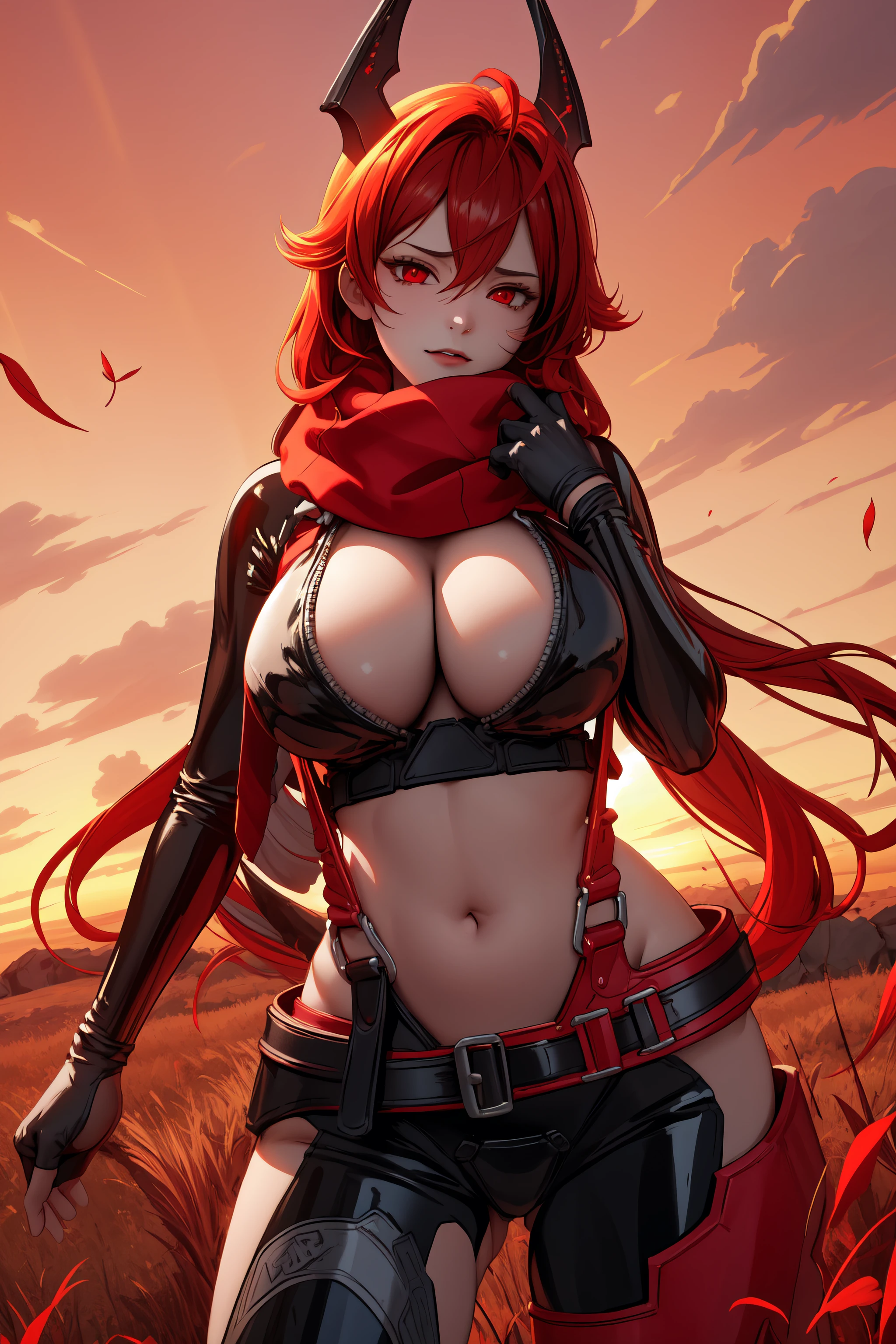 • Outfit - red jacket, cropped jacket, red scarf, unzipped bodysuit, suspenders, black pants, belt, fingerless gloves, asymmetrical legwear, hip vent, midriff, high heel boots