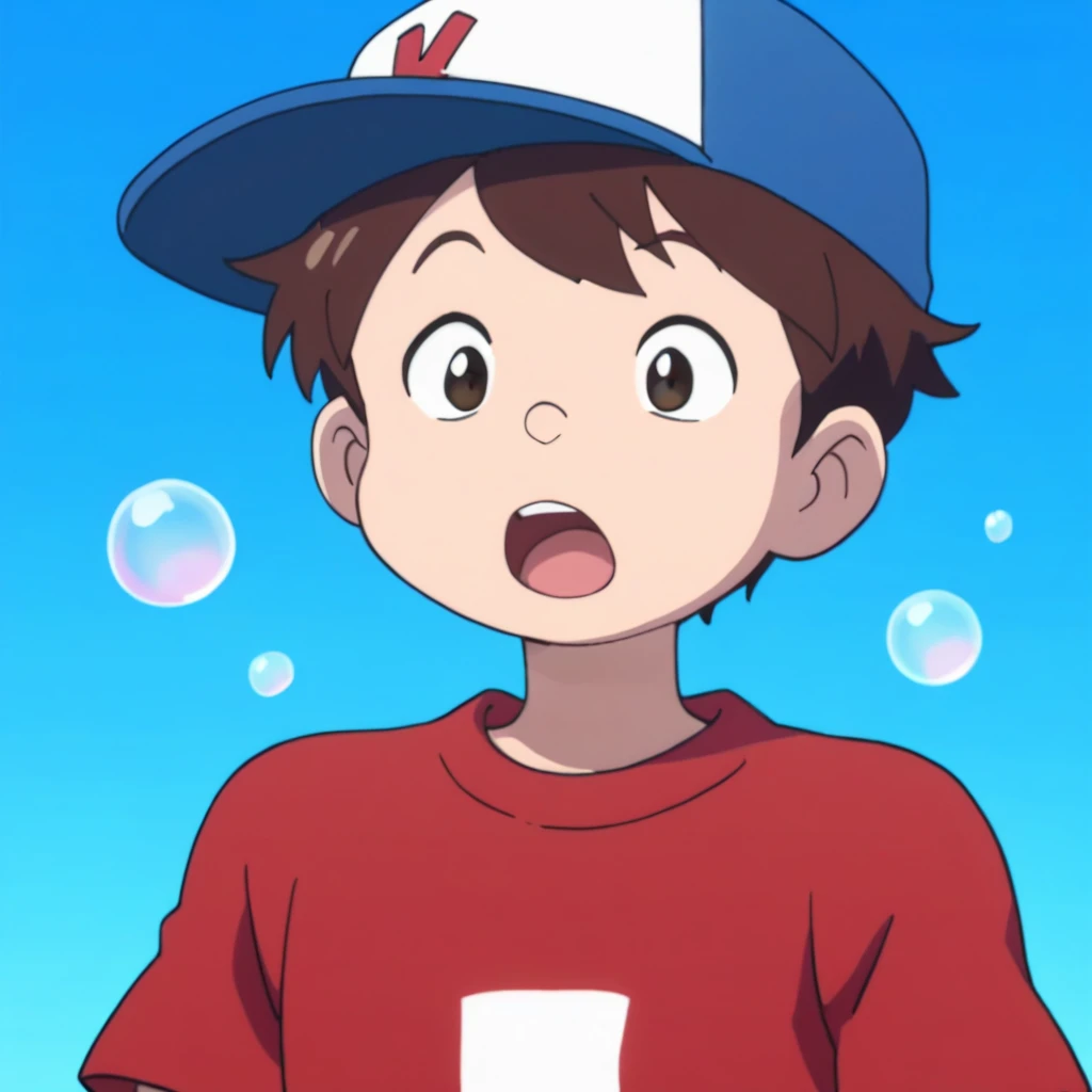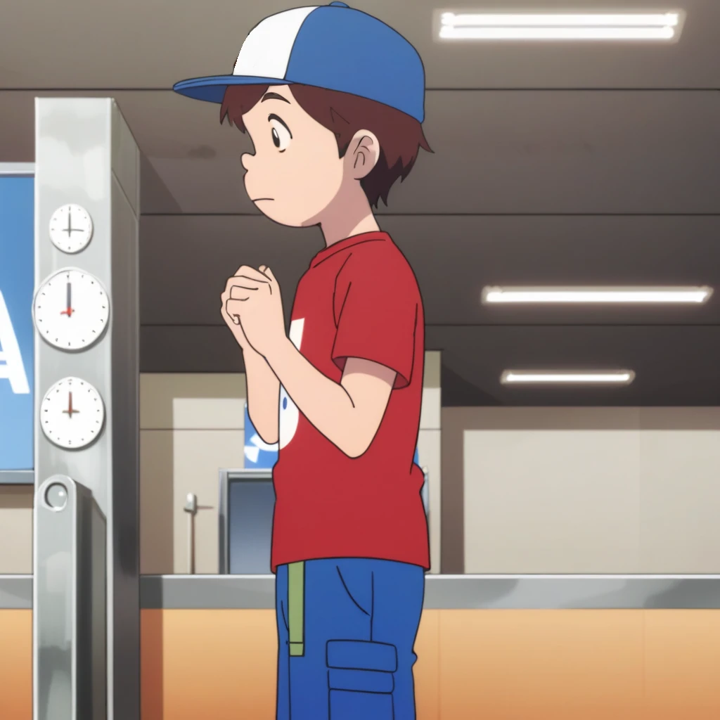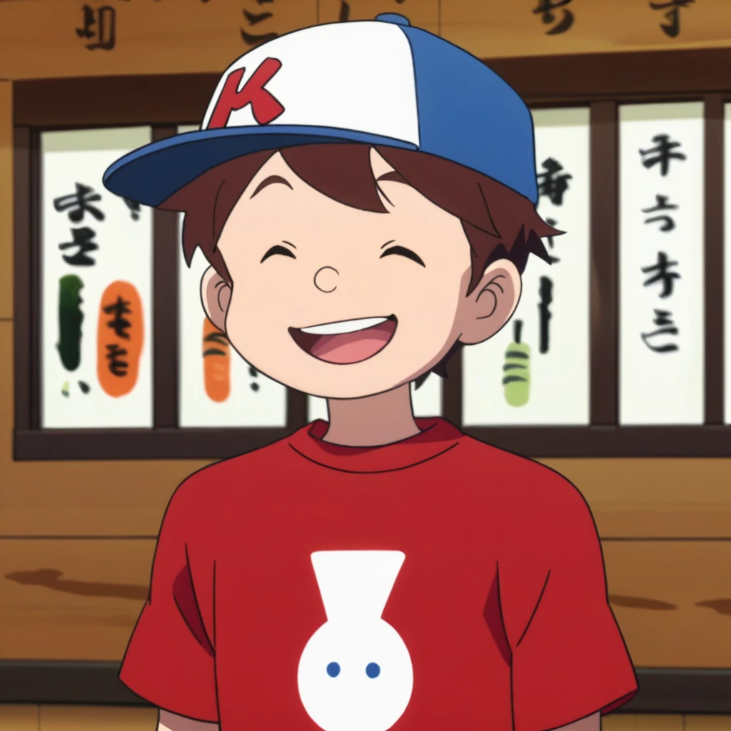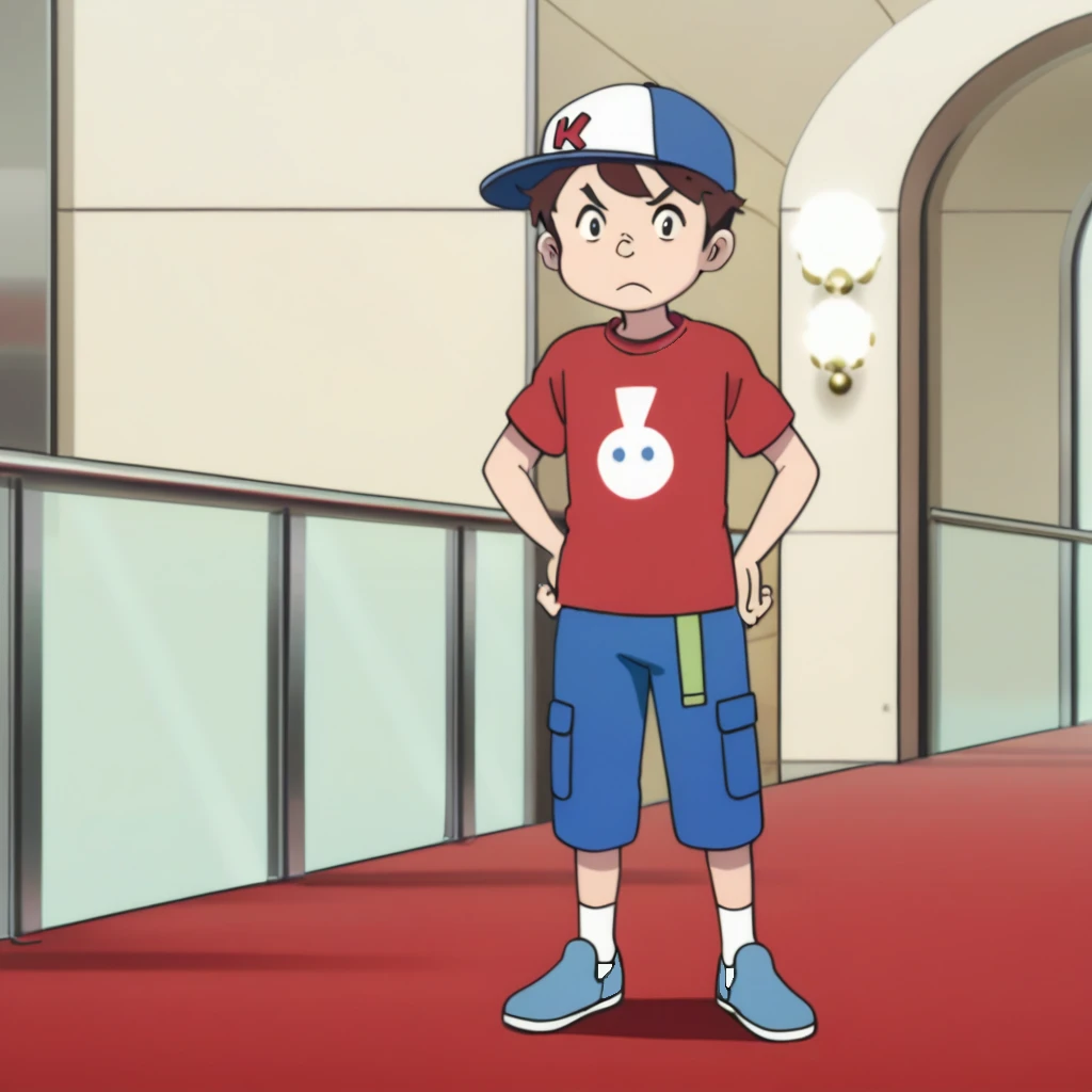 Prompts: male, brown hair, baseball cap, black eyes, red shirt, print shirt, short sleeves, shorts, white socks, light blue footwear
