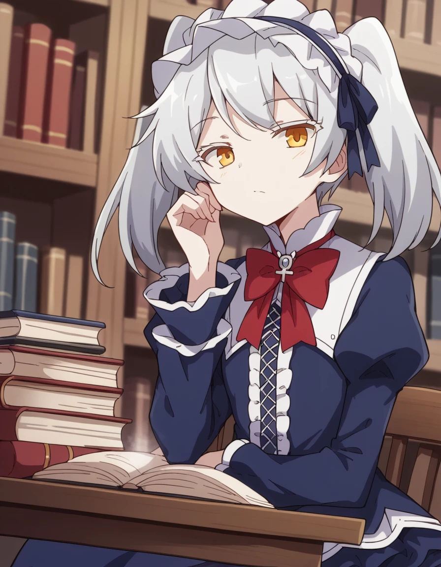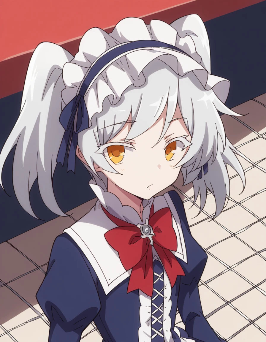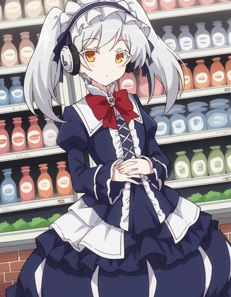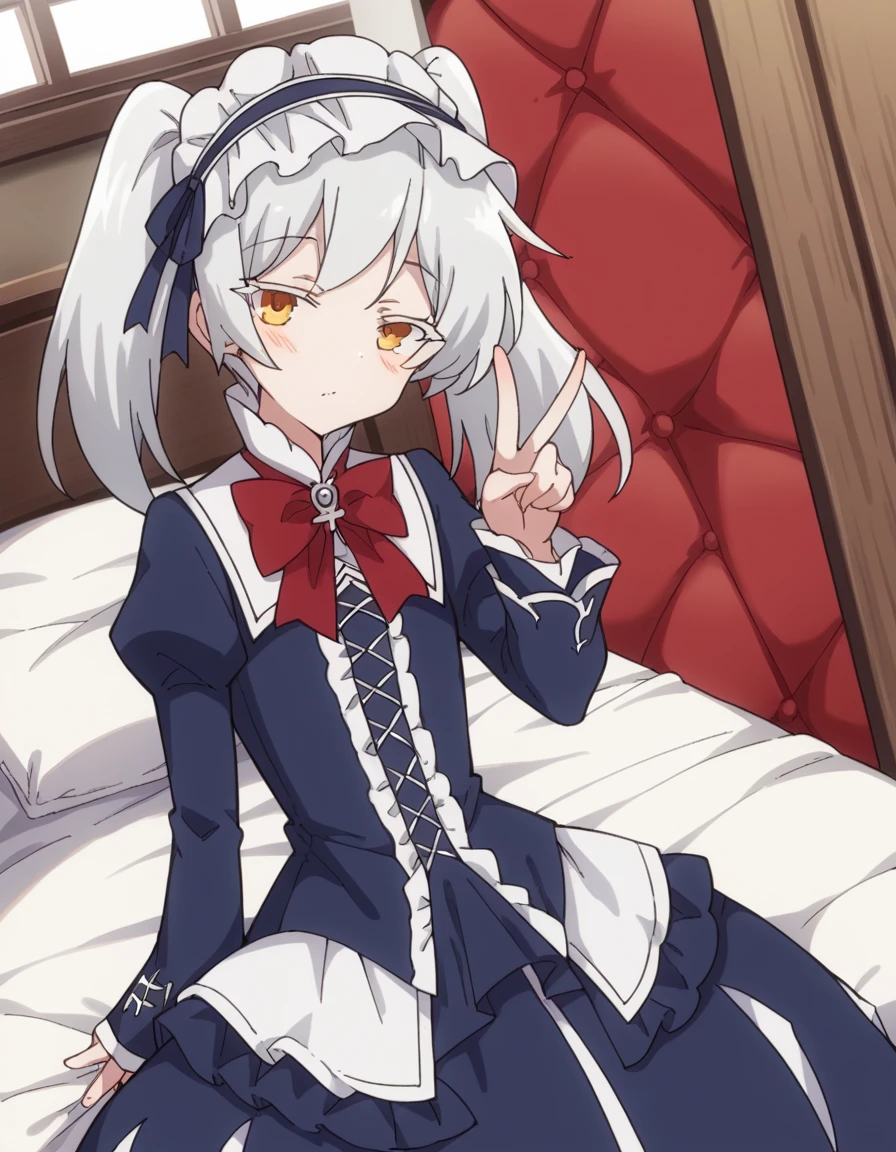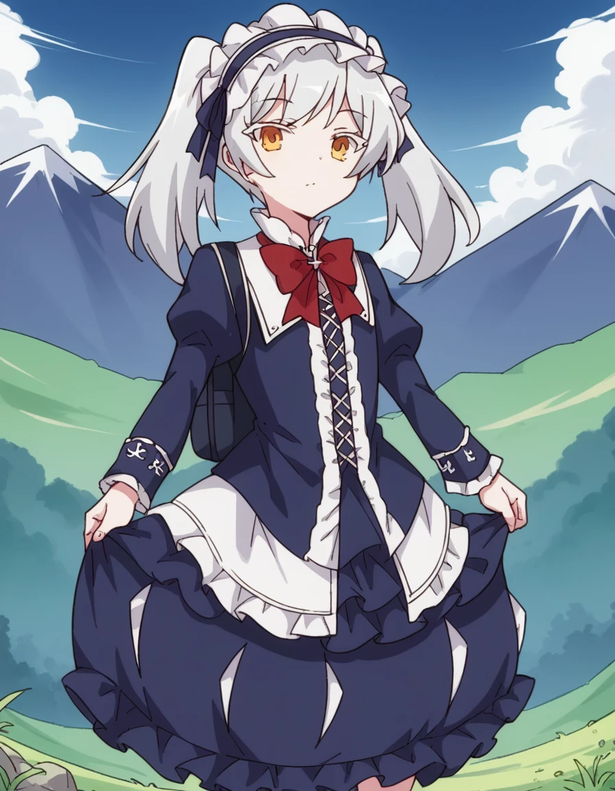 dress, blue dress, long sleeves, frilled dress, red bowtie, puffy sleeves, frilled skirt, skirt, blue skirt, headdress, frille headdress,