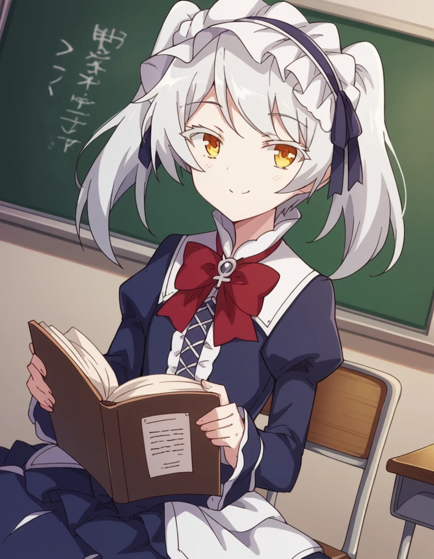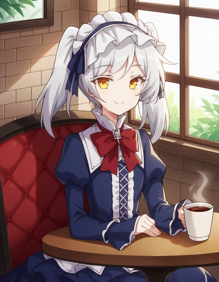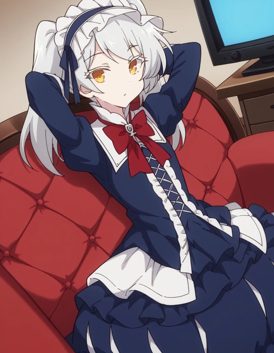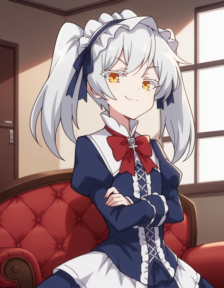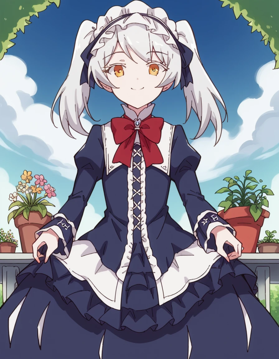dress, blue dress, long sleeves, frilled dress, red bowtie, puffy sleeves, frilled skirt, skirt, blue skirt, headdress, frille headdress,