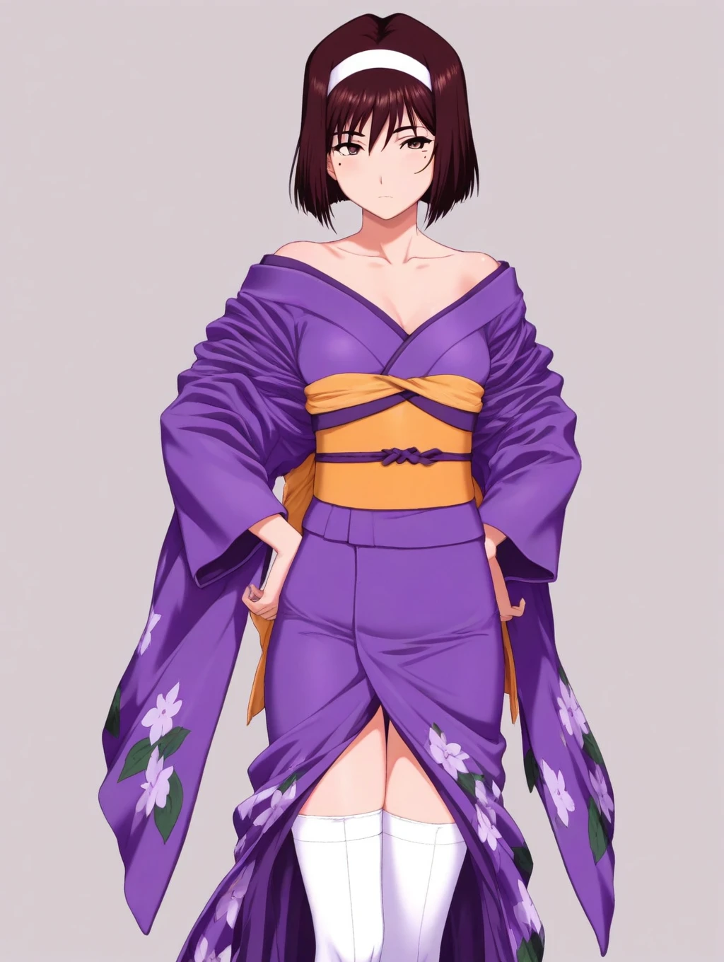 japanese clothes, kimono, hand fan, purple kimono, obi,white thighhighs,off shoulder